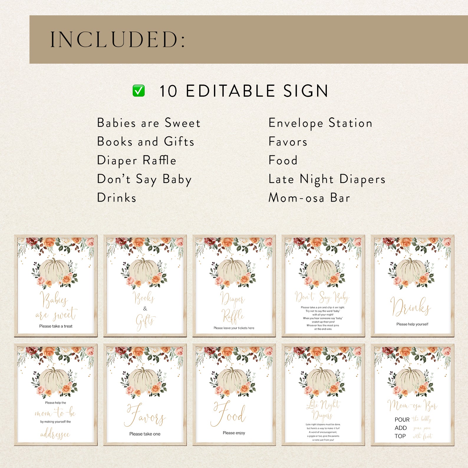 Add a touch of elegance to your fall baby shower with this set of 10 editable table signs. Each sign features a soft watercolor pumpkin, blush and peach roses, and lush greenery framed with golden shimmer accents. Designed for key stations like “Mom-osa Bar” and “Babies Are Sweet,” these signs keep your celebration stylish and cohesive with autumnal charm and floral sophistication.