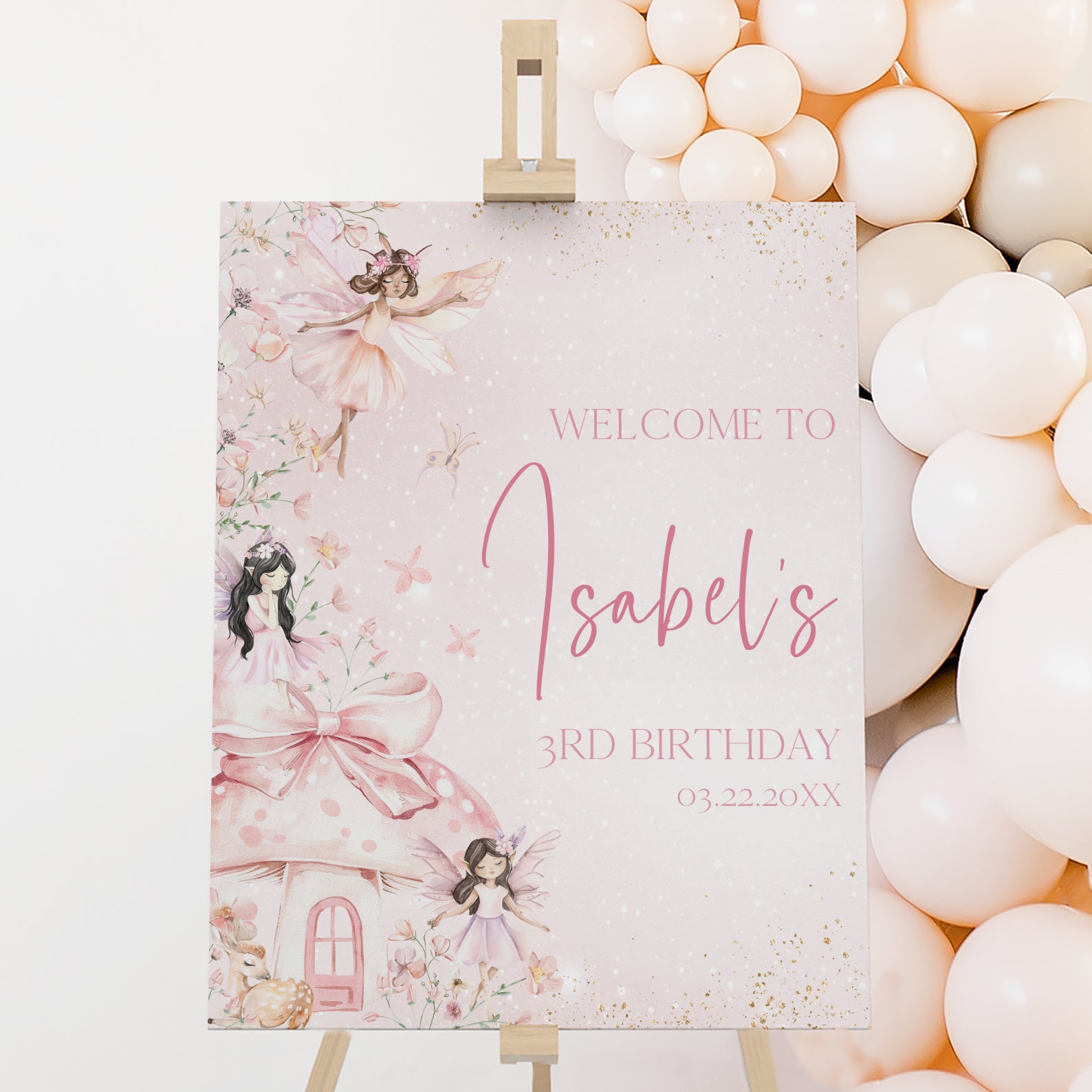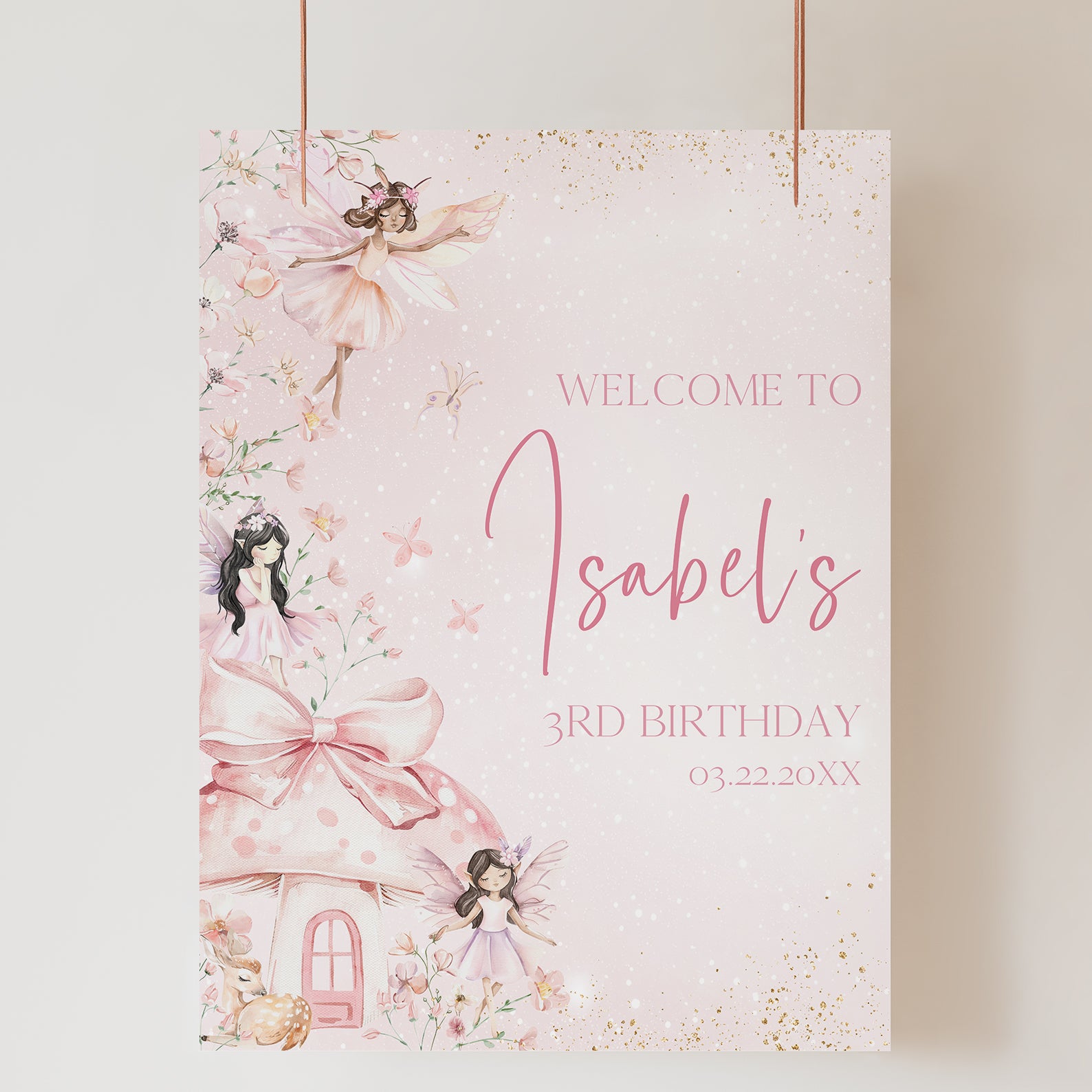 Welcome guests to a magical celebration with this charming fairy-themed birthday welcome sign! Designed with a soft pink background, it features delicate florals on the left, playful flying fairies, and a whimsical mushroom house at the bottom tied with a dainty ribbon. Elegant gold accents frame the design, adding a touch of enchantment and warmth to your event. Perfect for setting the tone of a joyful and imaginative gathering, this sign is a beautiful way to greet friends and family as they step into a world of wonder!