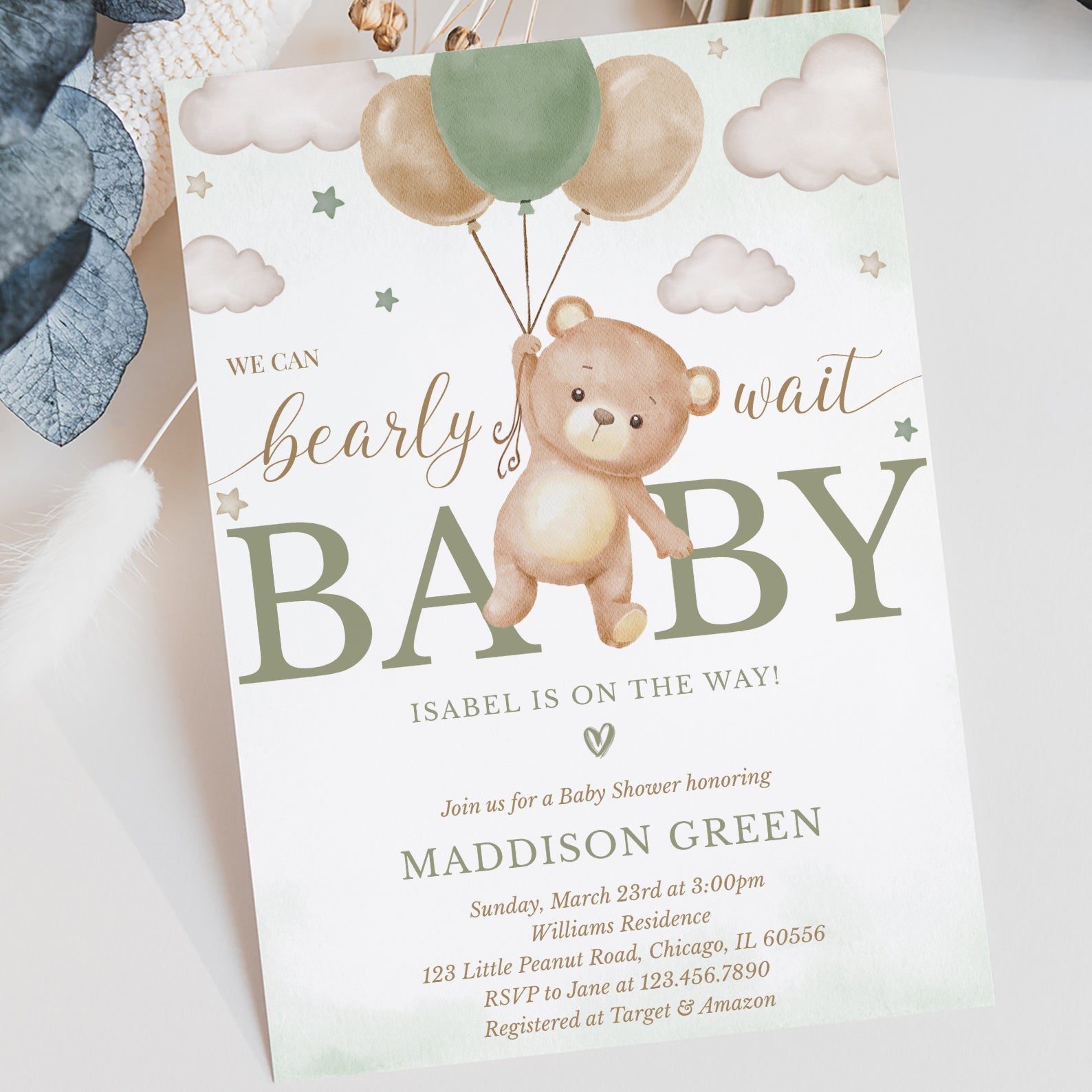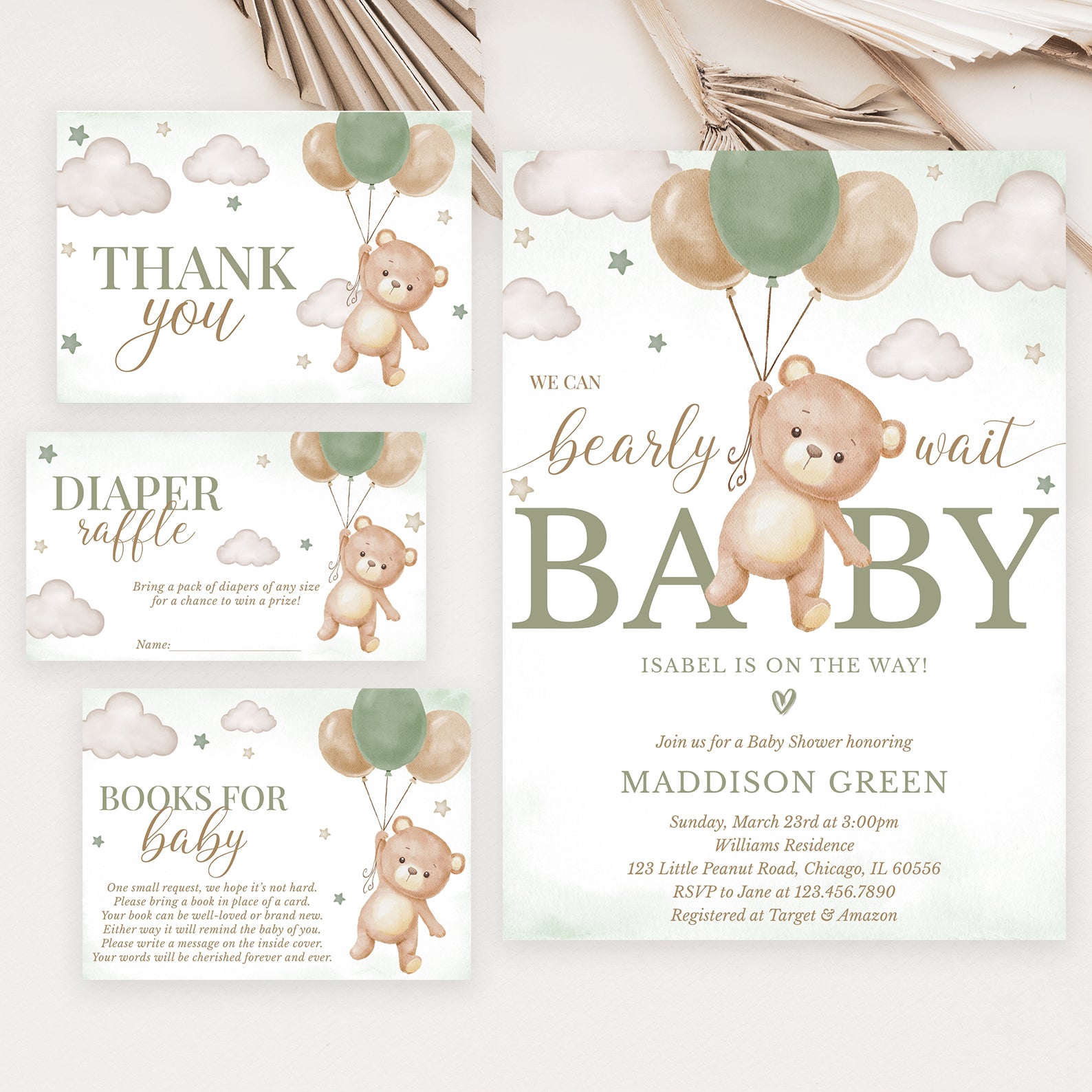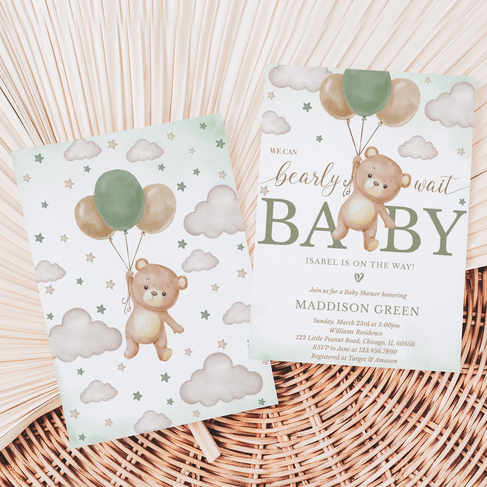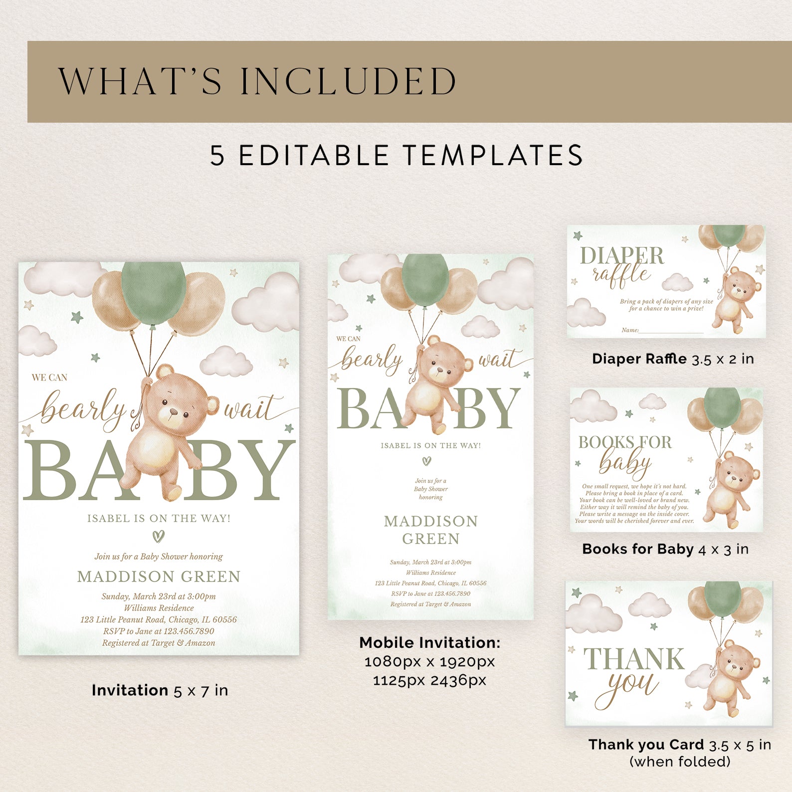 Celebrate your little one with our "We Can Bearly Wait" baby shower bundle! Featuring a flying teddy bear holding a balloon, stars, and clouds, this sweet design comes in green, brown, blue, or pink. Includes a digital invitation, mobile invite, diaper raffle, books for baby, and thank you card—everything you need for a memorable shower!