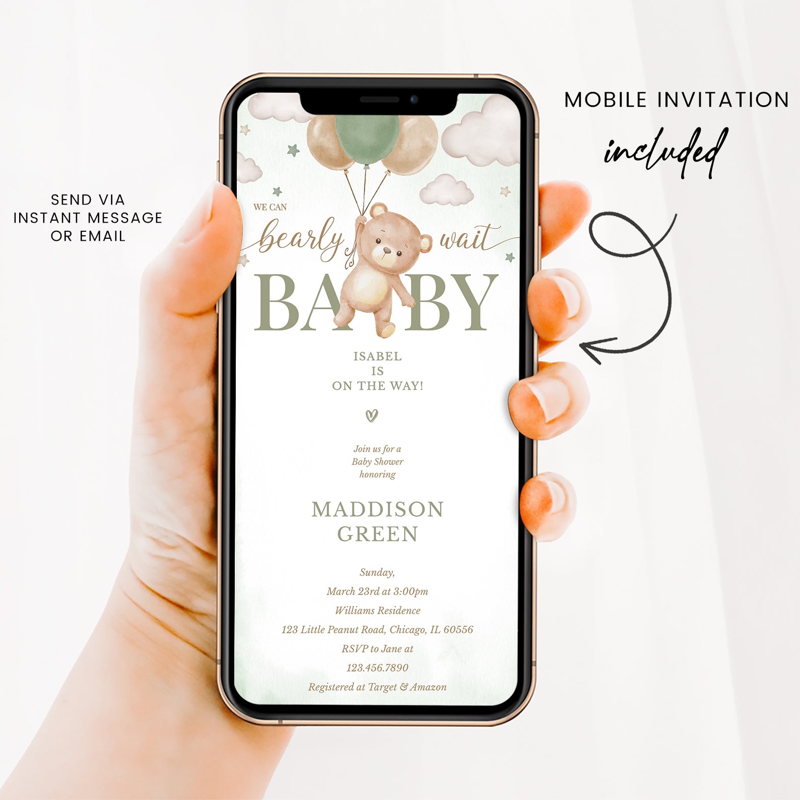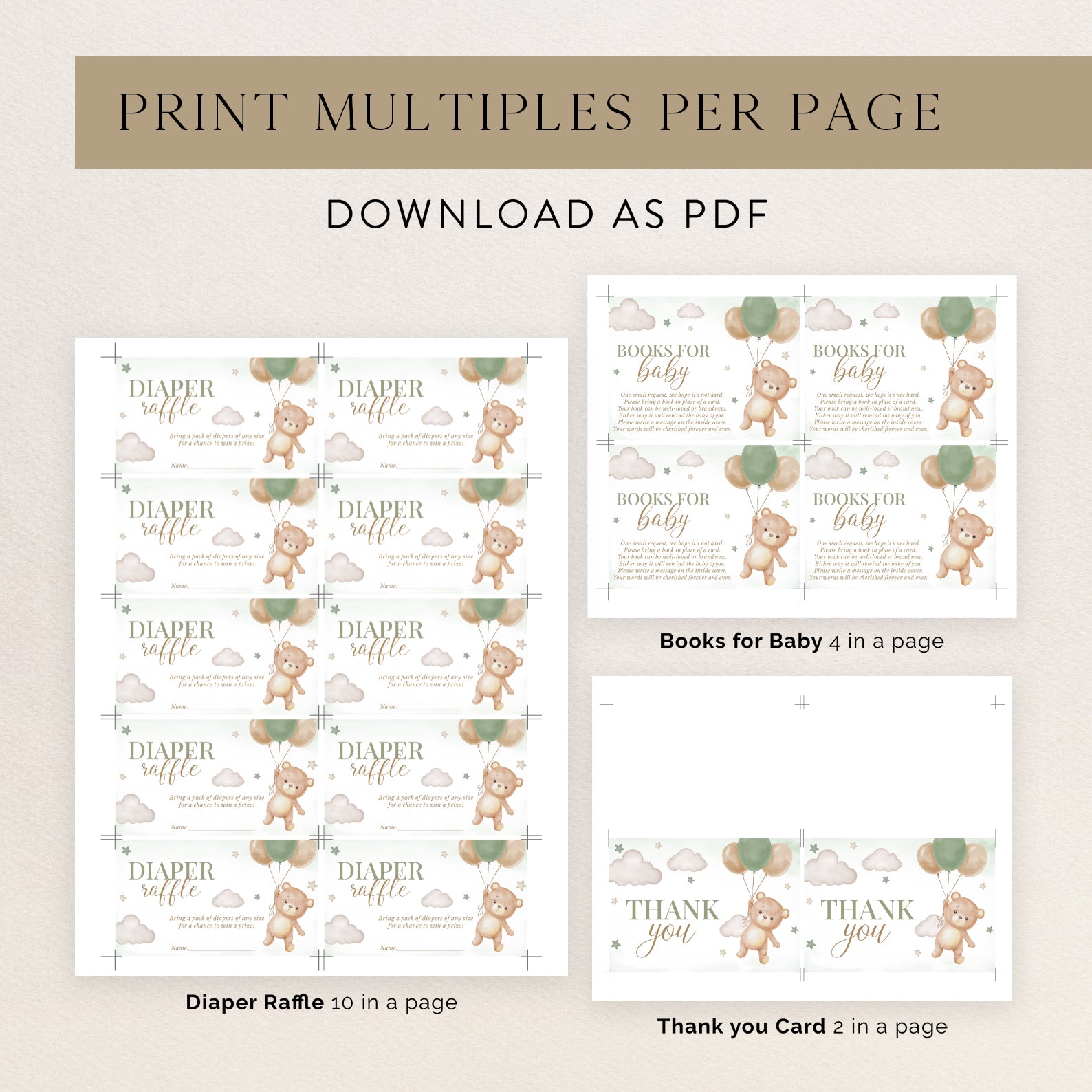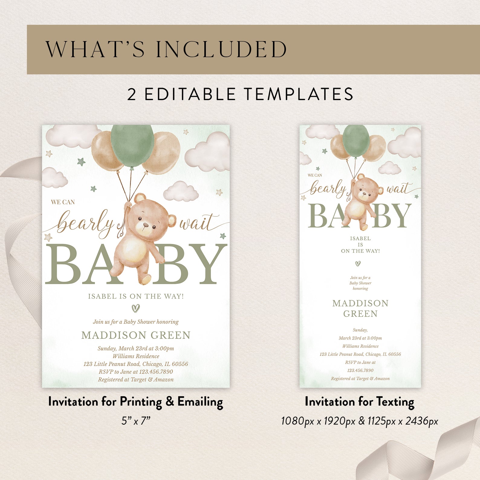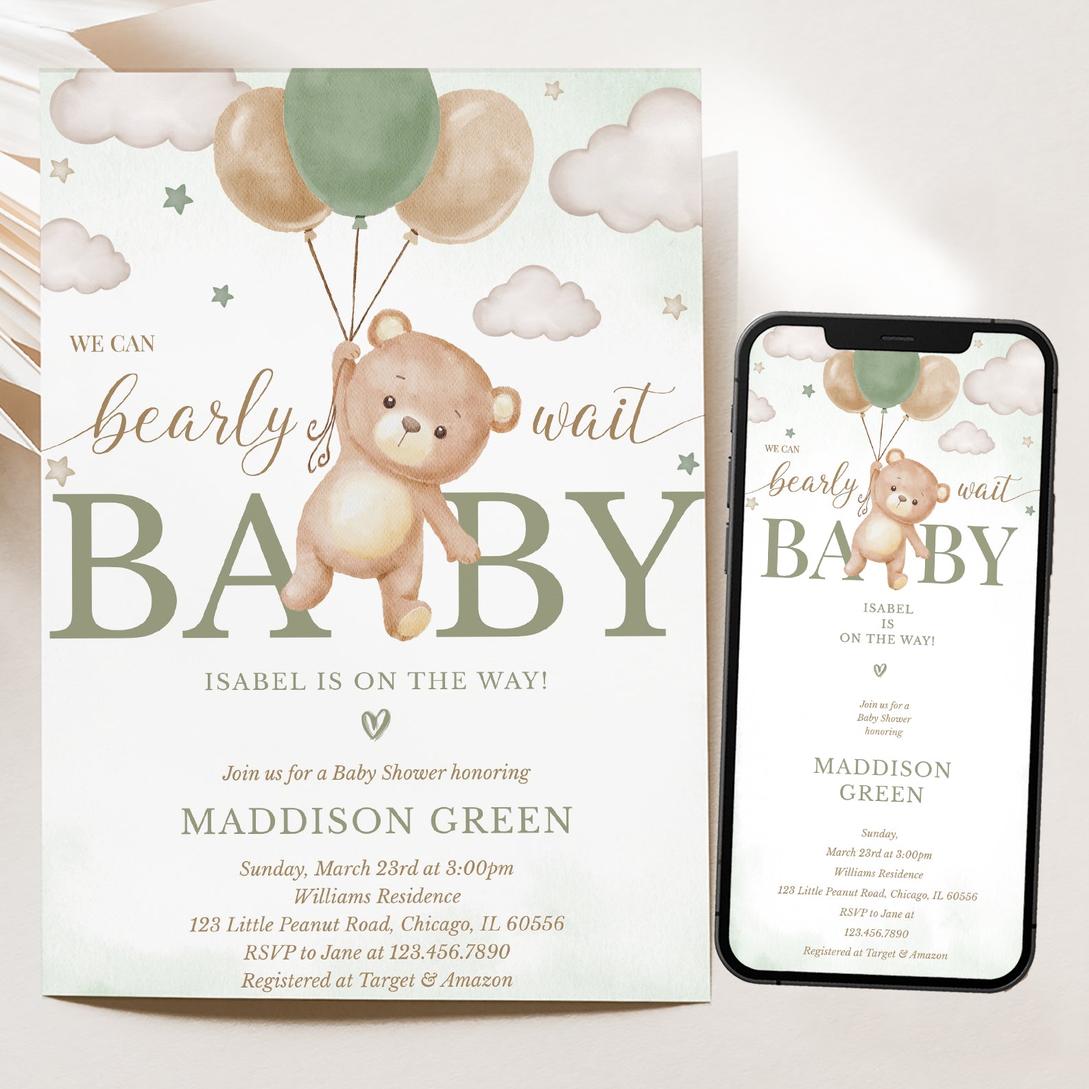 Celebrate your little one with our "We Can Bearly Wait" baby shower bundle! Featuring a flying teddy bear holding a balloon, stars, and clouds, this sweet design comes in green, brown, blue, or pink. Includes a digital invitation, mobile invite, diaper raffle, books for baby, and thank you card—everything you need for a memorable shower!