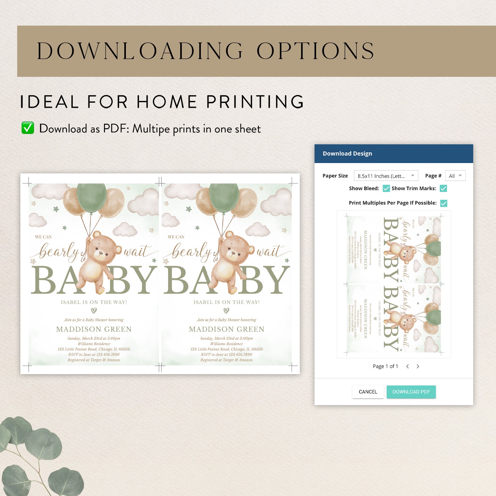 1. Purchase this Flying Teddy Bear Green Baby Shower Invite Bundle: We Can Bearly Wait template