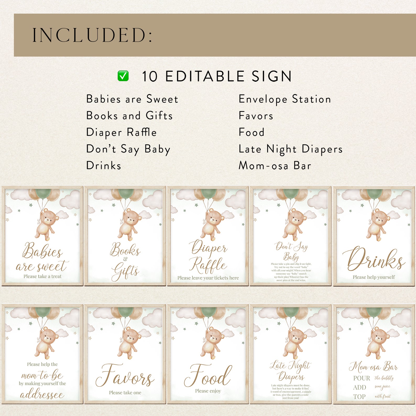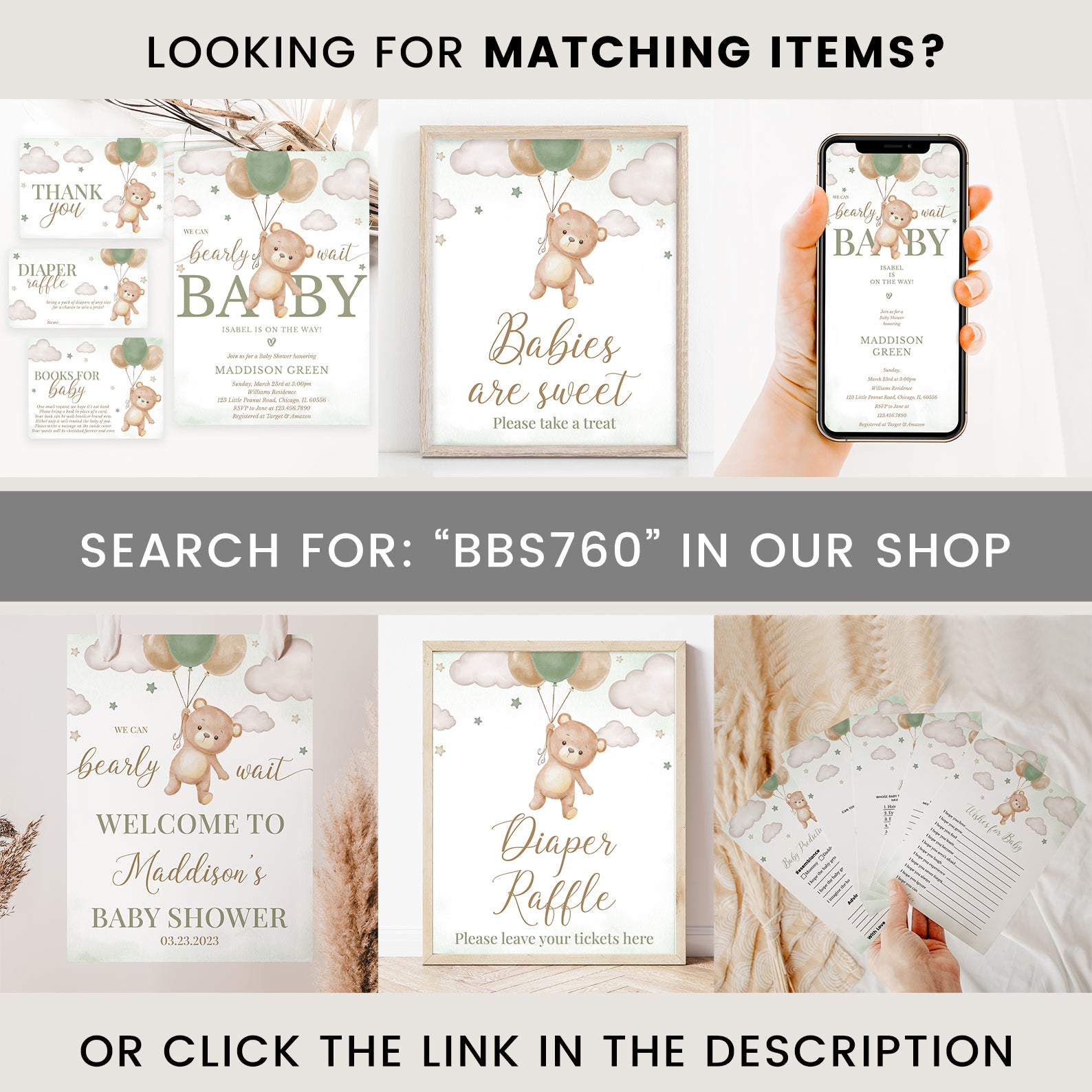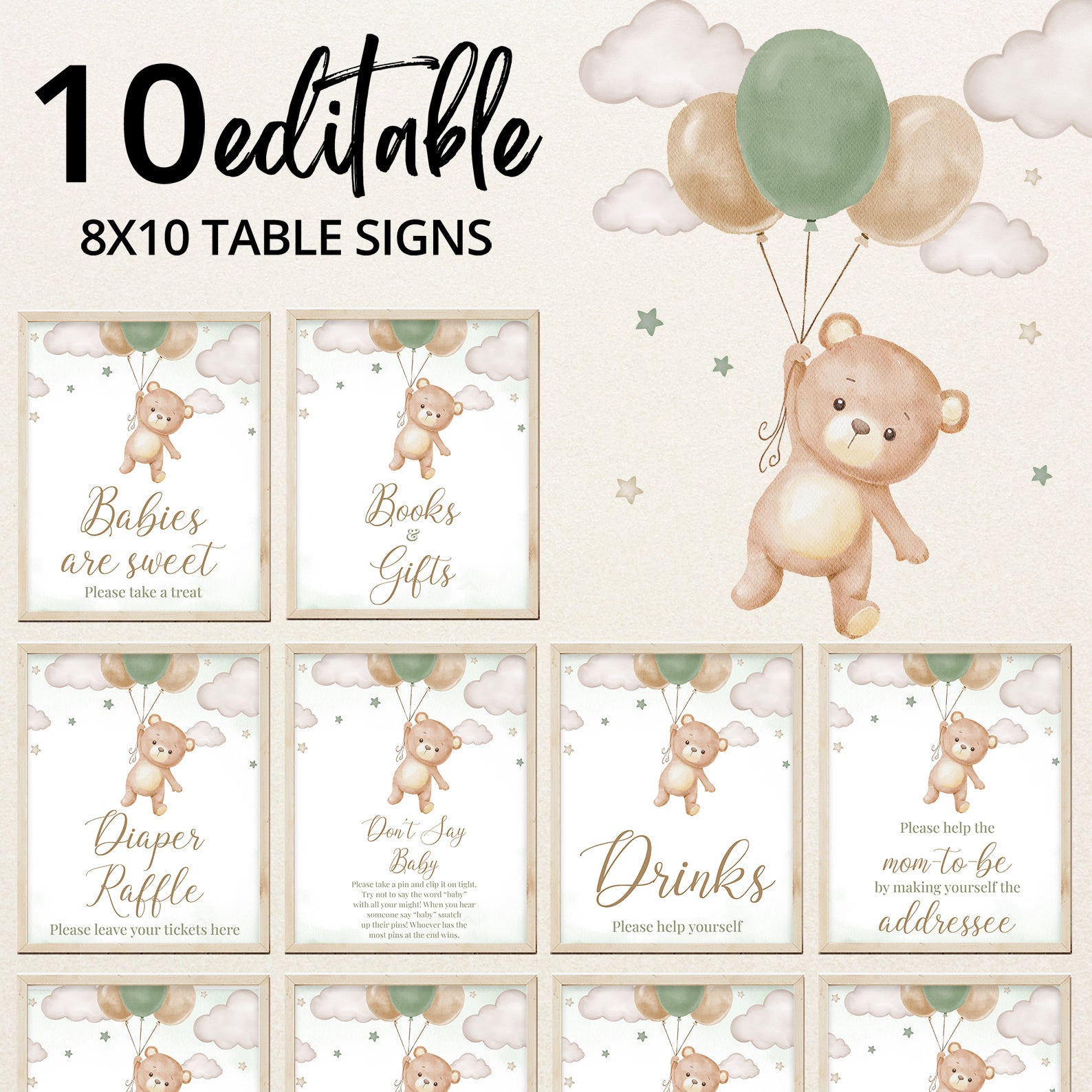 Add a whimsical touch to your baby shower with our charming "We Can Bearly Wait" table signs! Featuring an adorable teddy bear floating with a balloon, surrounded by fluffy clouds and twinkling stars, these signs are available in green, brown, blue, or pink to match your theme. This editable set of 10 includes Babies Are Sweet, Books and Gifts, Diaper Raffle, Don’t Say Baby, Drinks, Envelope Station, Favors, Food, Late Night Diapers, and Mom-osa Bar. Perfect for tying your event together with style and sweetness!