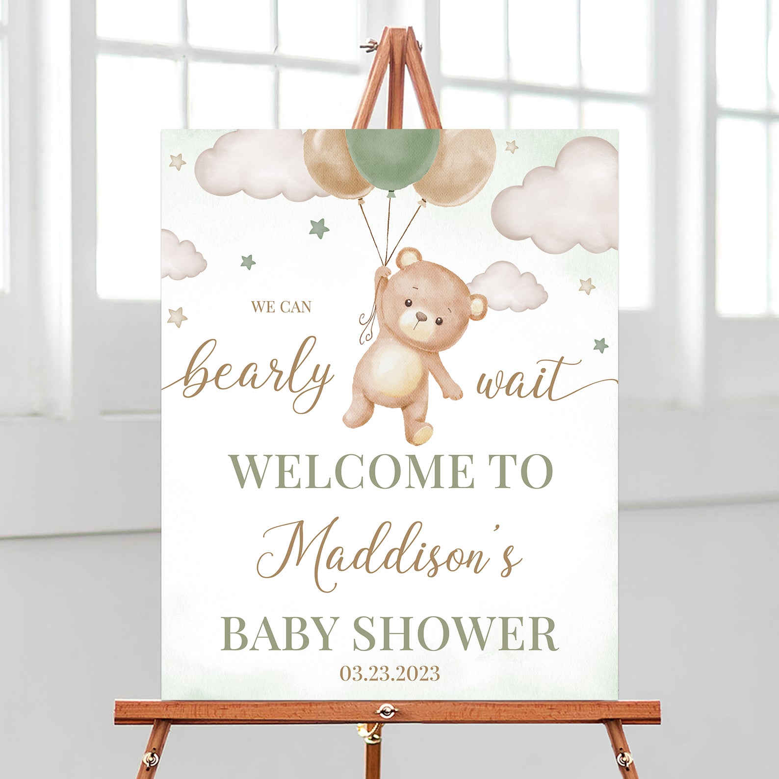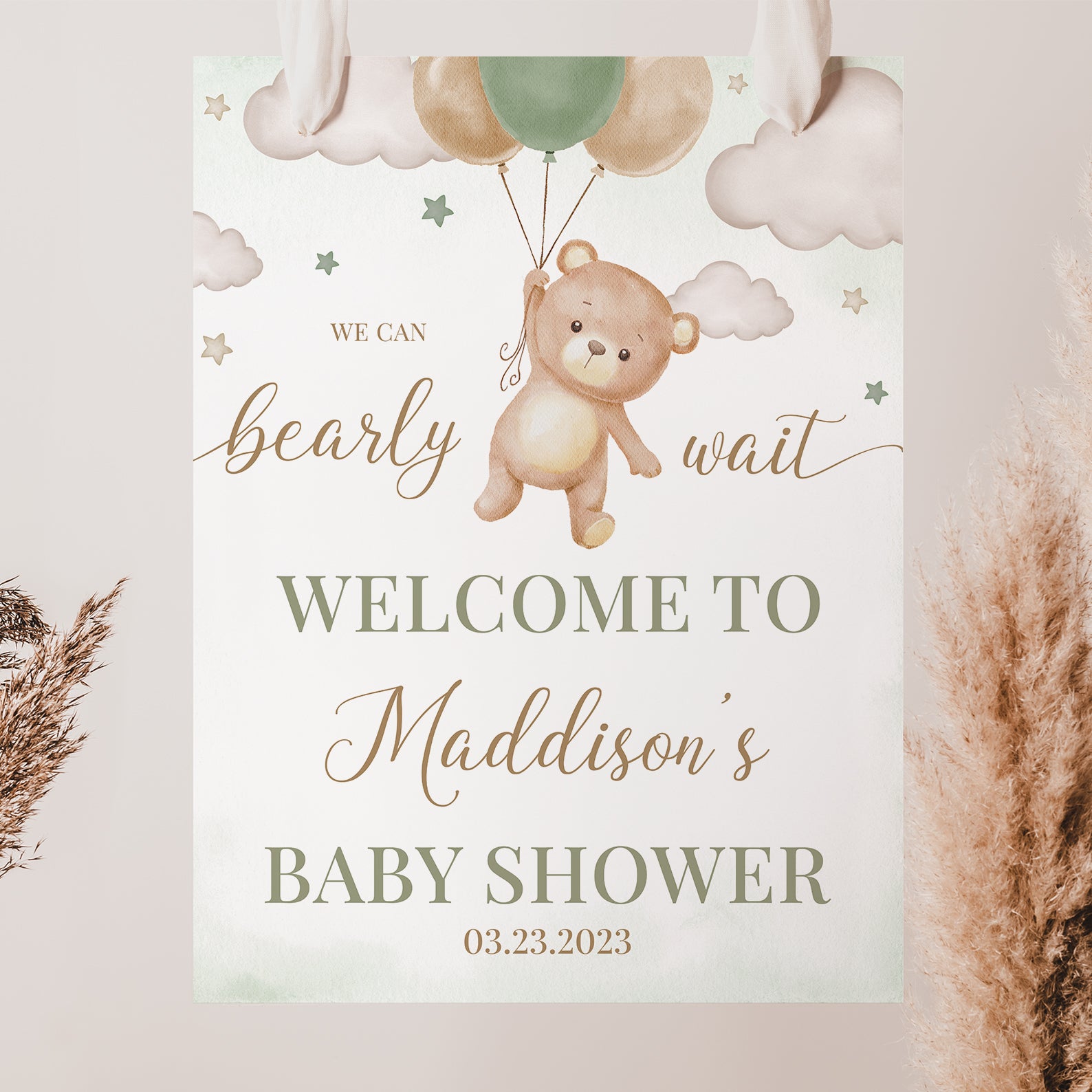 - Purchase this Flying Teddy Bear Green Baby Shower Welcome Sign: We Can Bearly Wait template