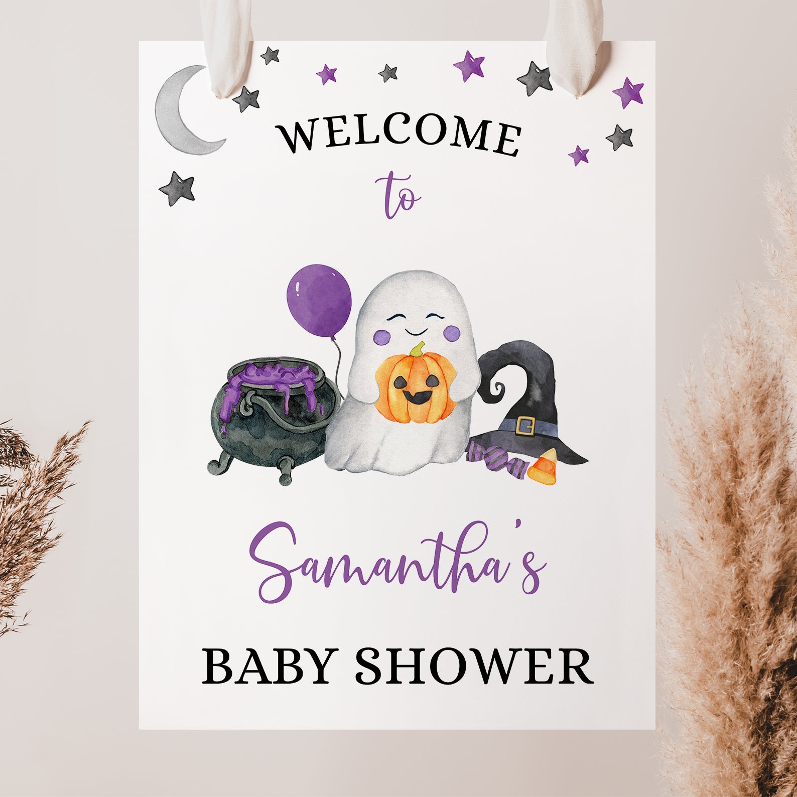 - Purchase this Halloween Baby Shower Welcome Sign: Charming Smiling Ghost Design template