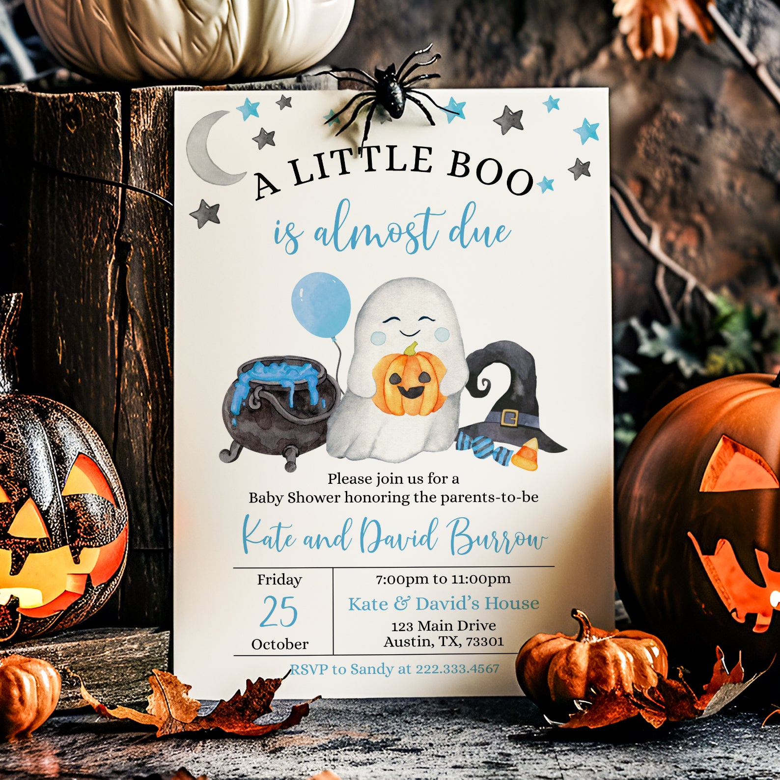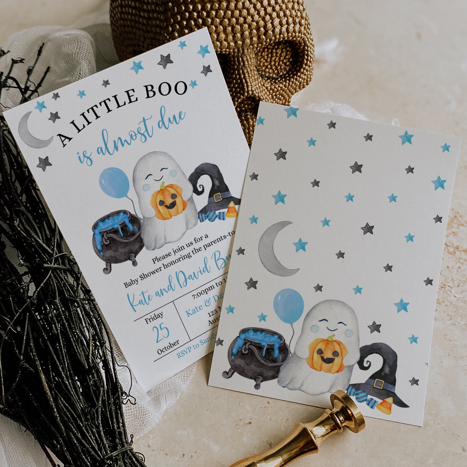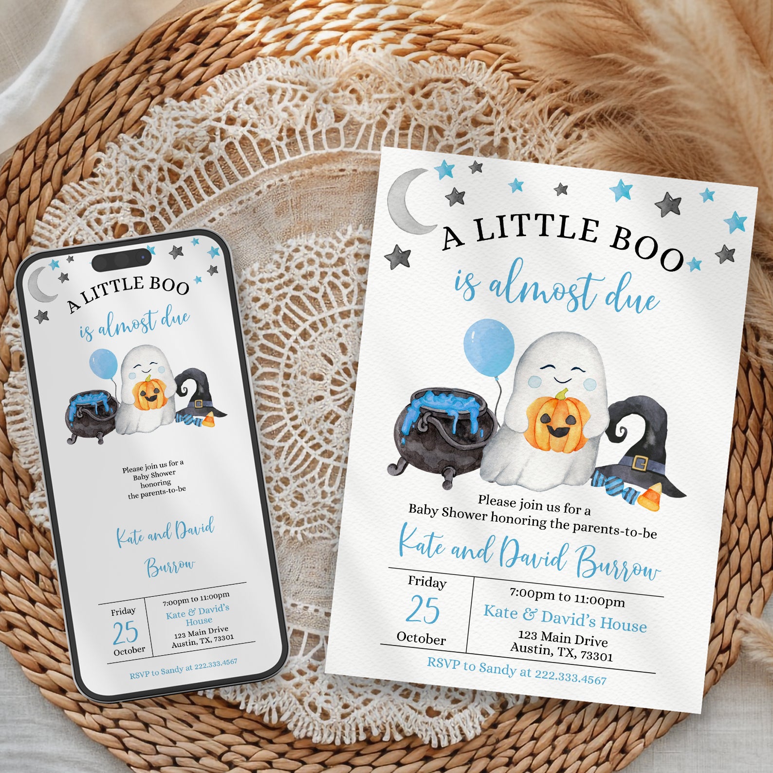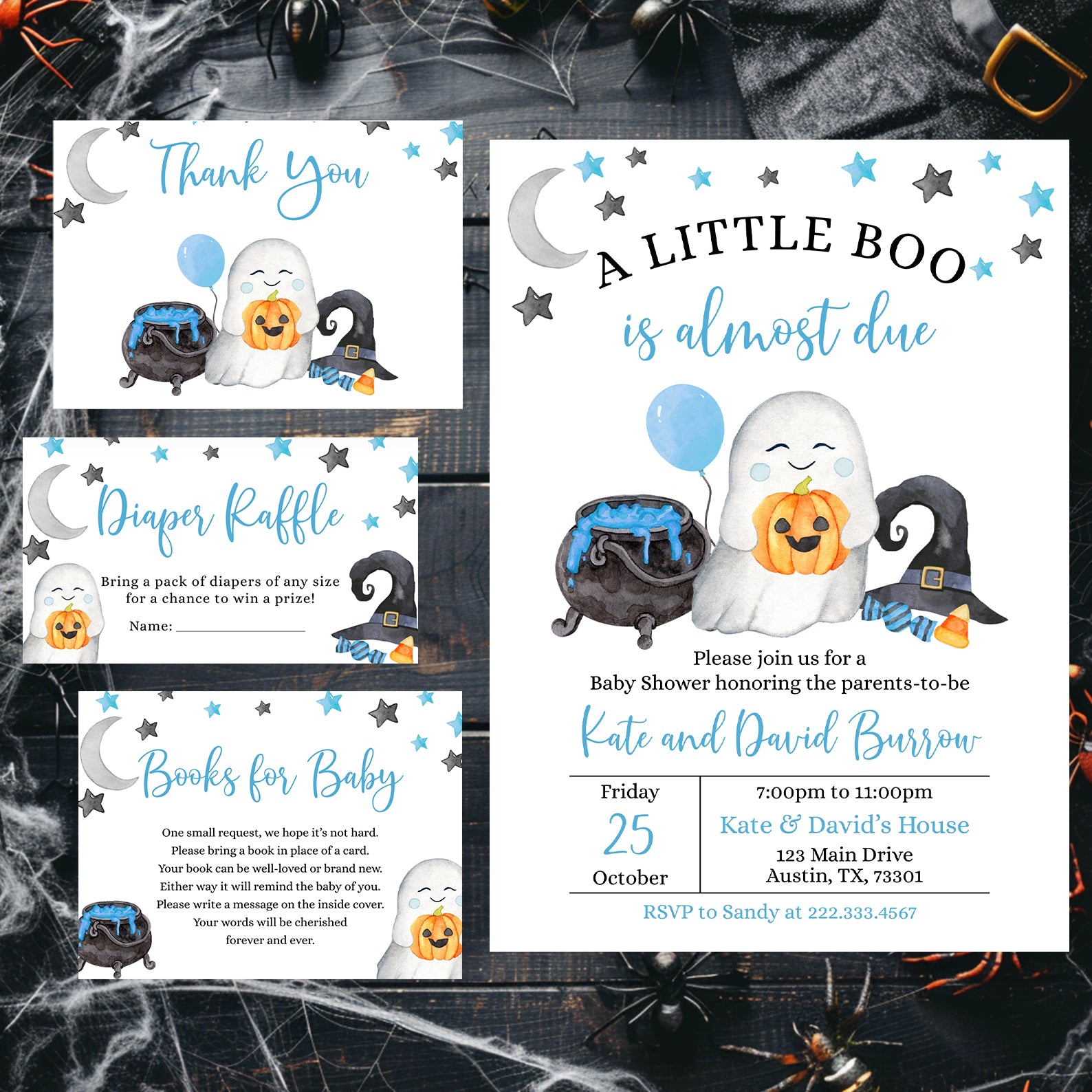 Halloween Blue Baby Shower Invite Bundle: Charming Smiling Ghost Design