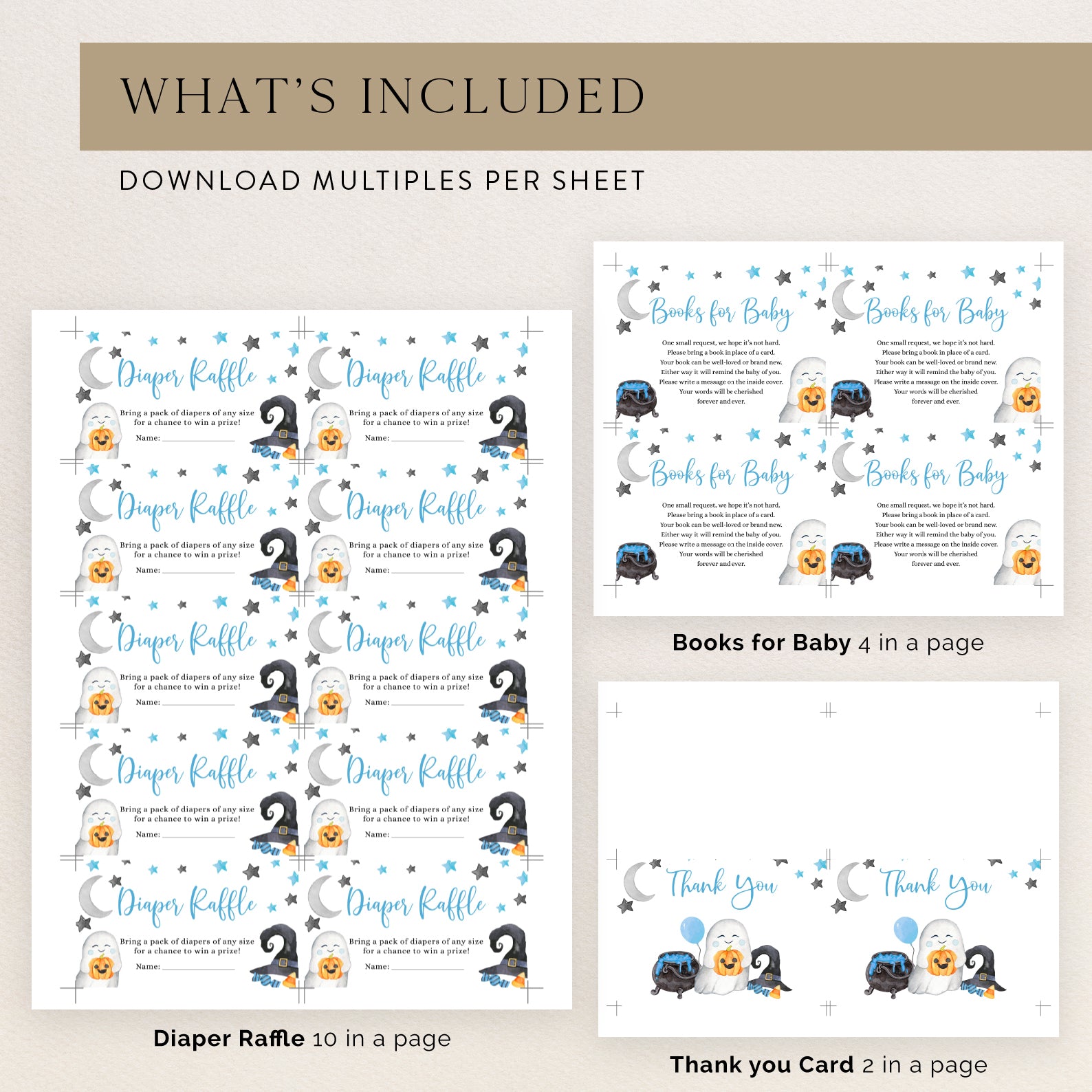 Celebrate your little boo’s arrival with our adorable digital baby shower invitation bundle! Choose from purple, blue, pink, or orange, each featuring charming stars, a grey half moon, and a playful design with a brewing cauldron, a smiling ghost with a pumpkin and balloon, and a witch hat. This set includes an invitation, mobile version, diaper raffle, books for baby, and thank you card, perfect for a spooktacular welcome!