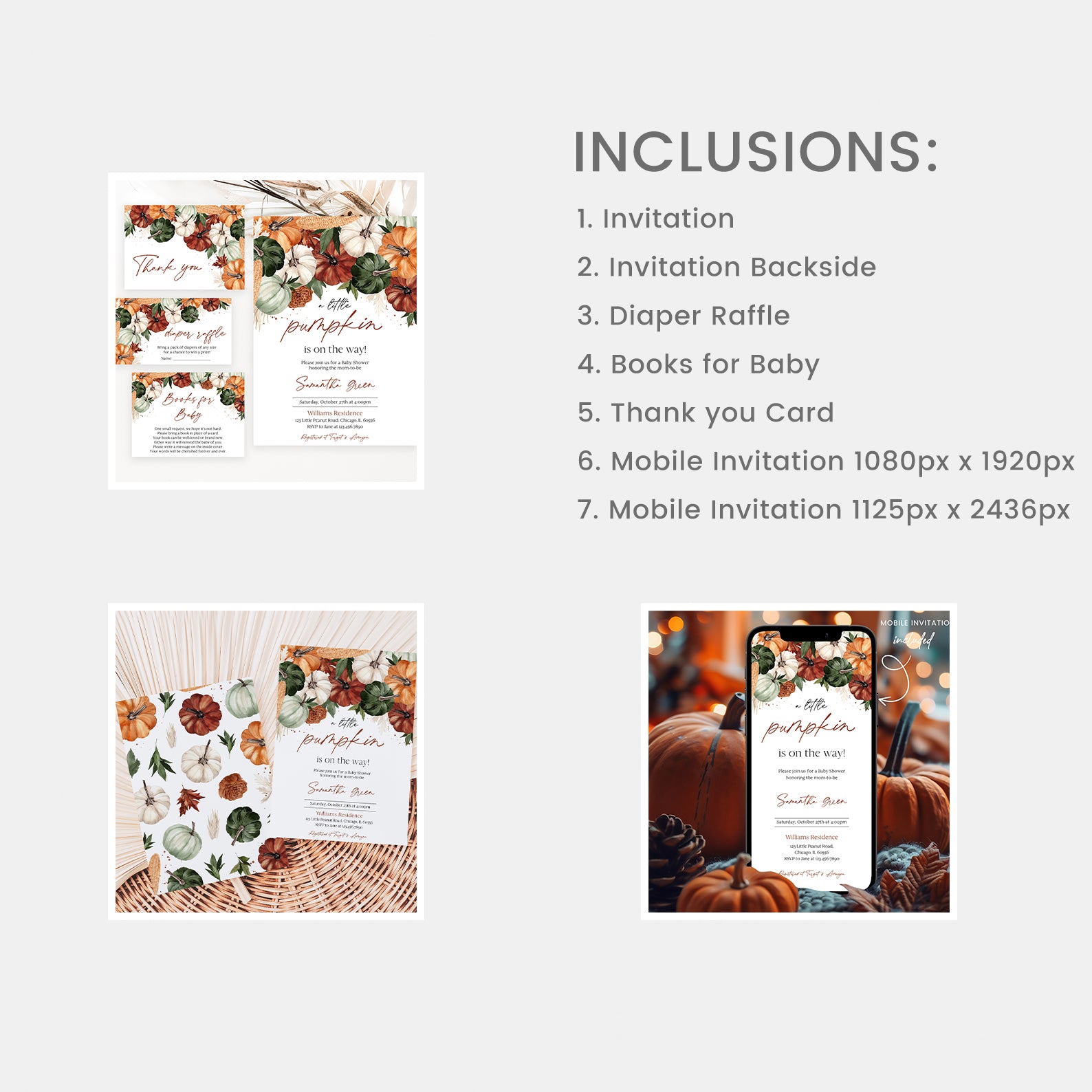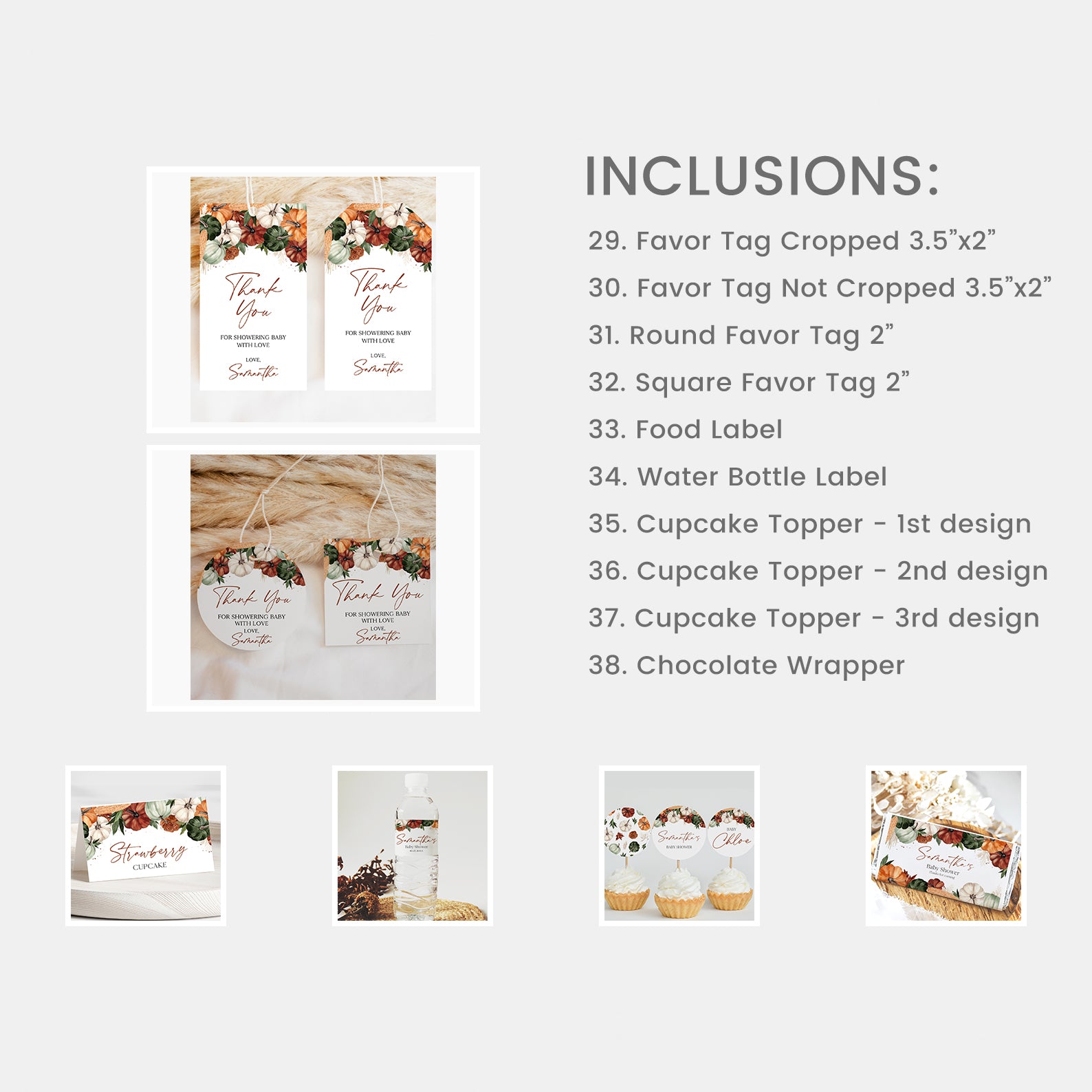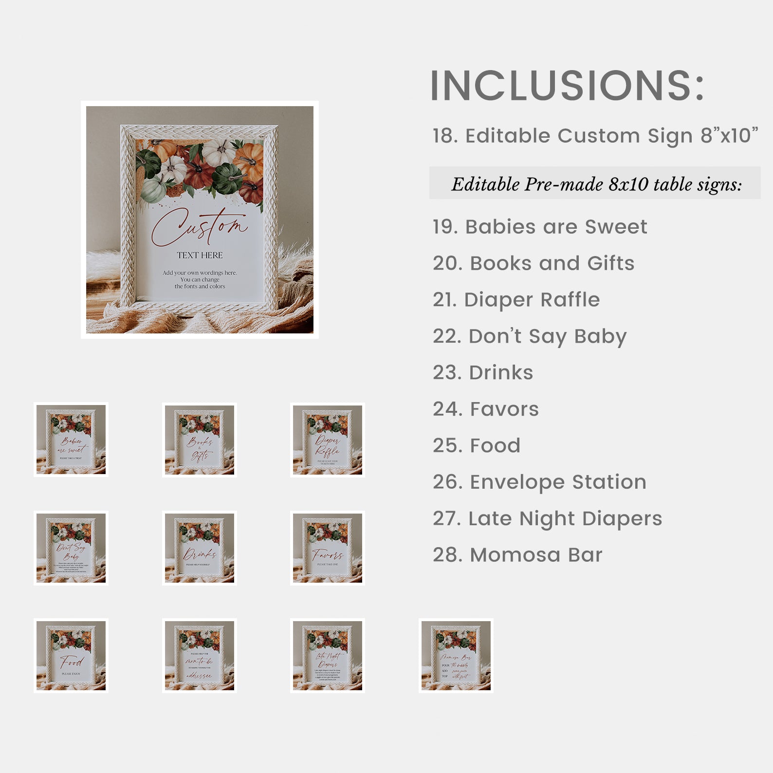 Celebrate your little pumpkin in style with this all-inclusive fall baby shower mega bundle, featuring 100 beautifully coordinated items. The design showcases a stunning watercolor mix of burgundy, pastel, and orange pumpkins, accented with green leaves, corn, and a charming pumpkin flower capturing the warmth of autumn. This bundle includes invitations (backside and mobile versions), raffle cards, thank you notes, welcome and table signs, food and drink labels, favor tags, toppers, wrappers, and 60 editable games perfect for a festive and memorable celebration.