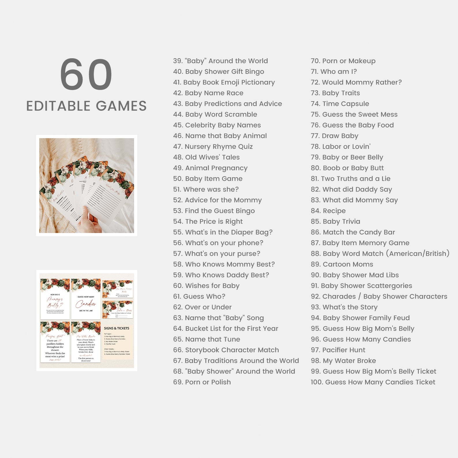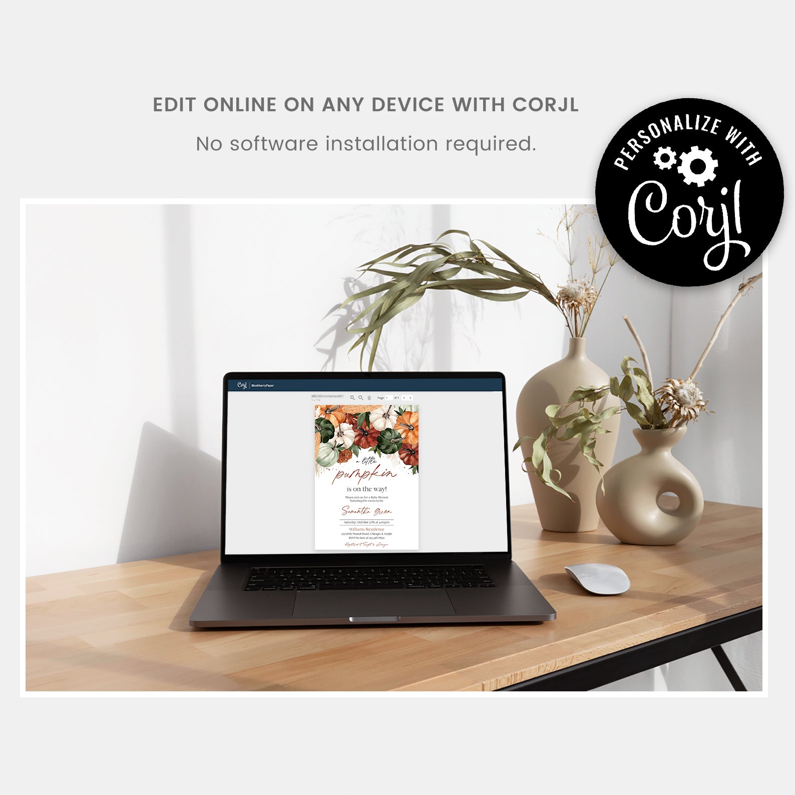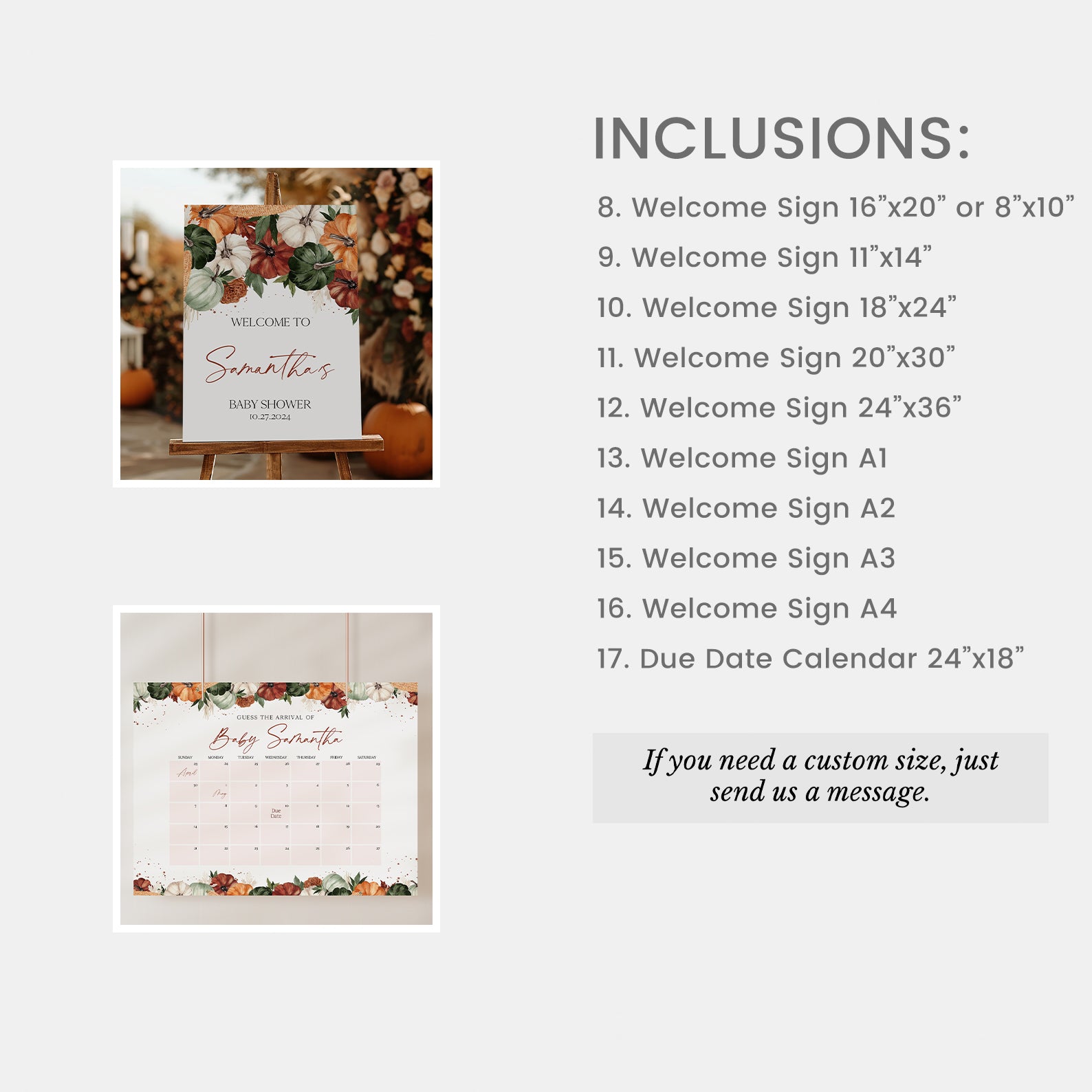 Celebrate your little pumpkin in style with this all-inclusive fall baby shower mega bundle, featuring 100 beautifully coordinated items. The design showcases a stunning watercolor mix of burgundy, pastel, and orange pumpkins, accented with green leaves, corn, and a charming pumpkin flower capturing the warmth of autumn. This bundle includes invitations (backside and mobile versions), raffle cards, thank you notes, welcome and table signs, food and drink labels, favor tags, toppers, wrappers, and 60 editable games perfect for a festive and memorable celebration.