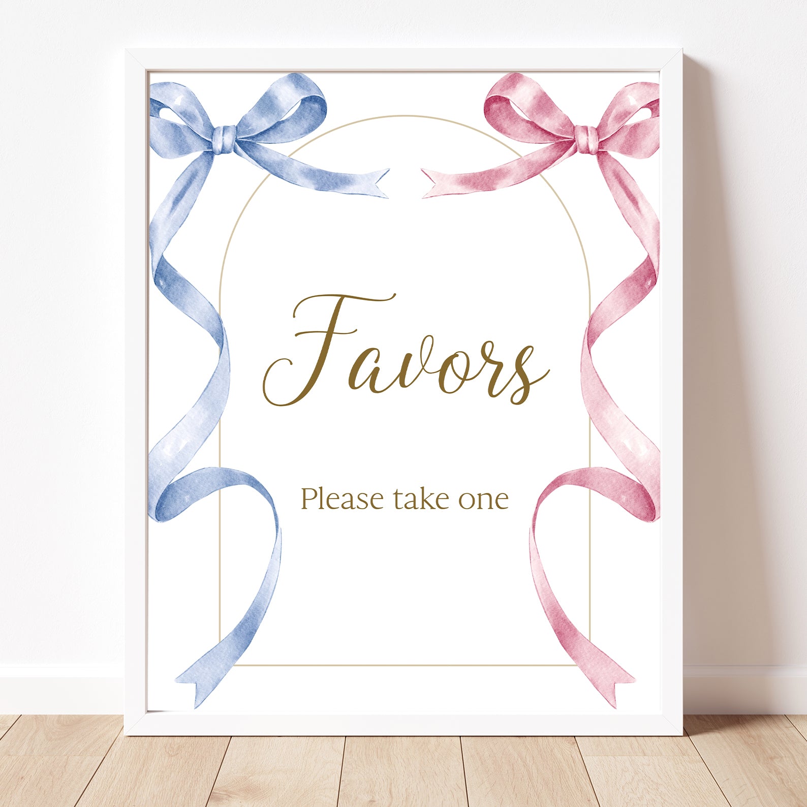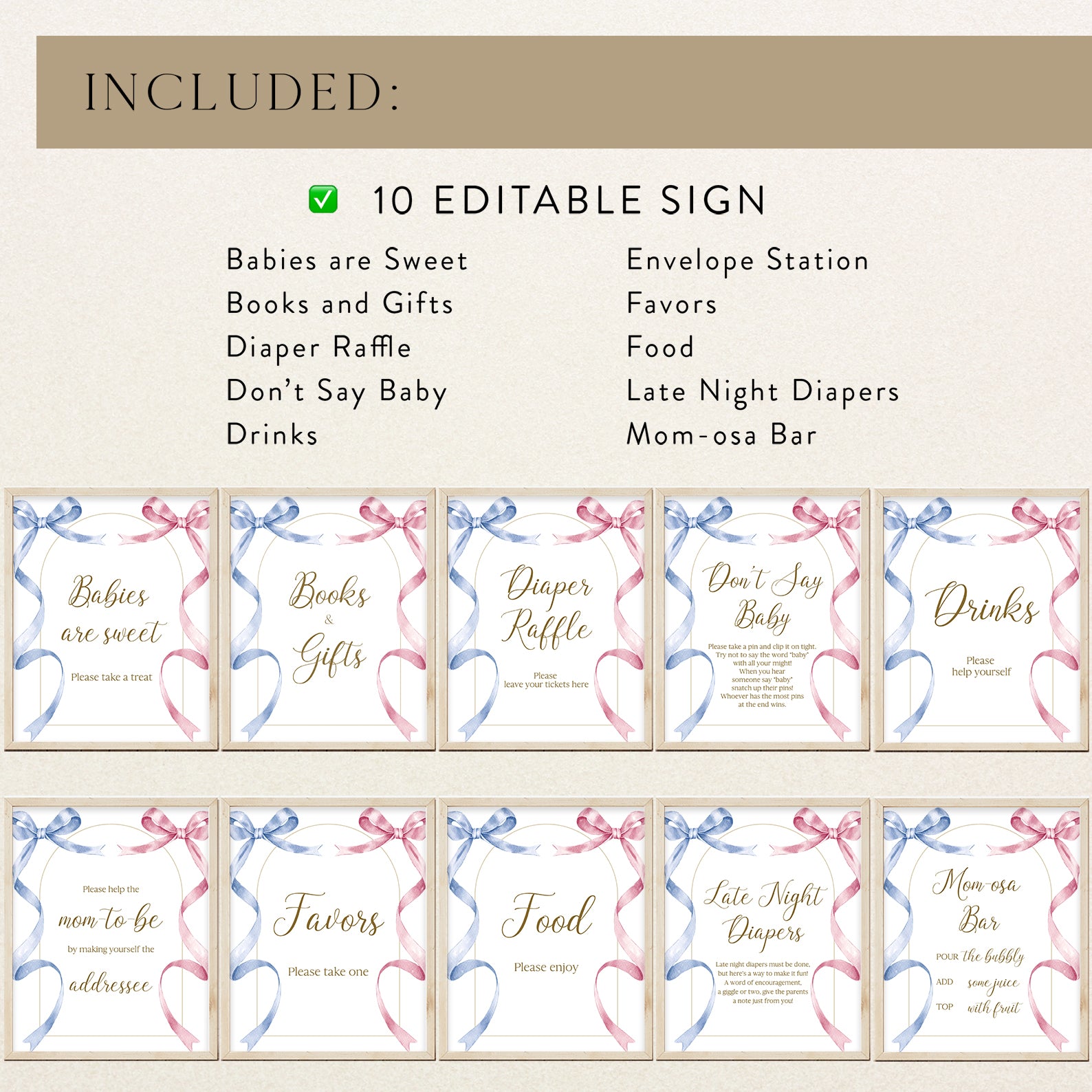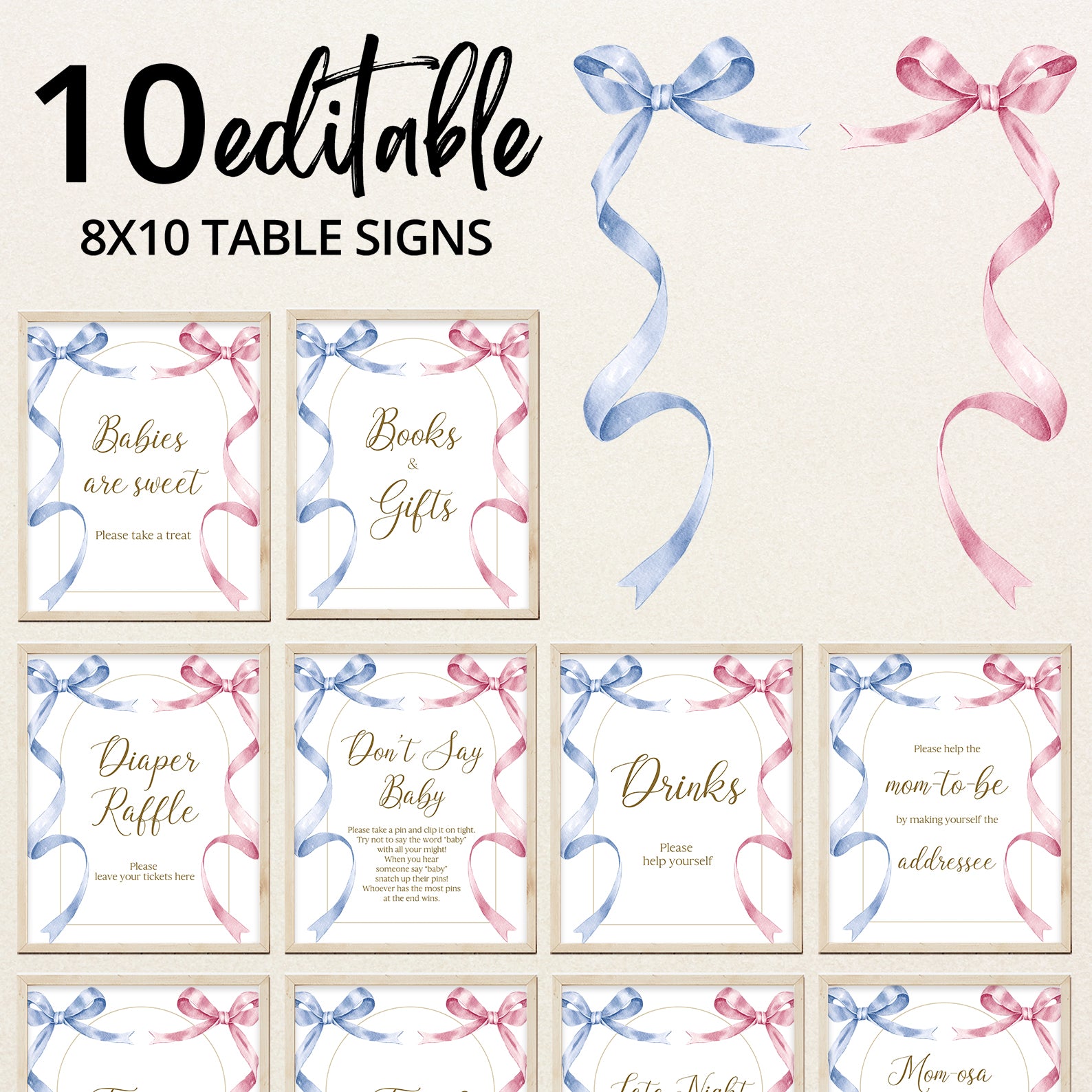 Enhance your gender reveal setup with this set of ten editable table signs, designed to complement your elegant celebration. Featuring a stunning gold arch and playful pink and blue ribbon accents, these signs add a sophisticated yet fun touch to your event. The set includes Balloons, Babies Are Sweet, Drinks, Envelope Station, Food, Favors, Late Night Diapers, Mom-osa Bar, Voting Station, and Team Boy/Team Girl, ensuring a cohesive and stylish décor for your special day!