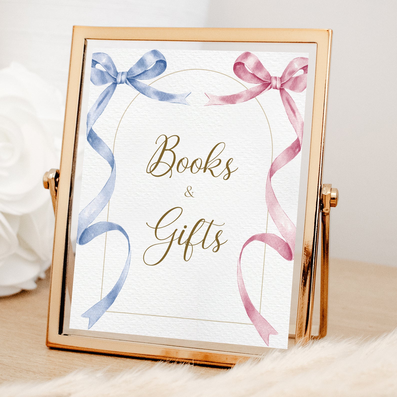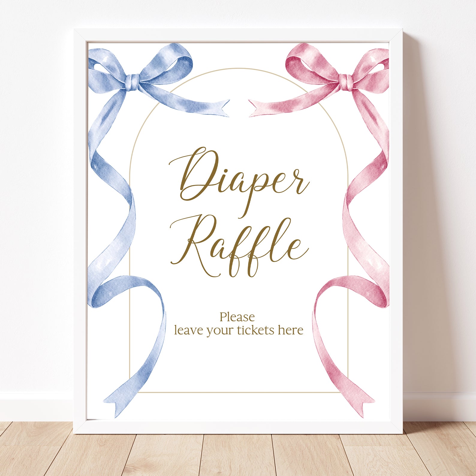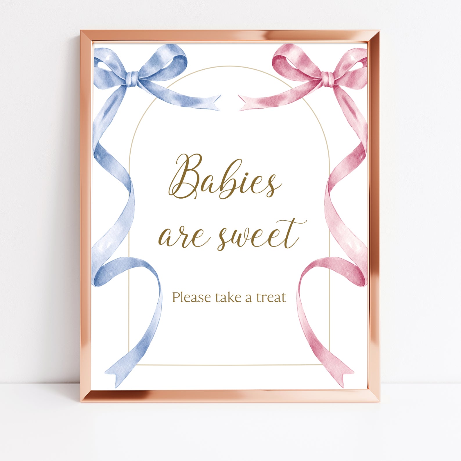 Enhance your gender reveal setup with this set of ten editable table signs, designed to complement your elegant celebration. Featuring a stunning gold arch and playful pink and blue ribbon accents, these signs add a sophisticated yet fun touch to your event. The set includes Balloons, Babies Are Sweet, Drinks, Envelope Station, Food, Favors, Late Night Diapers, Mom-osa Bar, Voting Station, and Team Boy/Team Girl, ensuring a cohesive and stylish décor for your special day!
