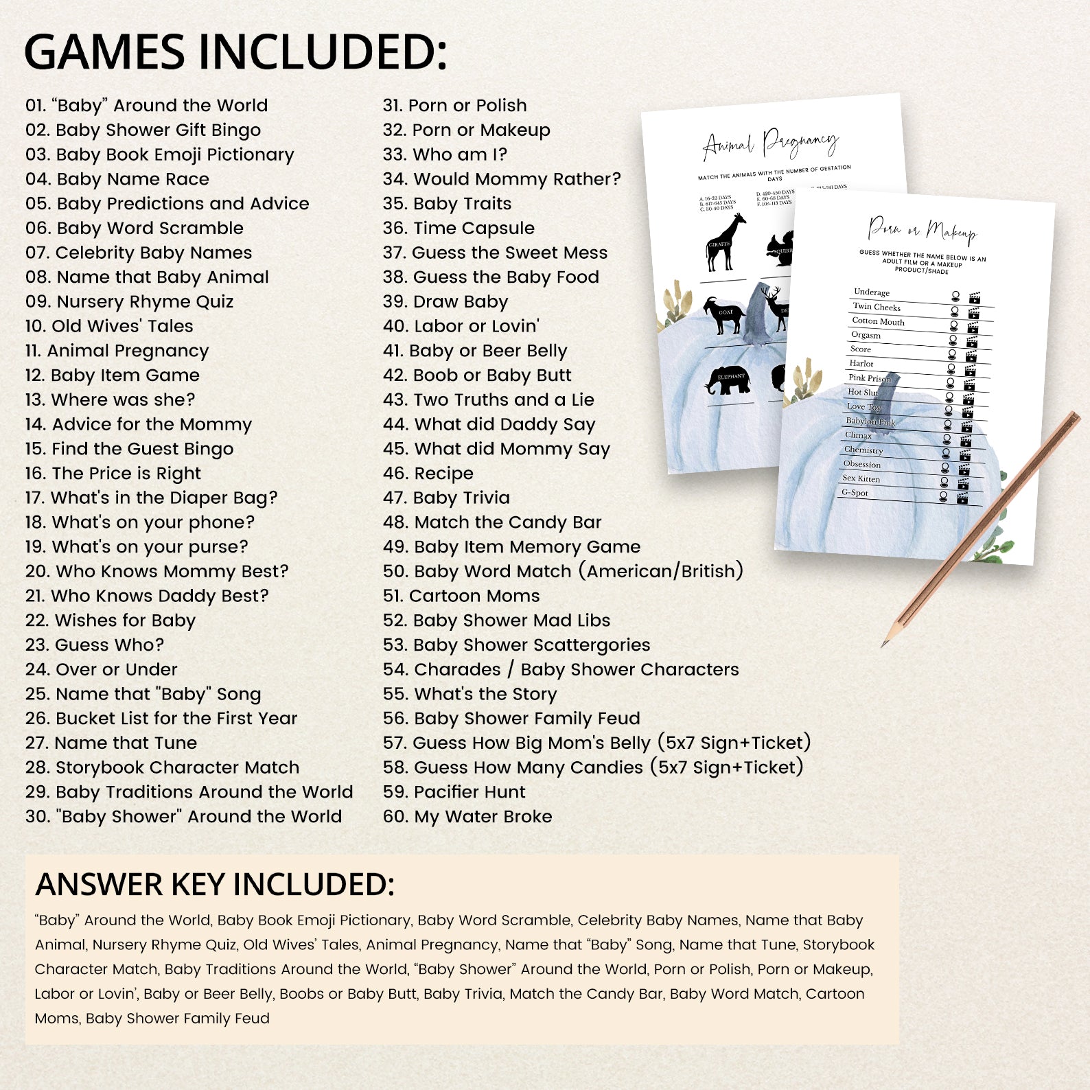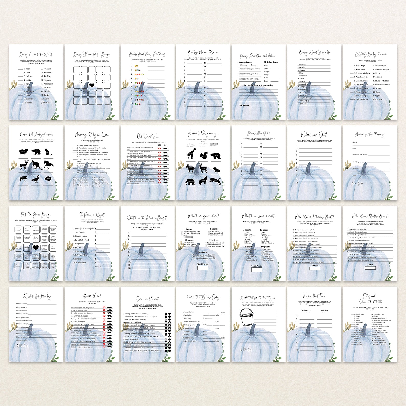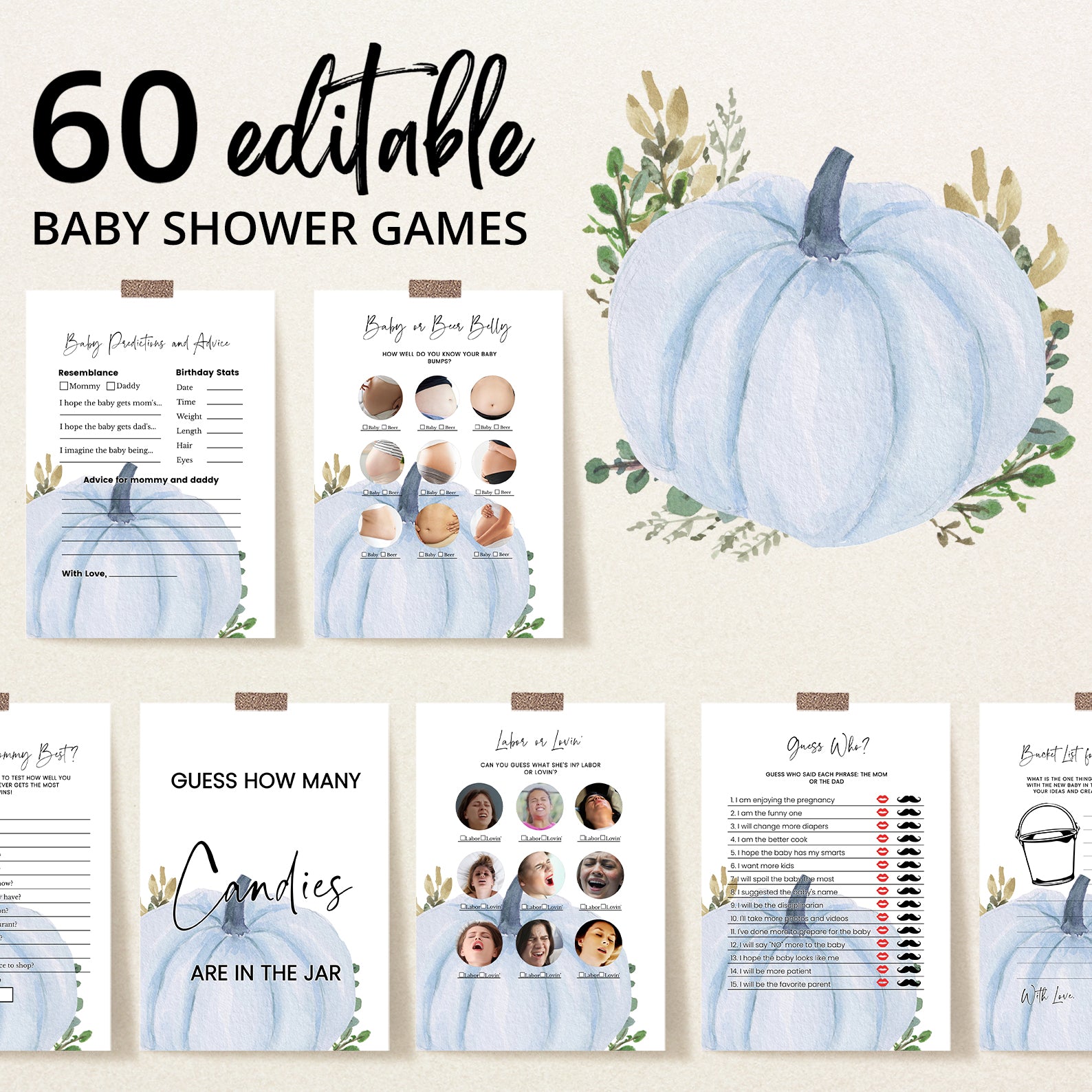 Liven up your baby shower with 60 editable fall-themed games! Each page is adorned with delicate watercolor pumpkins, subtle green foliage, and warm neutral tones to match your autumn decor. From icebreakers to classic favorites, this bundle is perfect for entertaining guests while celebrating the upcoming arrival of your little one in cozy seasonal style.