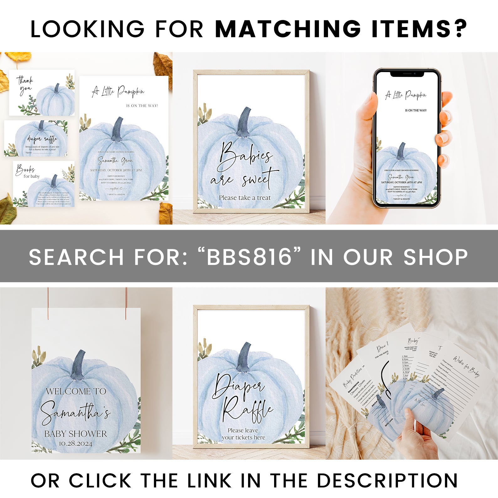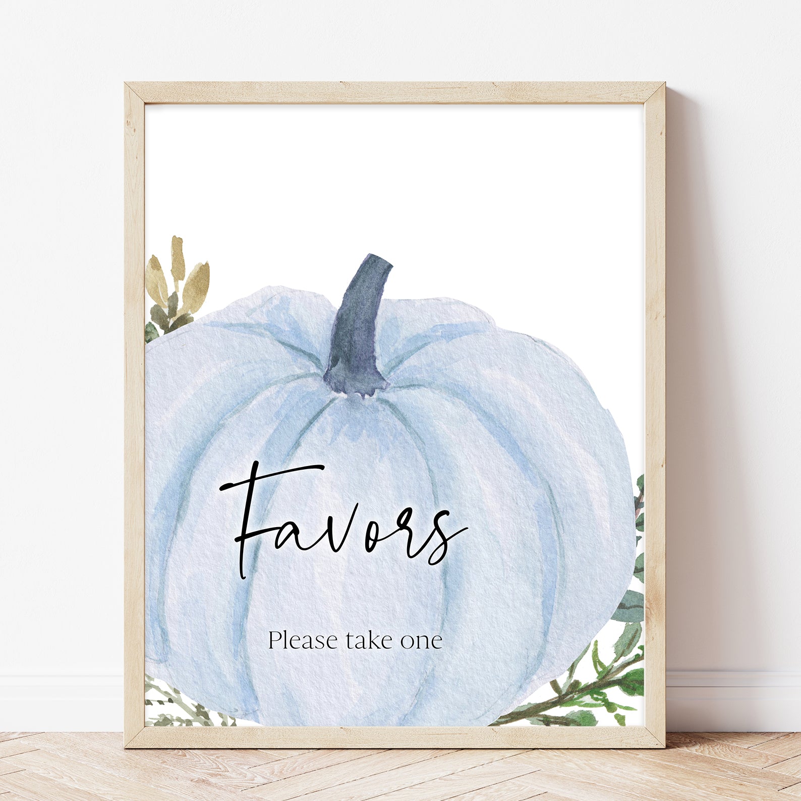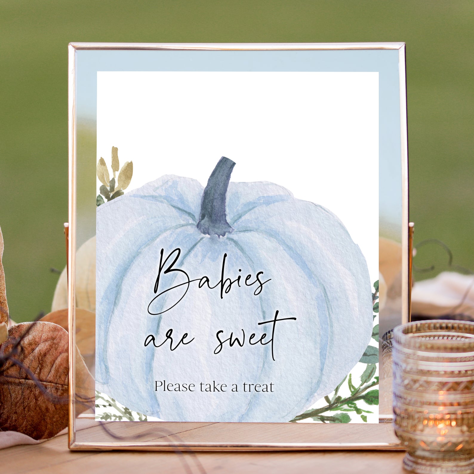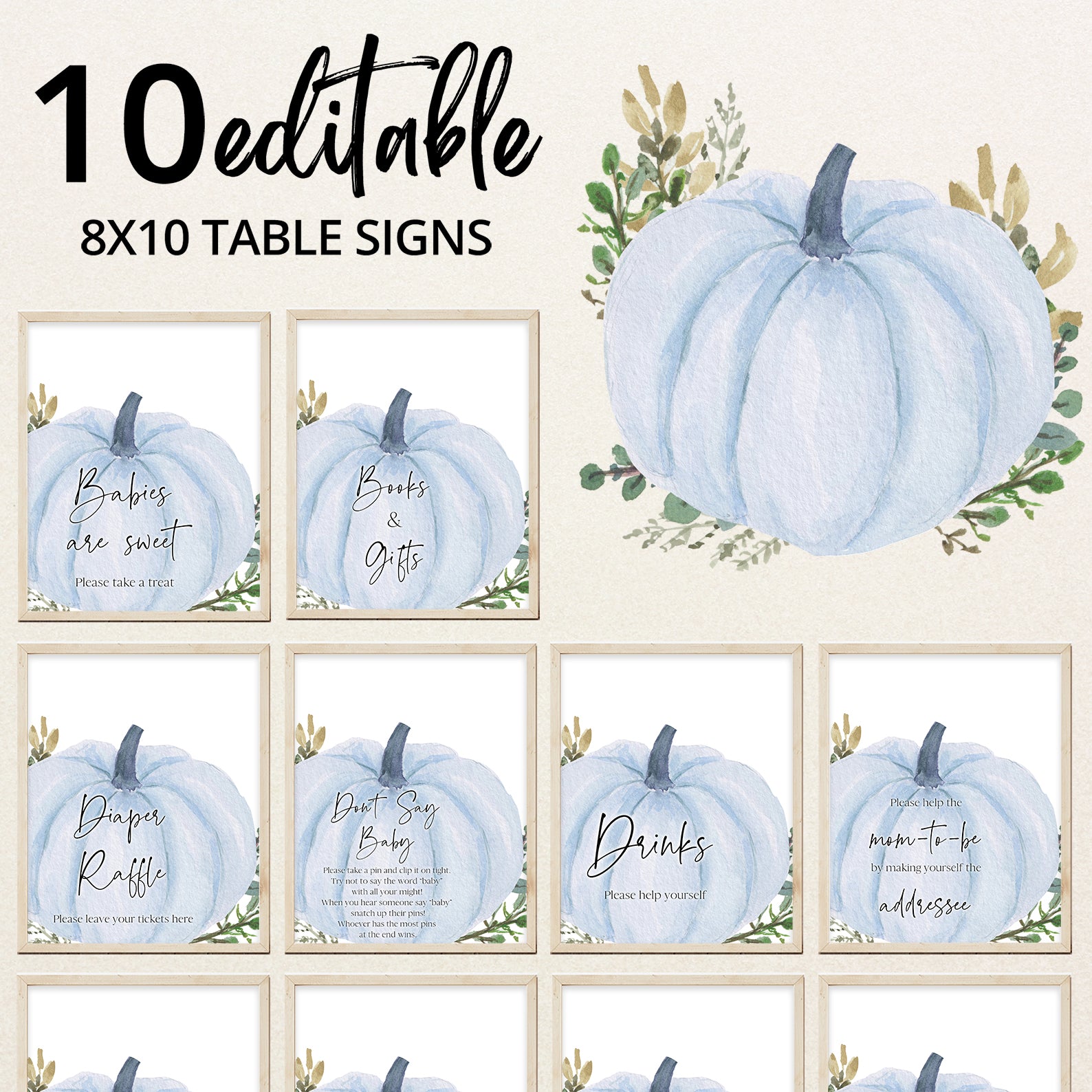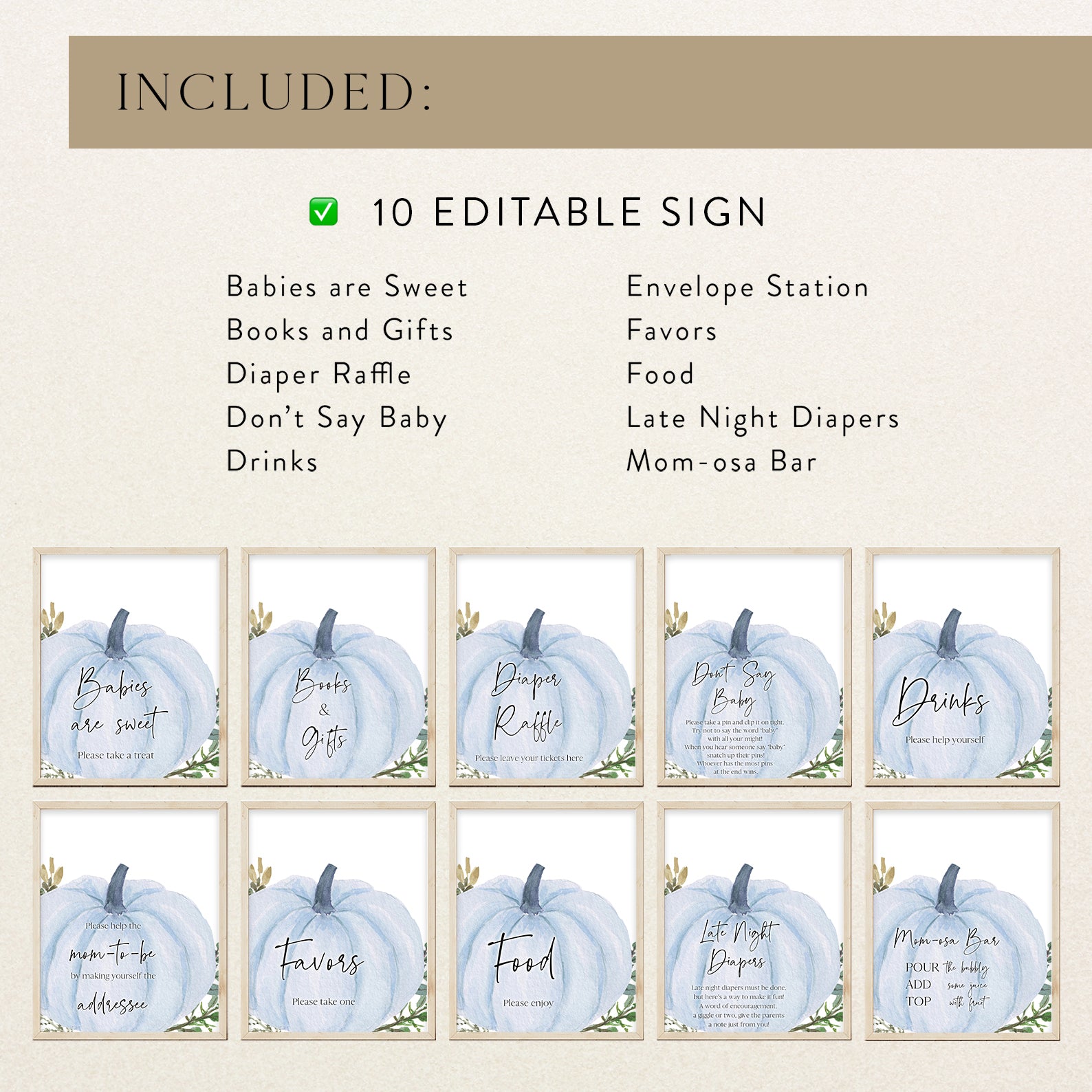 Style your fall baby shower with this beautifully coordinated set of 10 editable table signs. Featuring soft greenery and a gender-neutral pumpkin motif in pink or blue, each sign from “Babies Are Sweet” to “Mom-osa Bar” adds charm to your setup. The watercolor design and seasonal accents bring a warm, polished touch to your autumn celebration while keeping every station organized and festive.