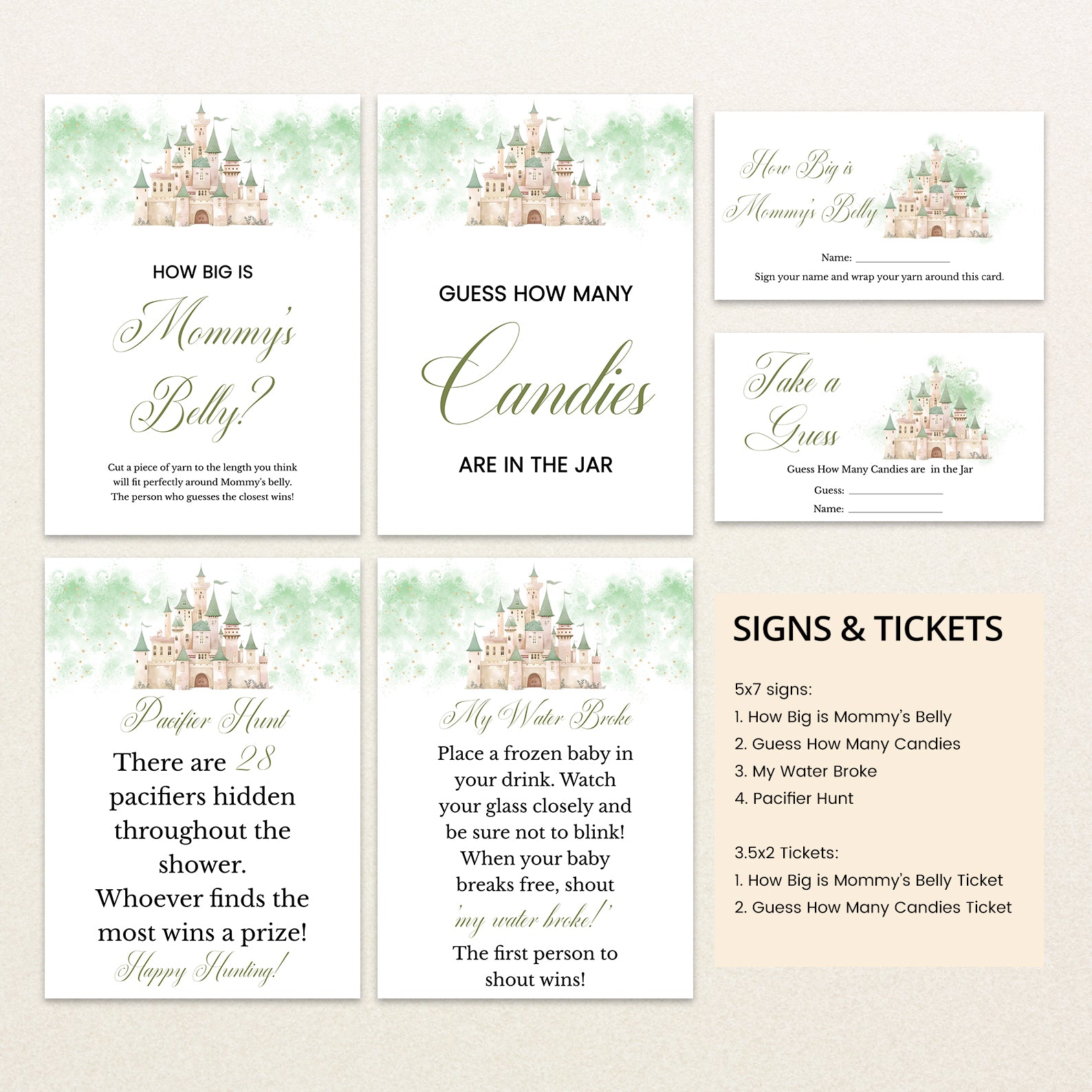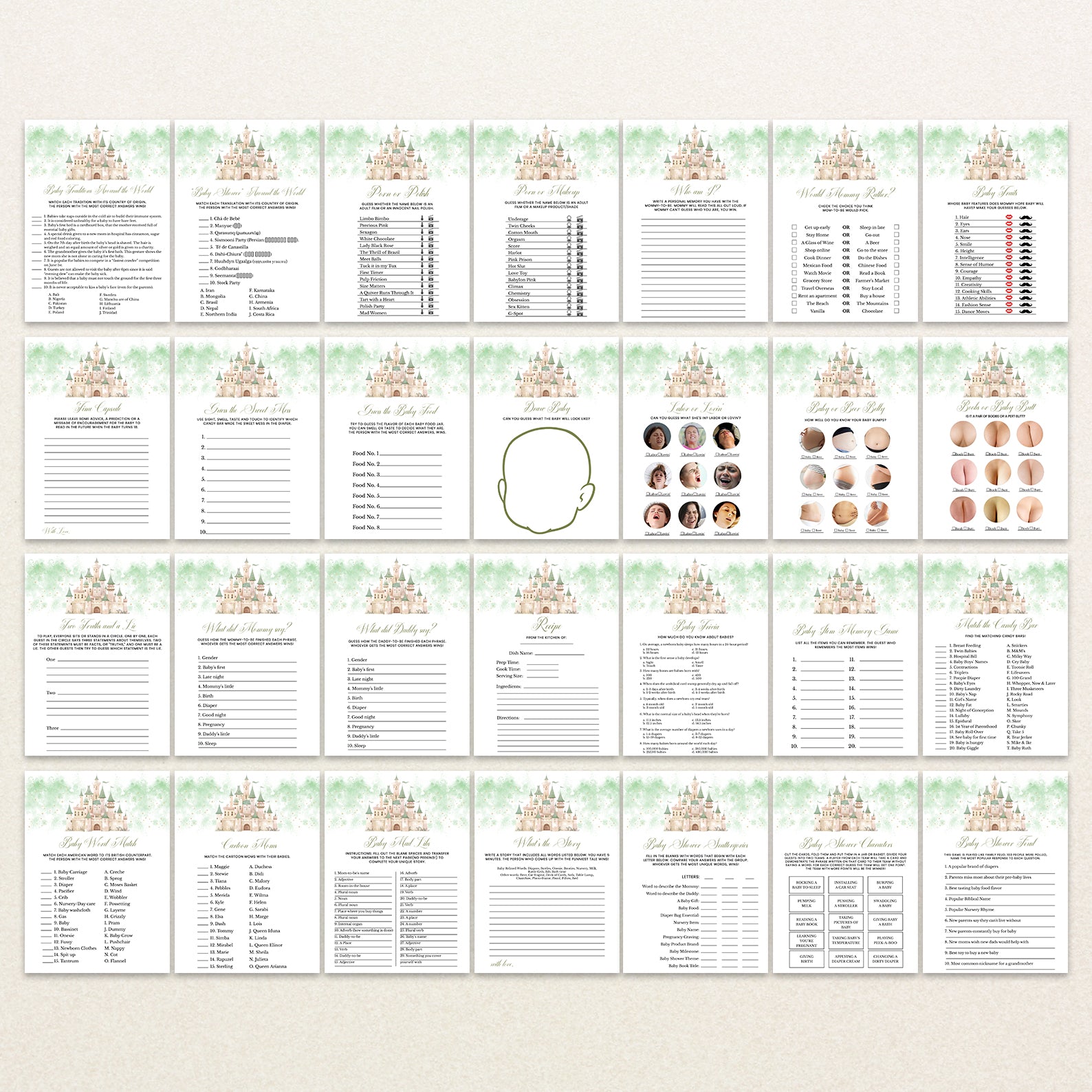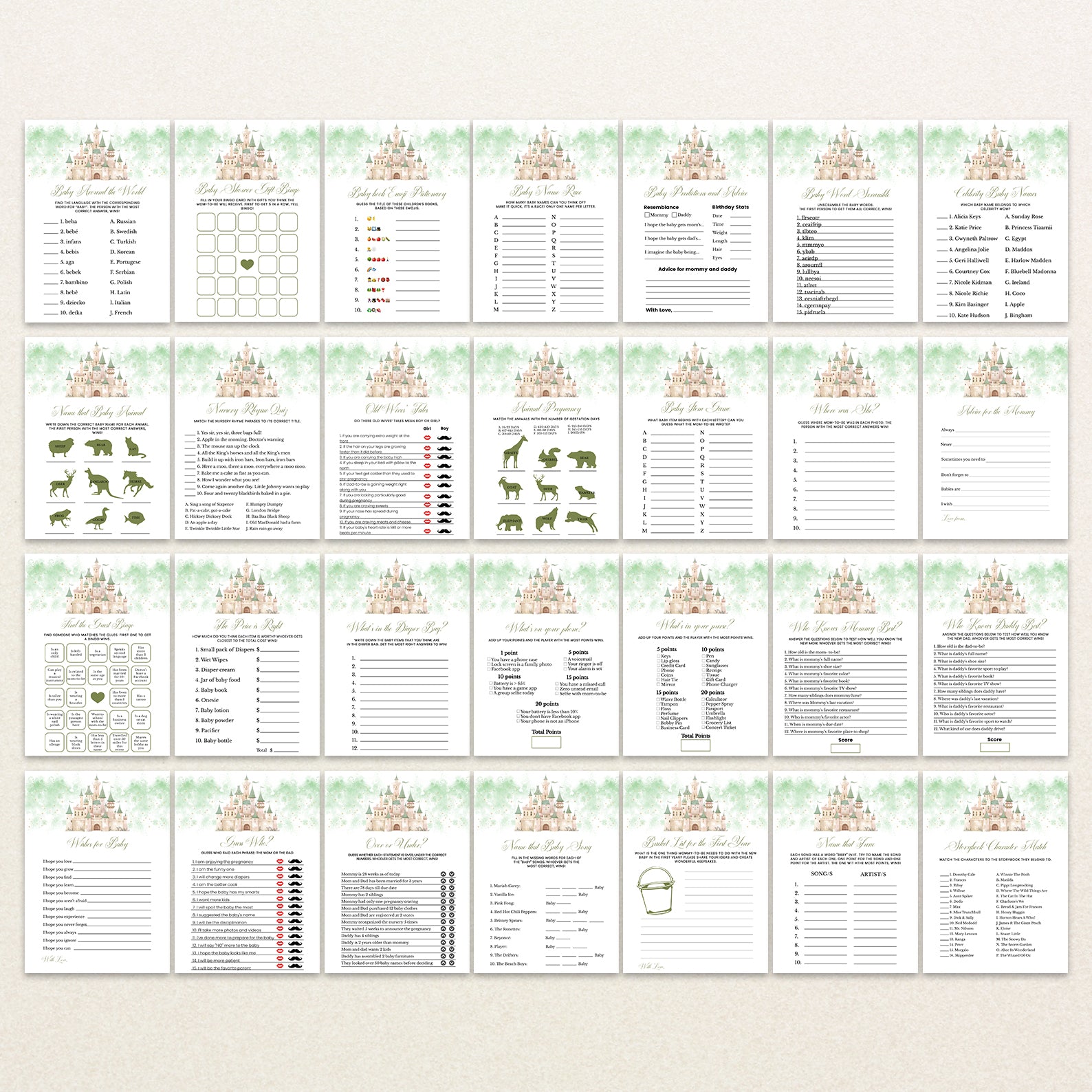 Make your baby shower truly memorable with this magical set of 60 editable baby shower games! Designed to match a charming green and gold royal theme, each game features whimsical elements perfect for a “Little Prince” celebration. From fun icebreakers to sweet memory-makers, this bundle has everything you need to keep guests entertained and engaged throughout the event. Also available in a pink castle theme for a “Little Princess” celebration.