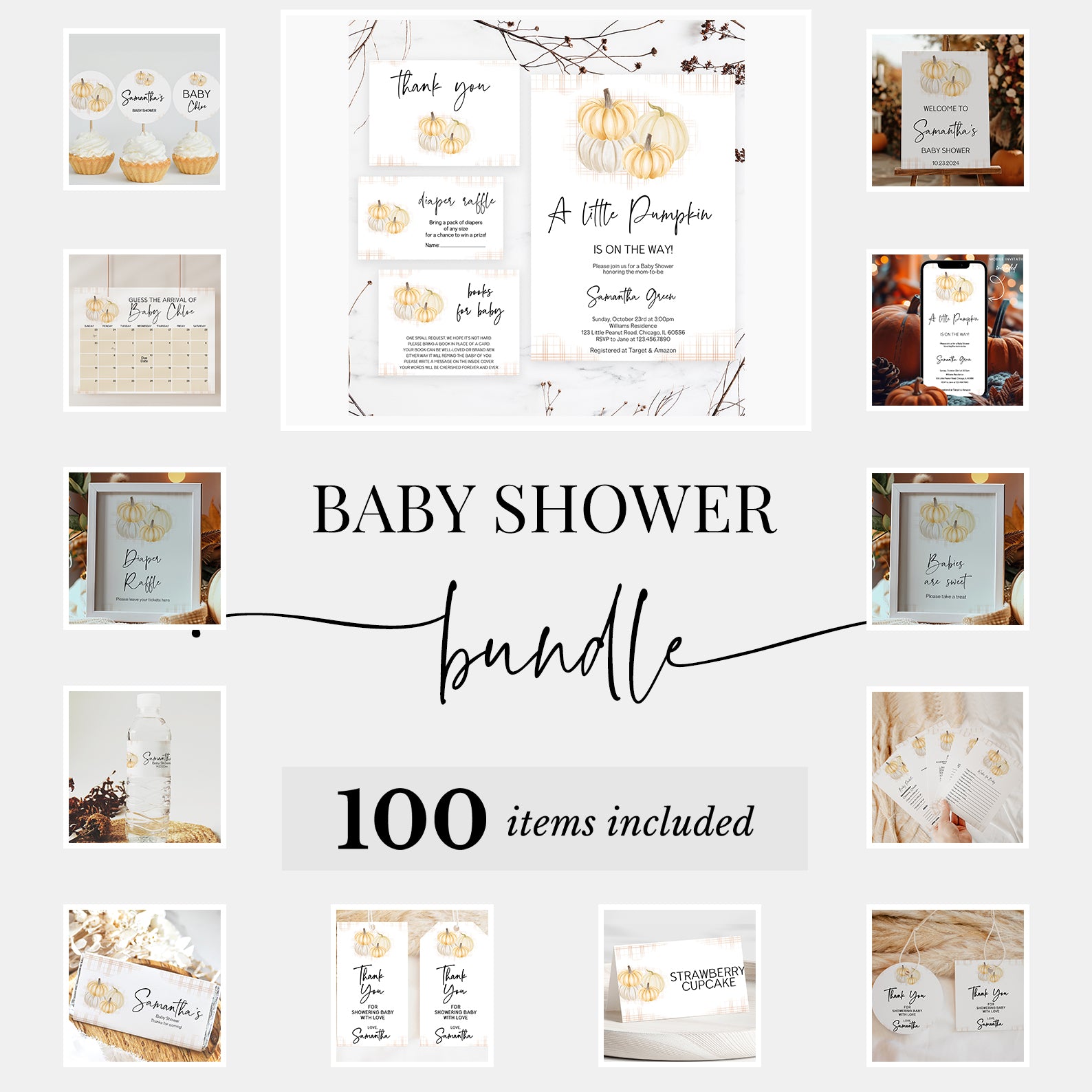 Plan an effortlessly themed baby shower with this 100-piece editable mega bundle. Featuring everything from invitations and table signs to favor tags and cupcake toppers, each item showcases cozy orange and green pumpkins with a faded checkered pattern. Whether it's décor or games, this bundle has everything you need for a warm, cohesive fall celebration.