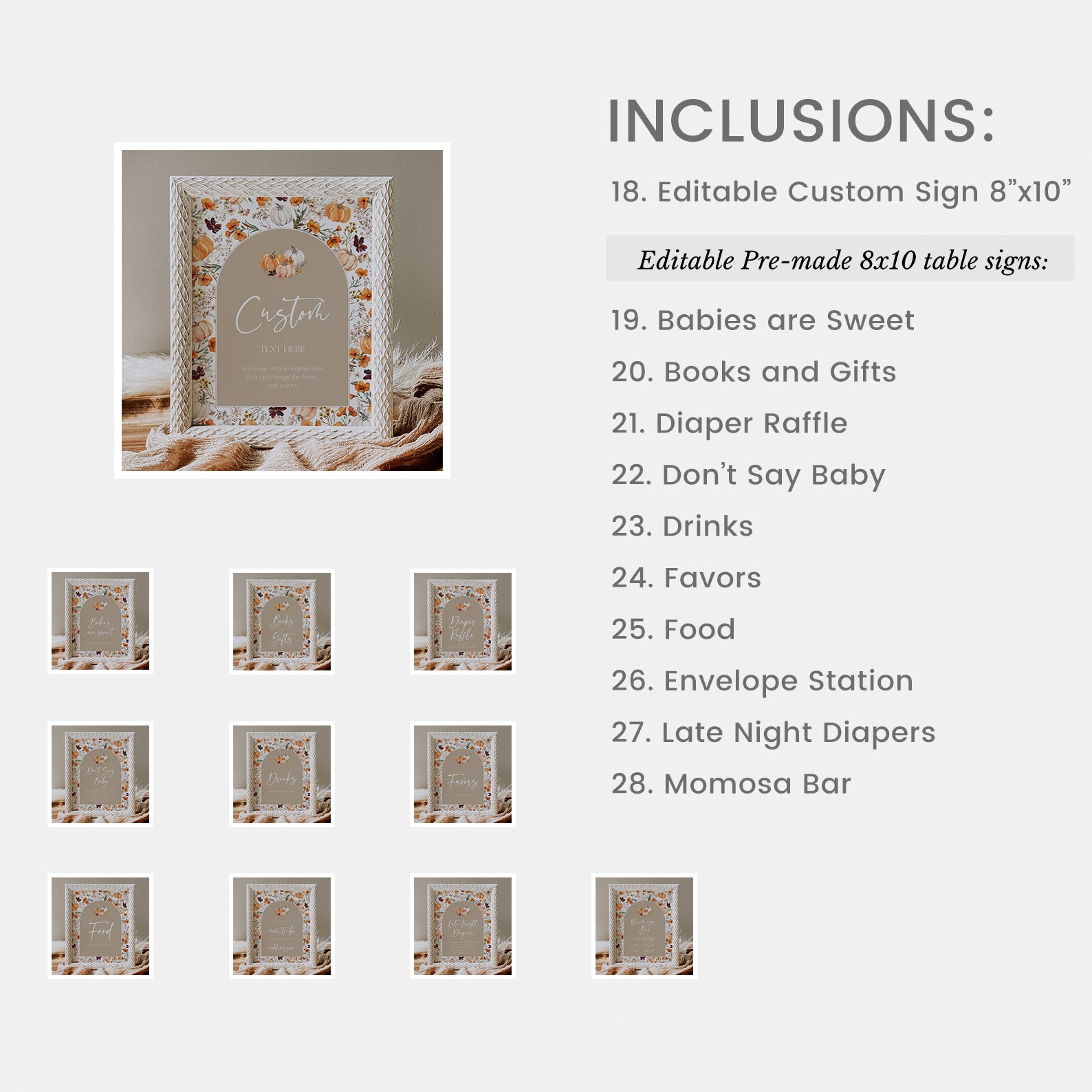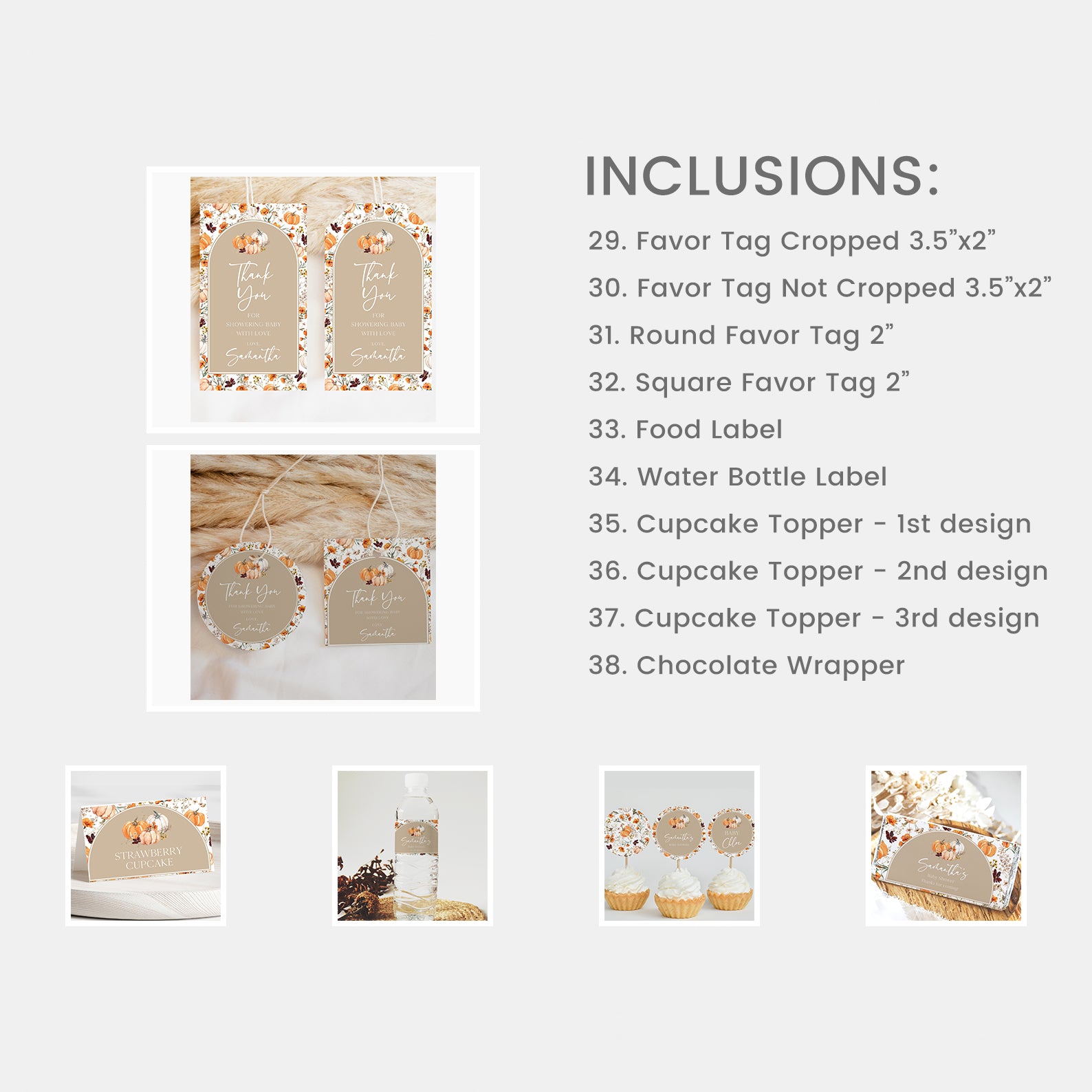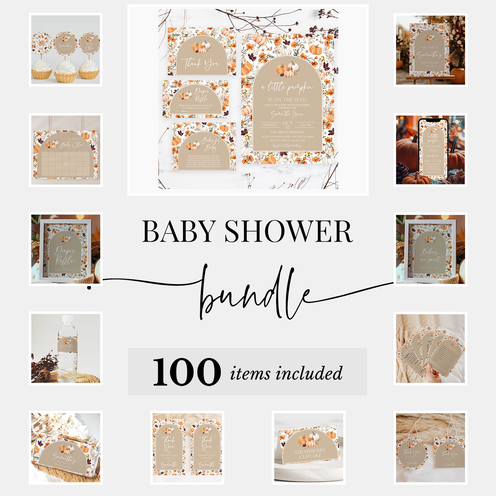 Celebrate your little pumpkin with this all-in-one fall baby shower mega bundle featuring 100 editable items, perfectly designed for a warm and festive gathering. Showcasing a cozy brown arch and a stunning watercolor mix of pumpkins, autumn leaves, and florals, this bundle brings the beauty of fall to every detail. It includes invitations (with back and mobile versions), raffle cards, thank you notes, signs, labels, toppers, wrappers, and 60 fun shower games. Everything you need for a memorable event!