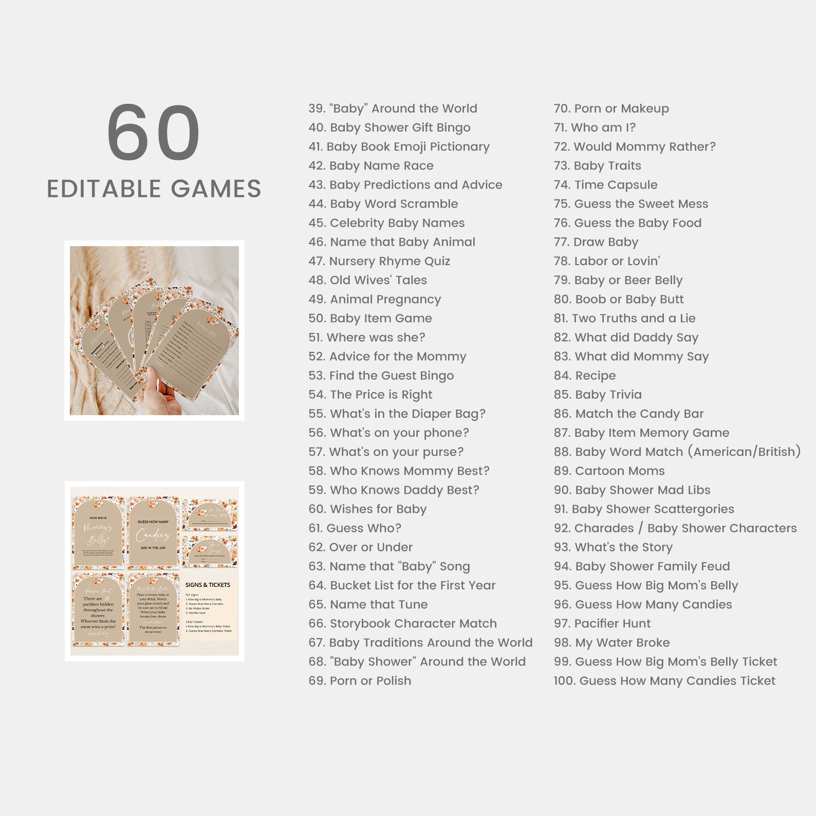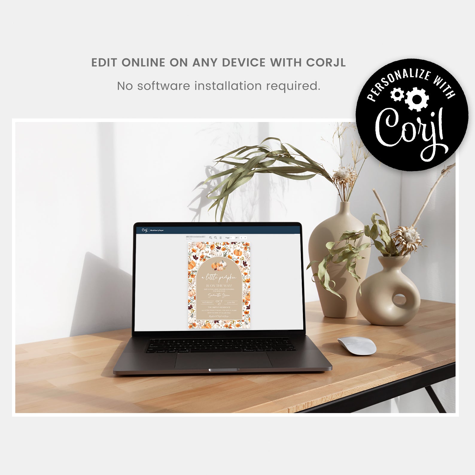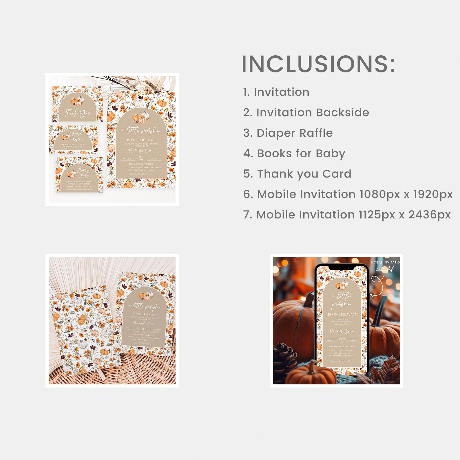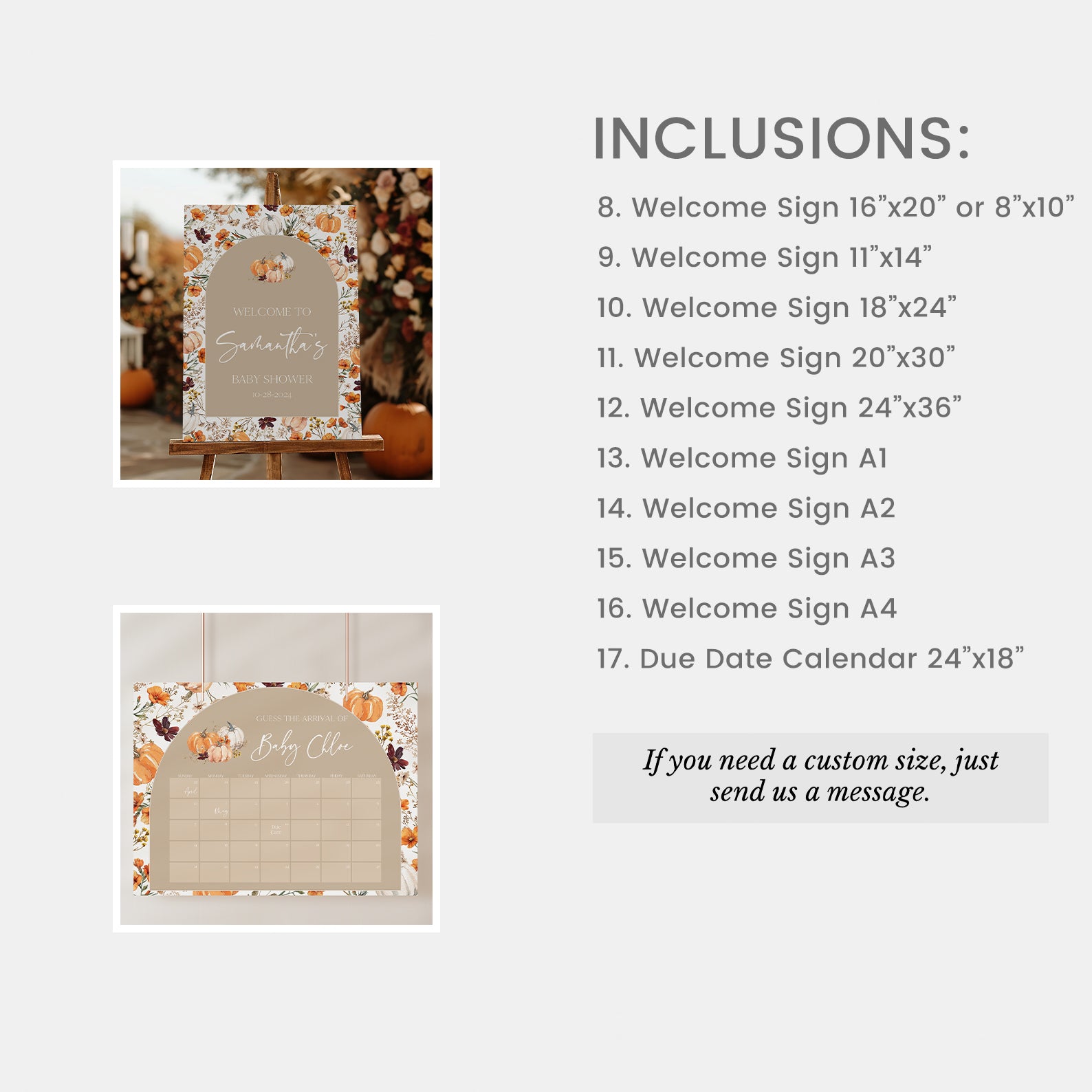 Celebrate your little pumpkin with this all-in-one fall baby shower mega bundle featuring 100 editable items, perfectly designed for a warm and festive gathering. Showcasing a cozy brown arch and a stunning watercolor mix of pumpkins, autumn leaves, and florals, this bundle brings the beauty of fall to every detail. It includes invitations (with back and mobile versions), raffle cards, thank you notes, signs, labels, toppers, wrappers, and 60 fun shower games. Everything you need for a memorable event!