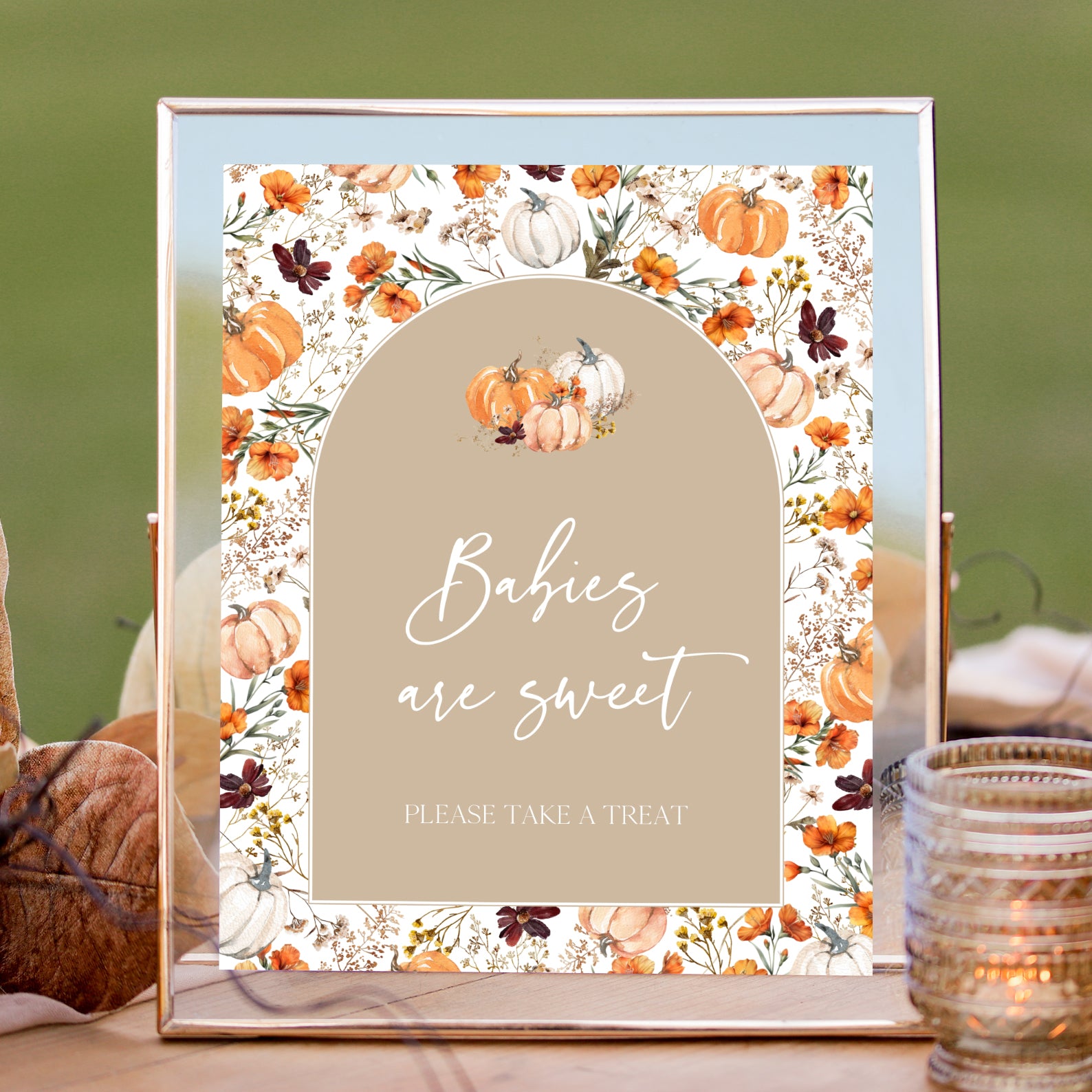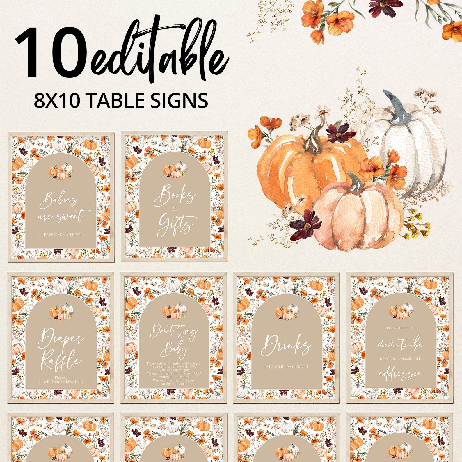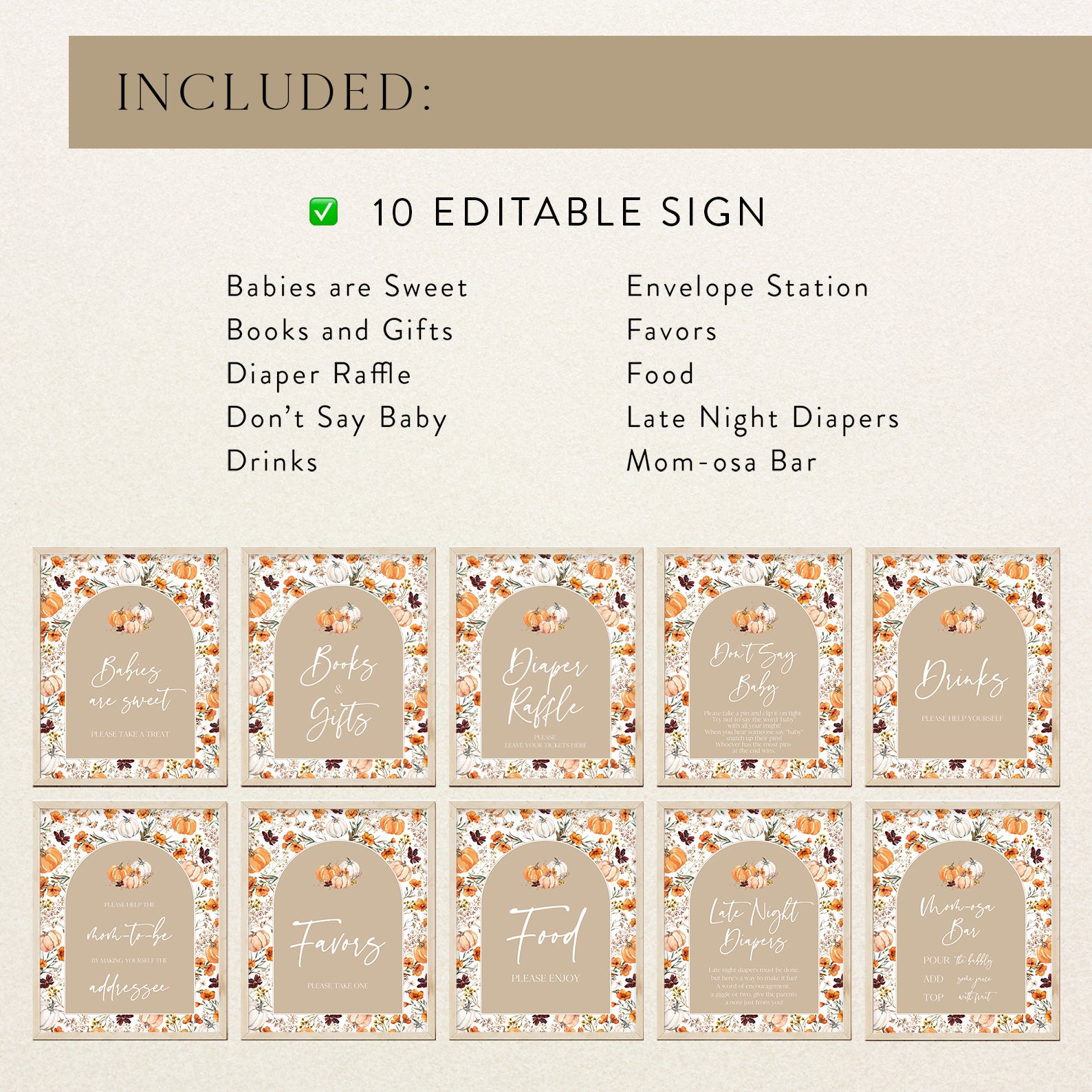 Enhance your autumn baby shower with this set of 10 editable table signs, designed to complement a cozy “little pumpkin” theme. Each sign features a warm brown arch framed by soft watercolor pumpkins, rustic leaves, and seasonal florals in earthy tones. The elegant yet playful design adds a festive touch to your décor and includes: Babies Are Sweet, Books and Gifts, Diaper Raffle, Don’t Say Baby, Drinks, Envelope Station, Favors, Food, Late Night Diapers, and Mom-osa Bar.