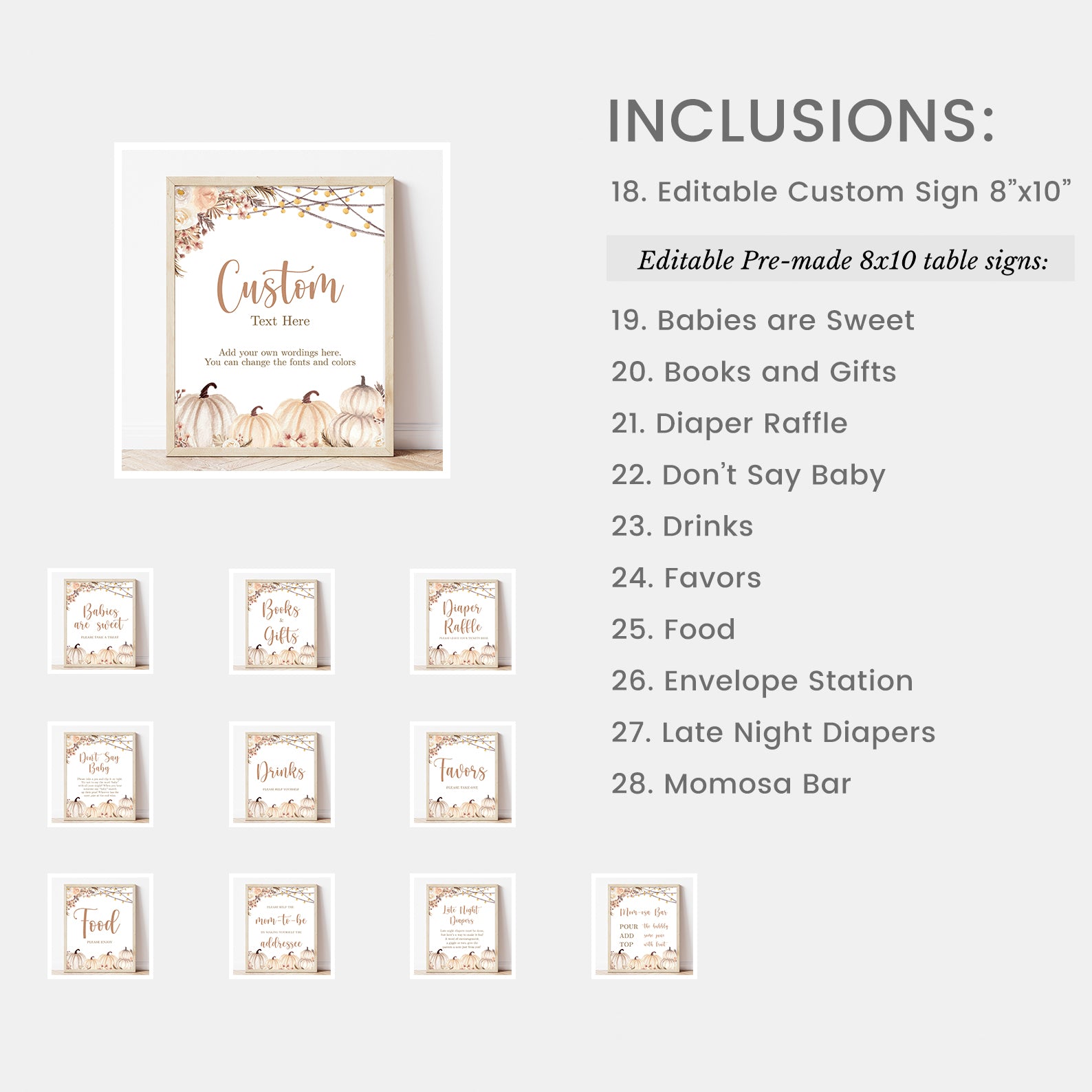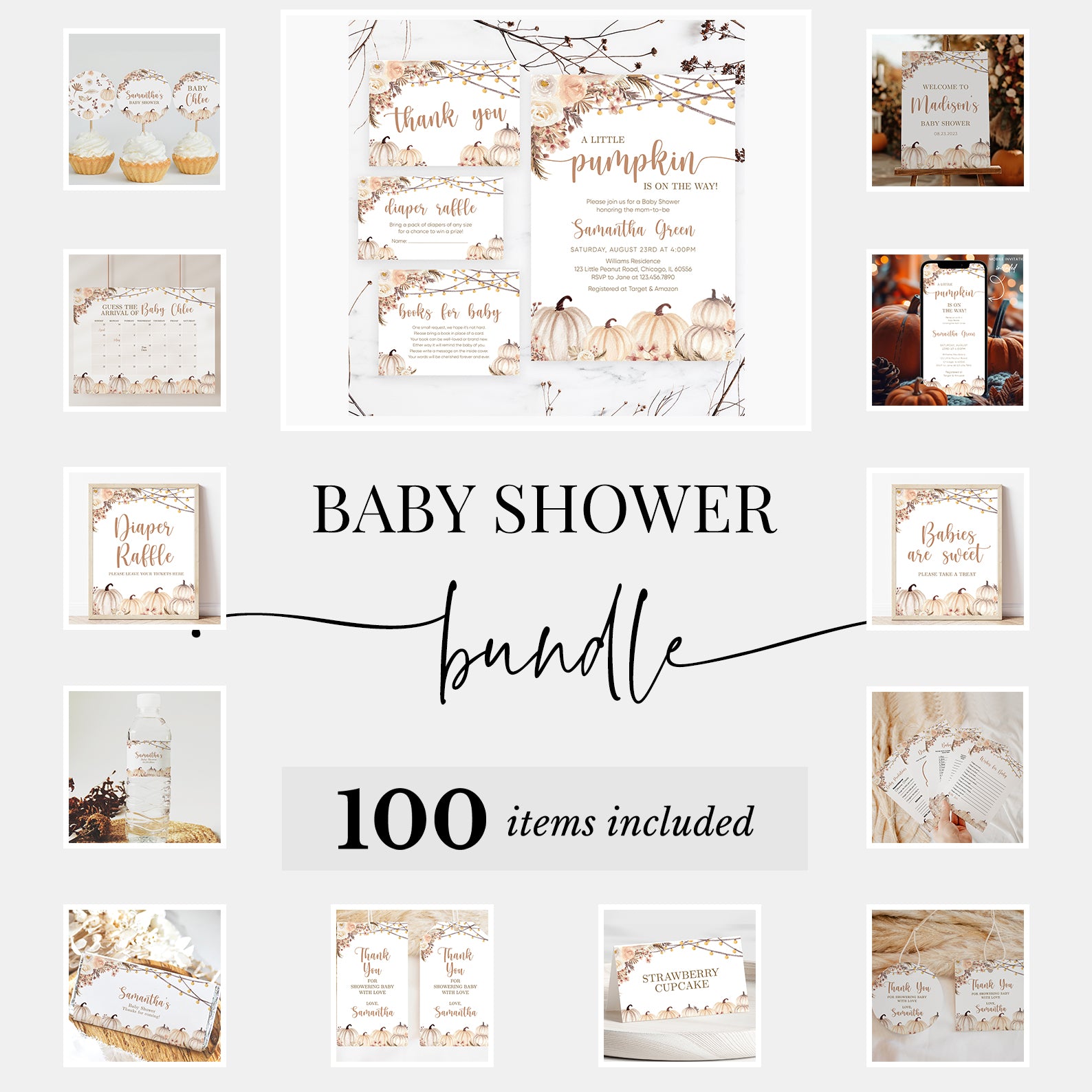 Create a beautifully unified fall baby shower with this 100-piece editable mega bundle. Featuring pampas grass, soft boho florals, string lights, and charming pumpkins, each item from invitations and favor tags to water bottle labels and games follows a warm autumn palette. Whether you’re planning a small or large event, this bundle ensures every detail feels intentional, festive, and picture-perfect.
