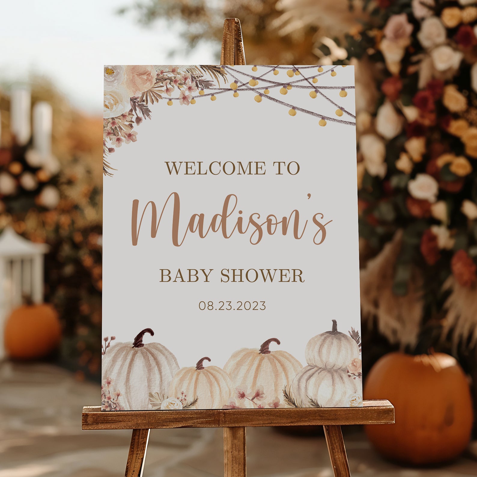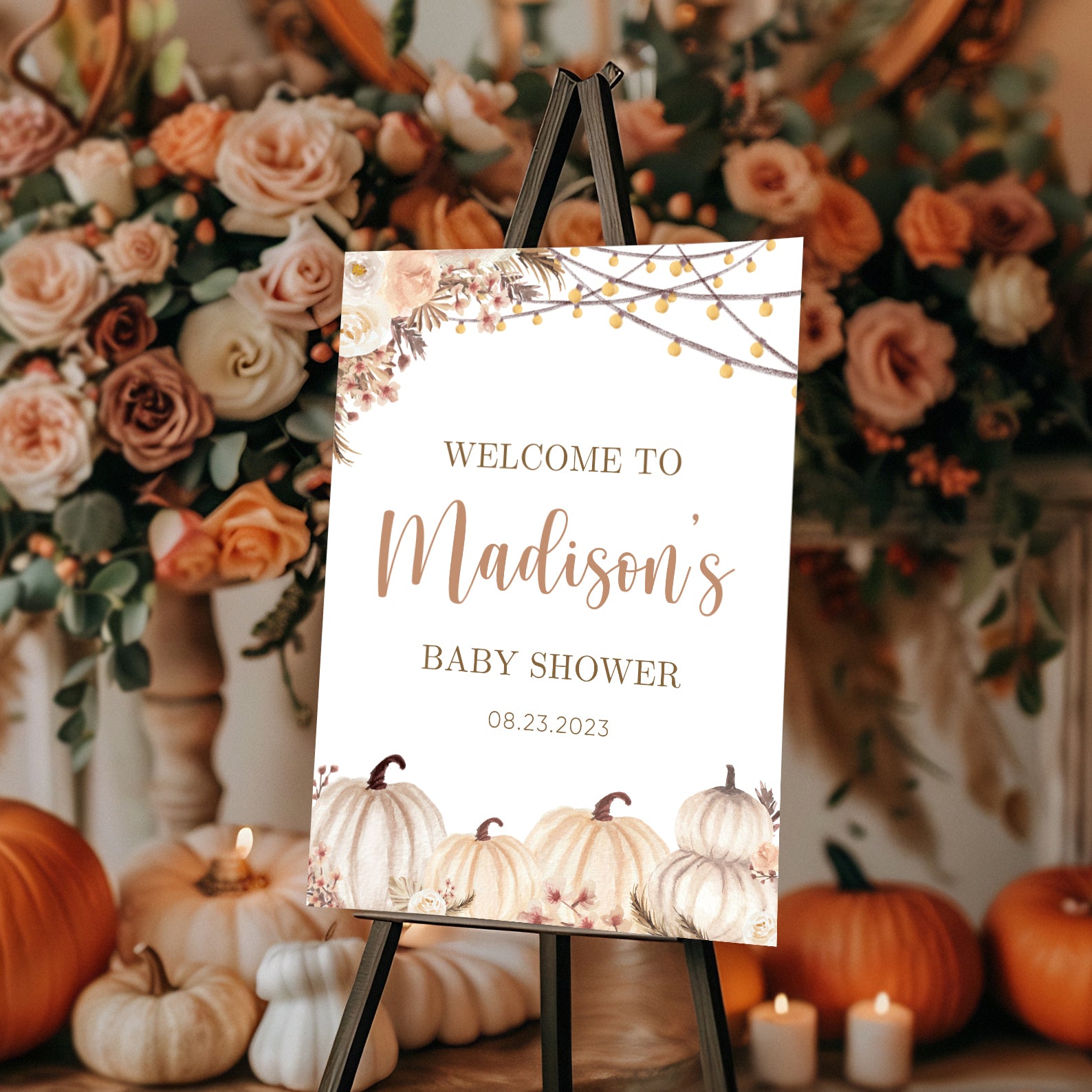 Welcome guests with our Fall Baby Shower Sign, featuring boho roses, pampas grass, twinkling lights, and playful pumpkins. Ideal for adding a charming touch to your autumn celebration.