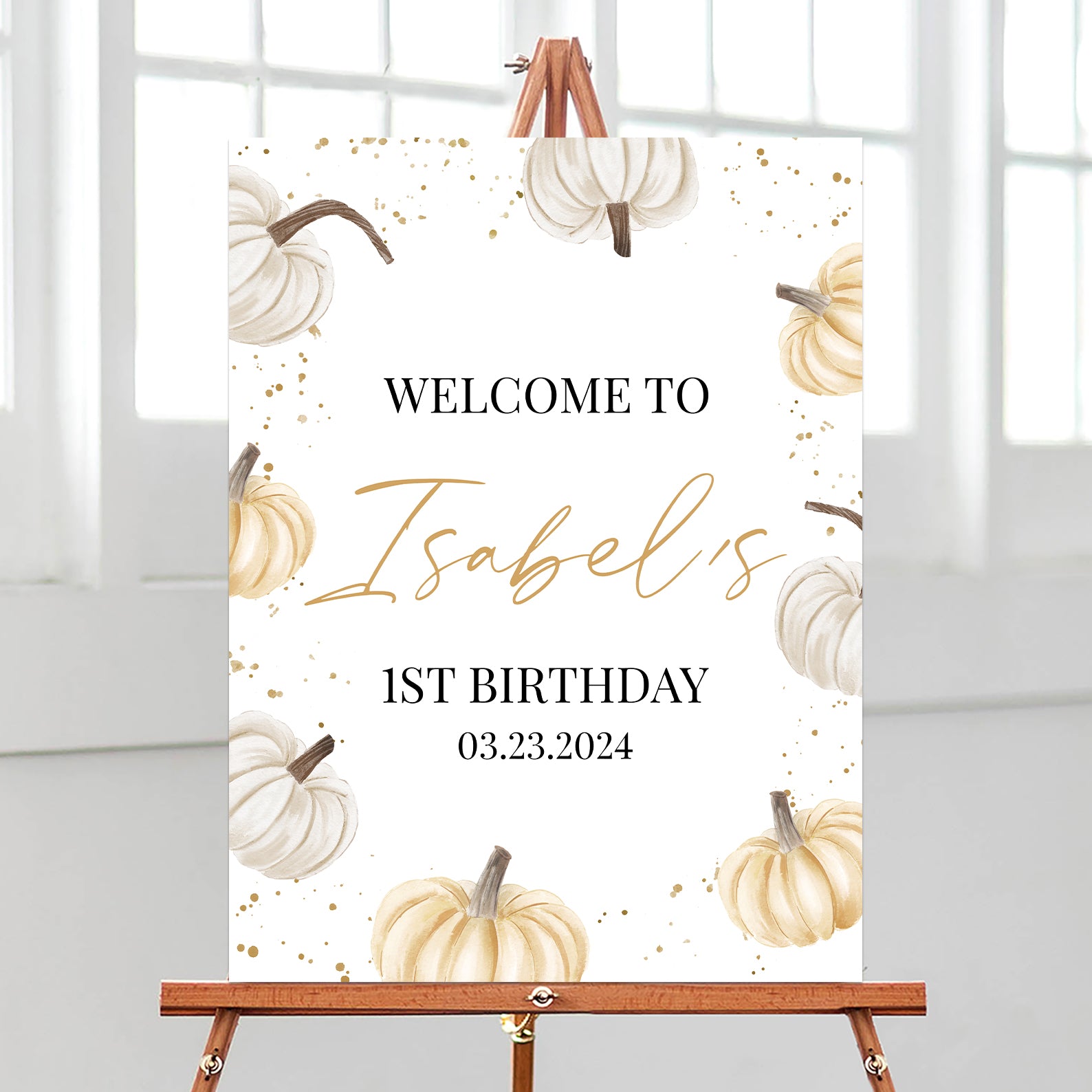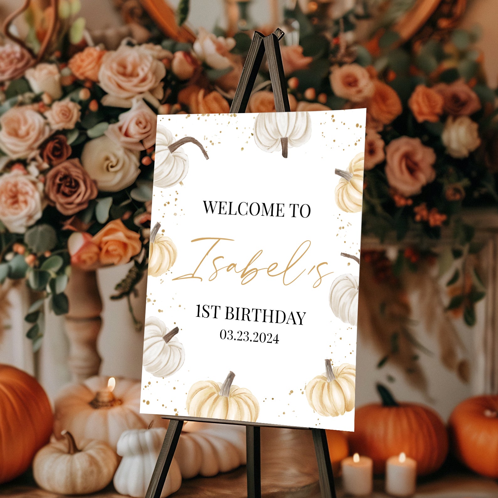 Welcome guests to a cozy autumn celebration with this charming fall-themed first birthday sign! Featuring soft white and light orange pumpkins accented with elegant gold details, this design brings a warm and festive touch to your little pumpkin’s special day. Perfect for greeting friends and family, this sign sets the tone for a joyful milestone gathering filled with love, laughter, and seasonal charm.