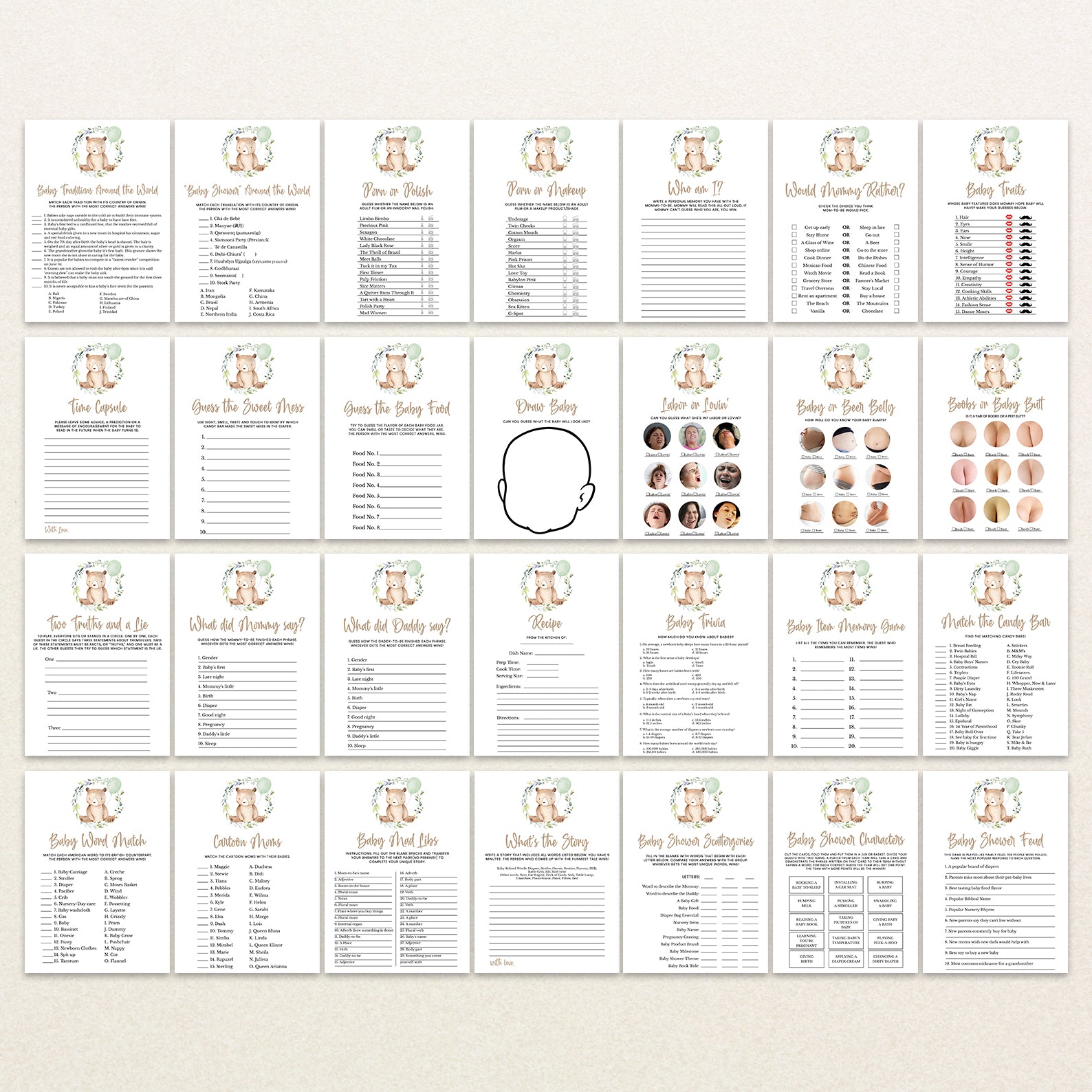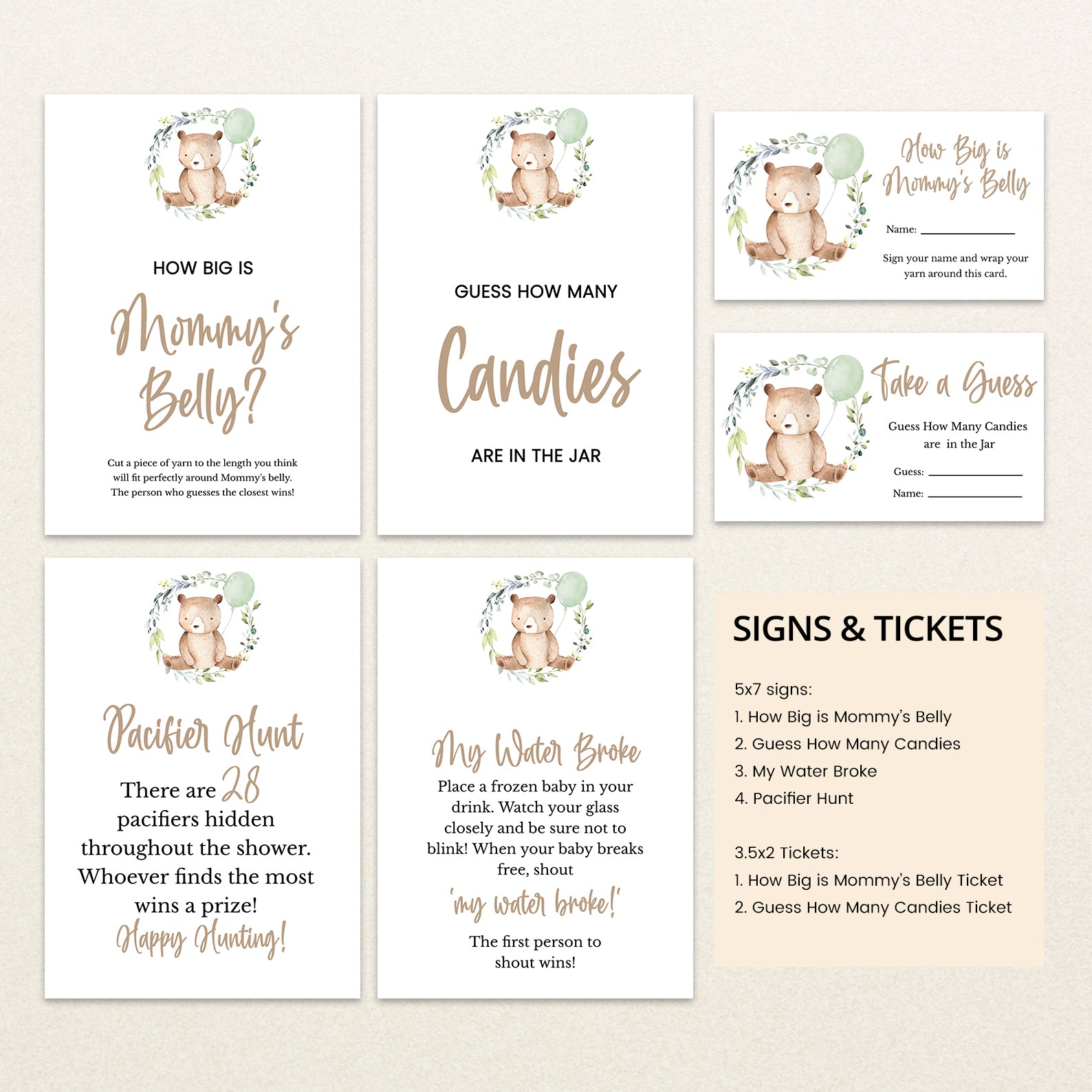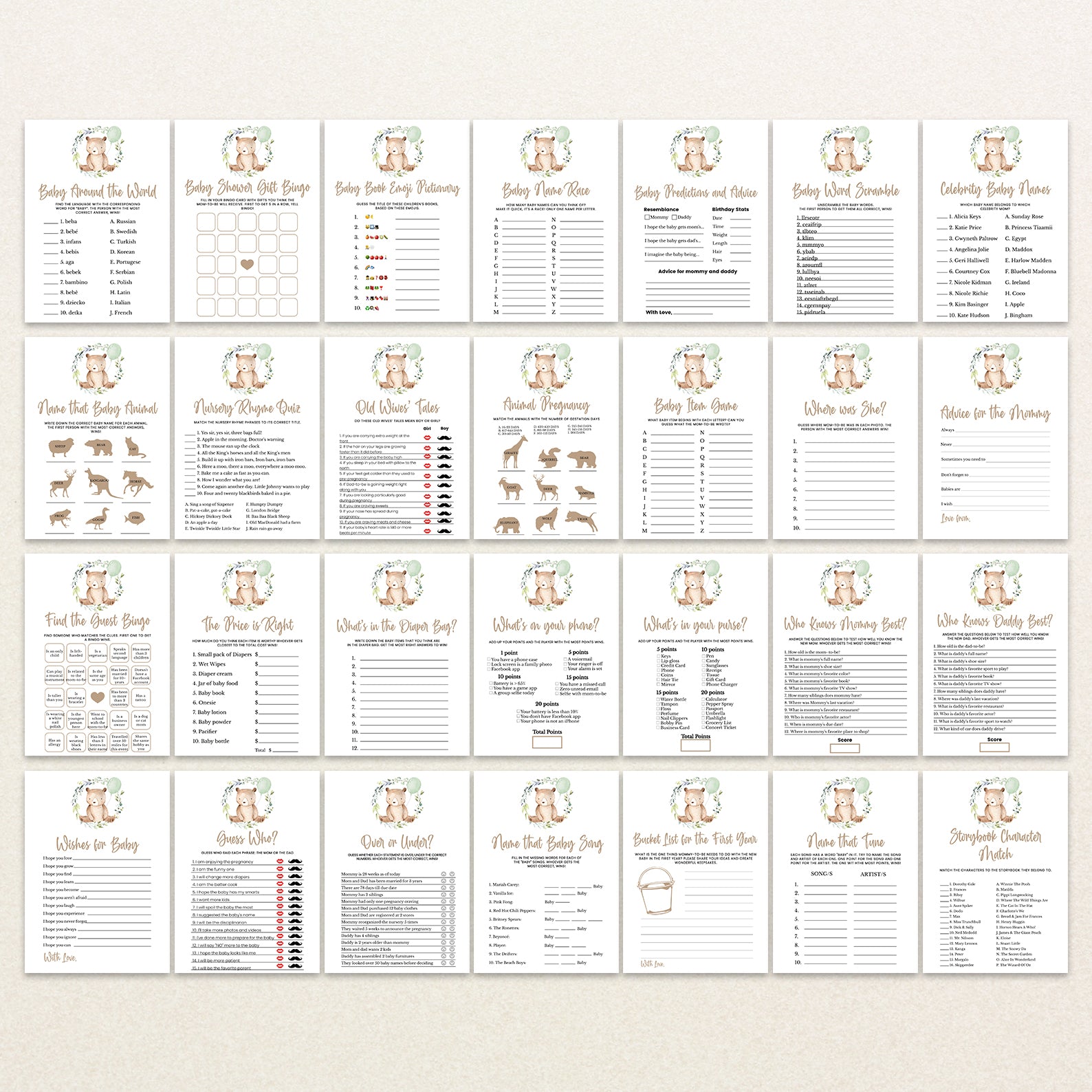 Minimalist Bear Baby Shower Digital Game Bundle Green Leaf Circle
