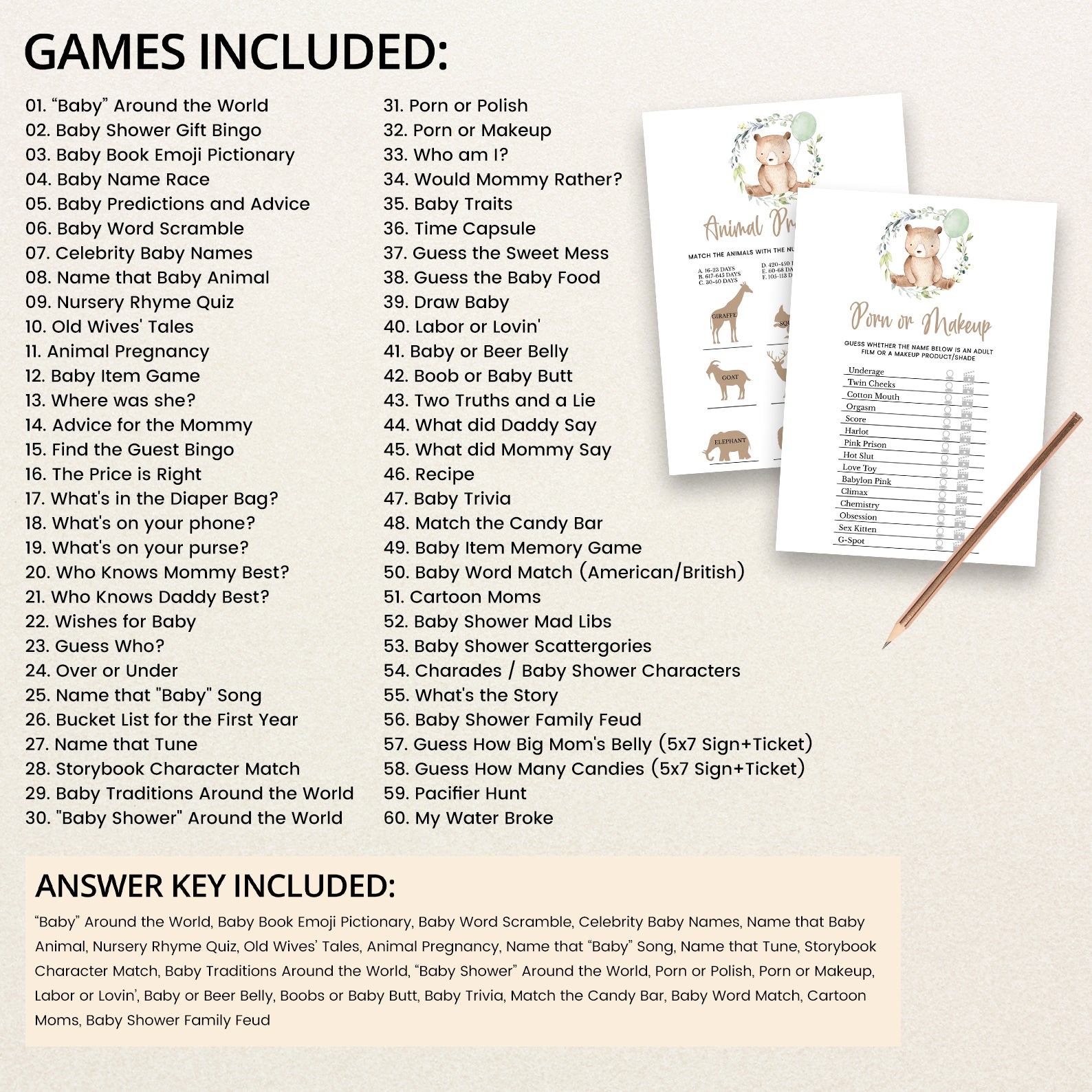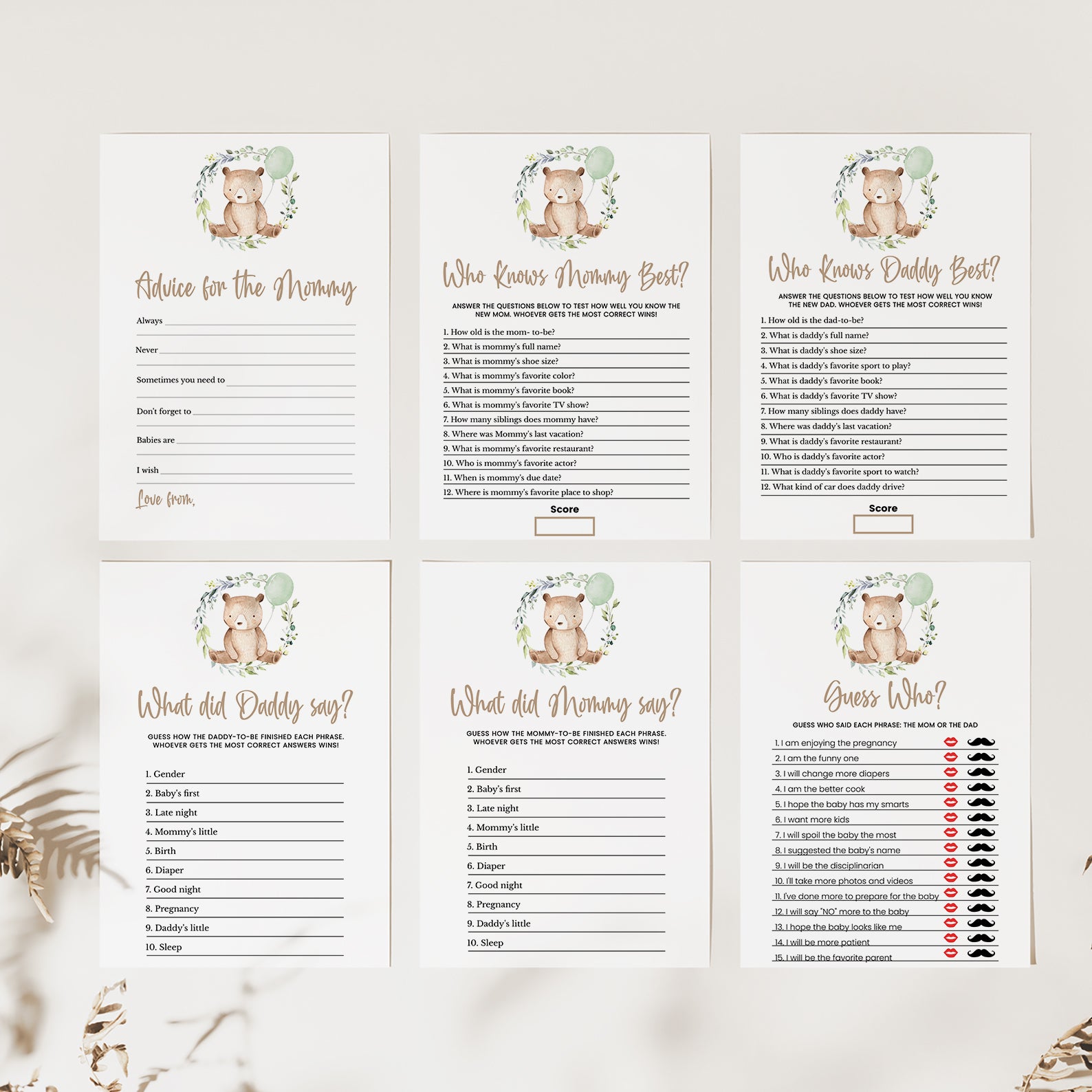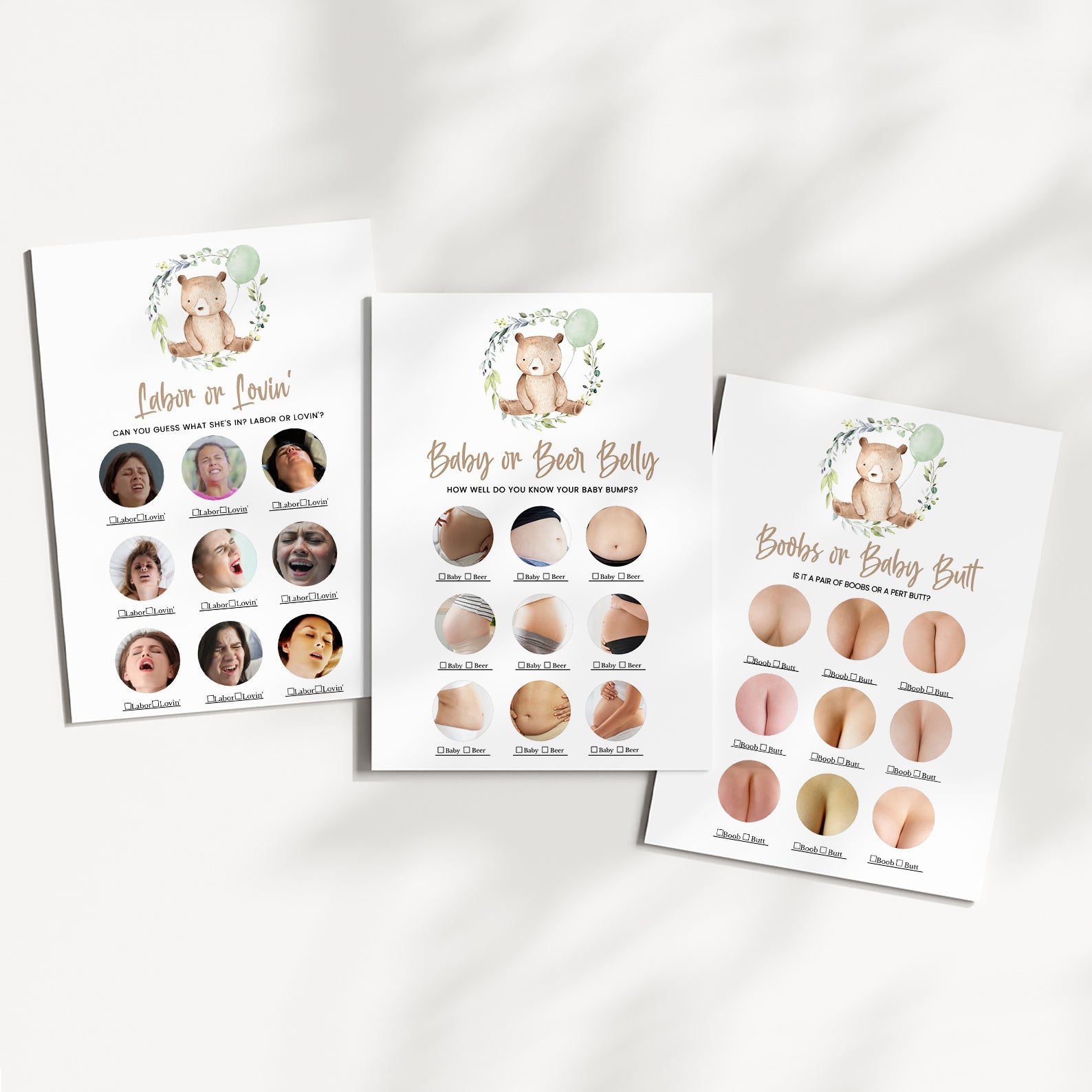 Minimalist Bear Baby Shower Digital Game Bundle Green Leaf Circle