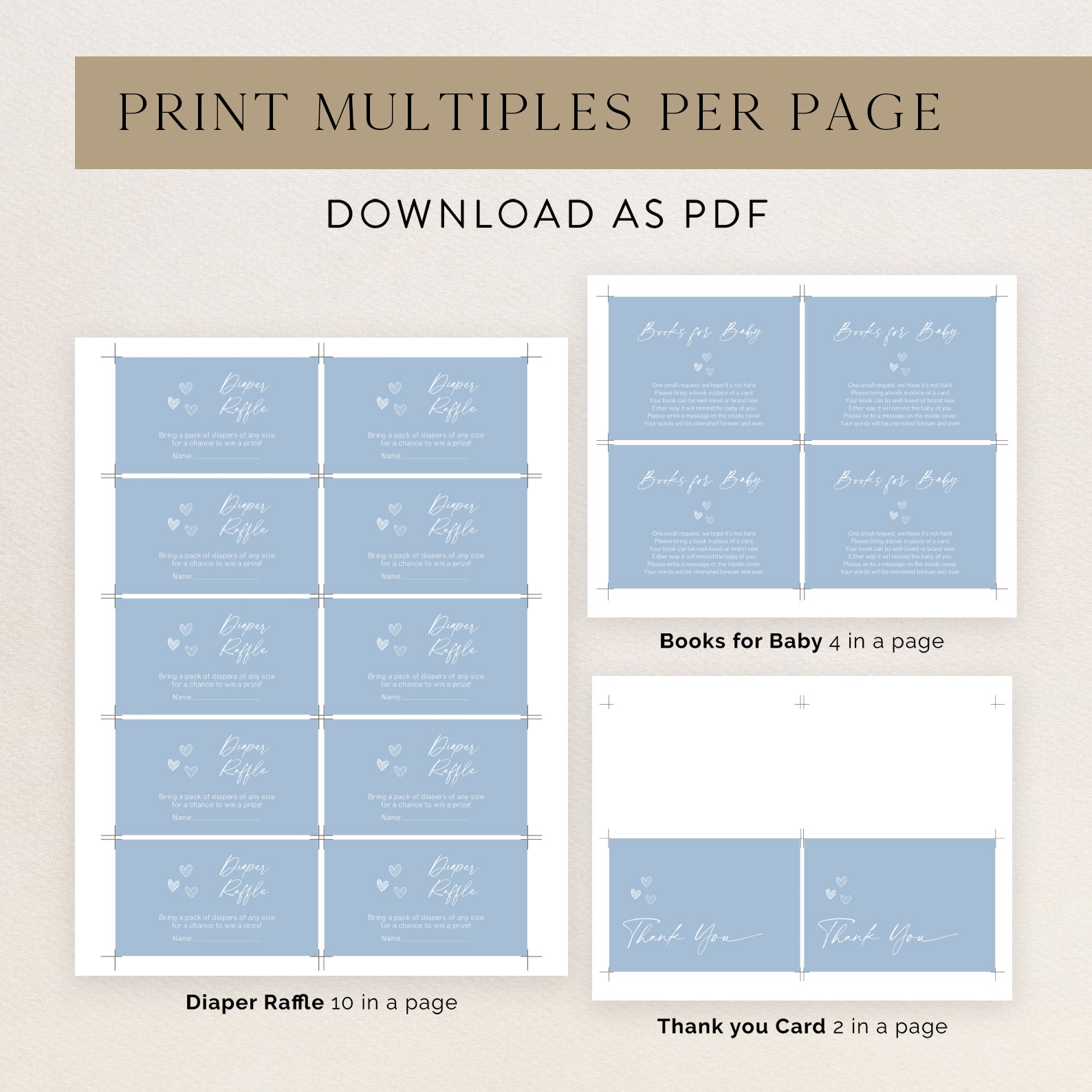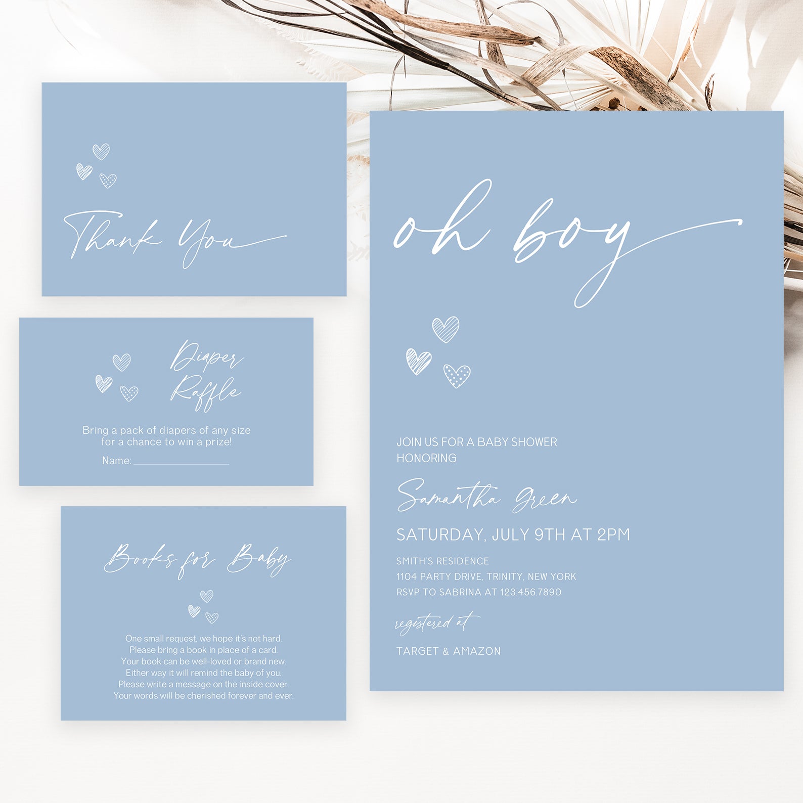 Celebrate your baby boy’s arrival with our minimalist "Oh Boy" baby shower invitation bundle. Featuring a serene blue background and simple hearts, this elegant design is perfect for modern celebrations. The bundle includes an invitation, mobile invite, diaper raffle, books for baby sign, and thank you card – all easily customizable to fit your event. Set the tone for a memorable celebration with this stylish and convenient invitation set!