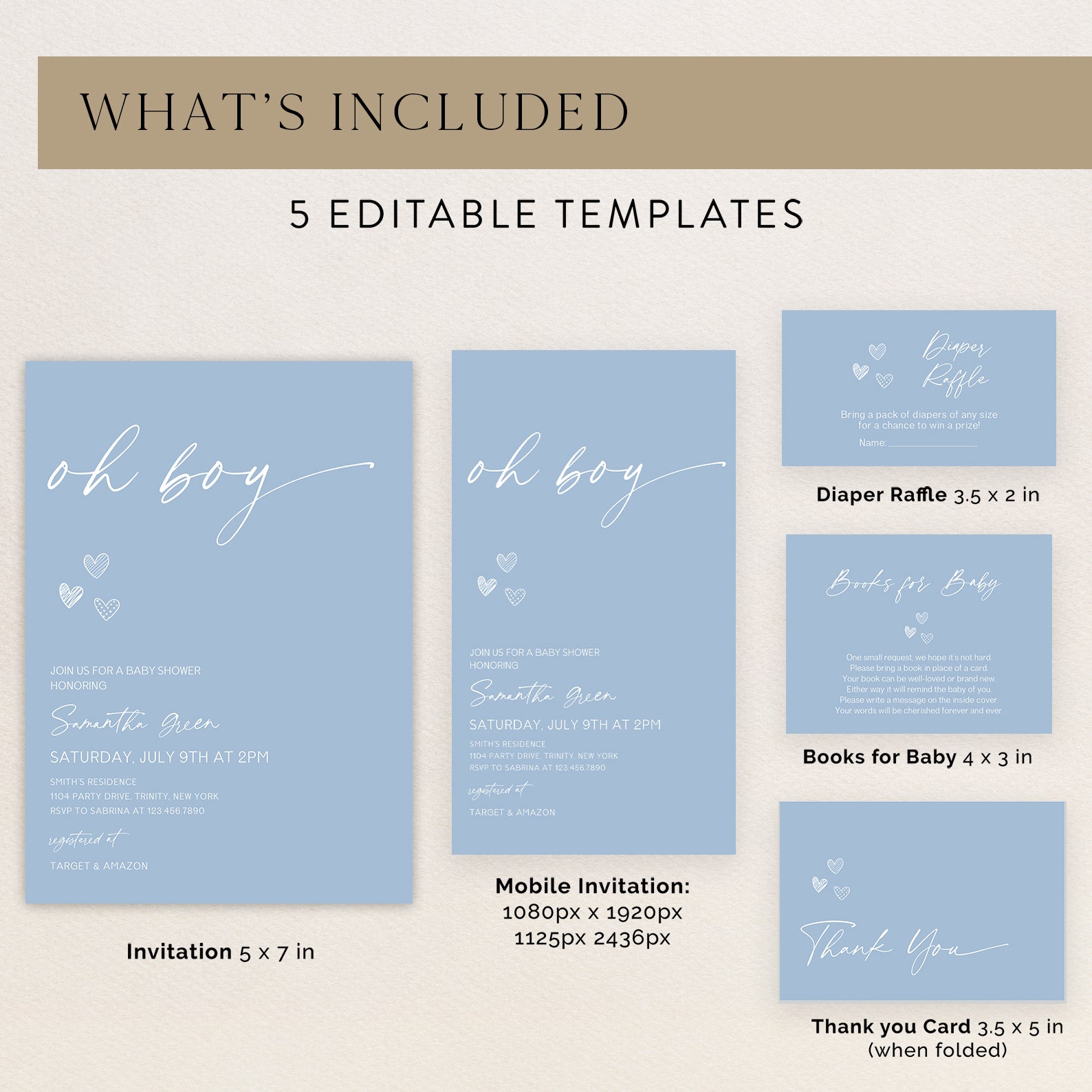 - Purchase this Minimalist Oh Boy Baby Shower Digital Invitation Bundle: Blue Hearts template