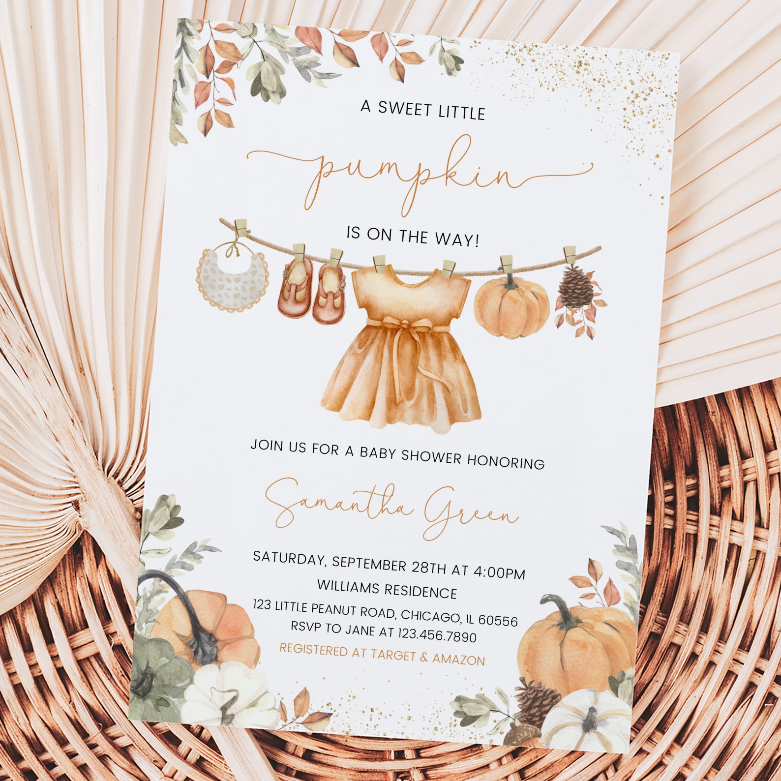 - Purchase this Orange Fall Baby Shower Invite with Leaves, Pumpkins & Gold template