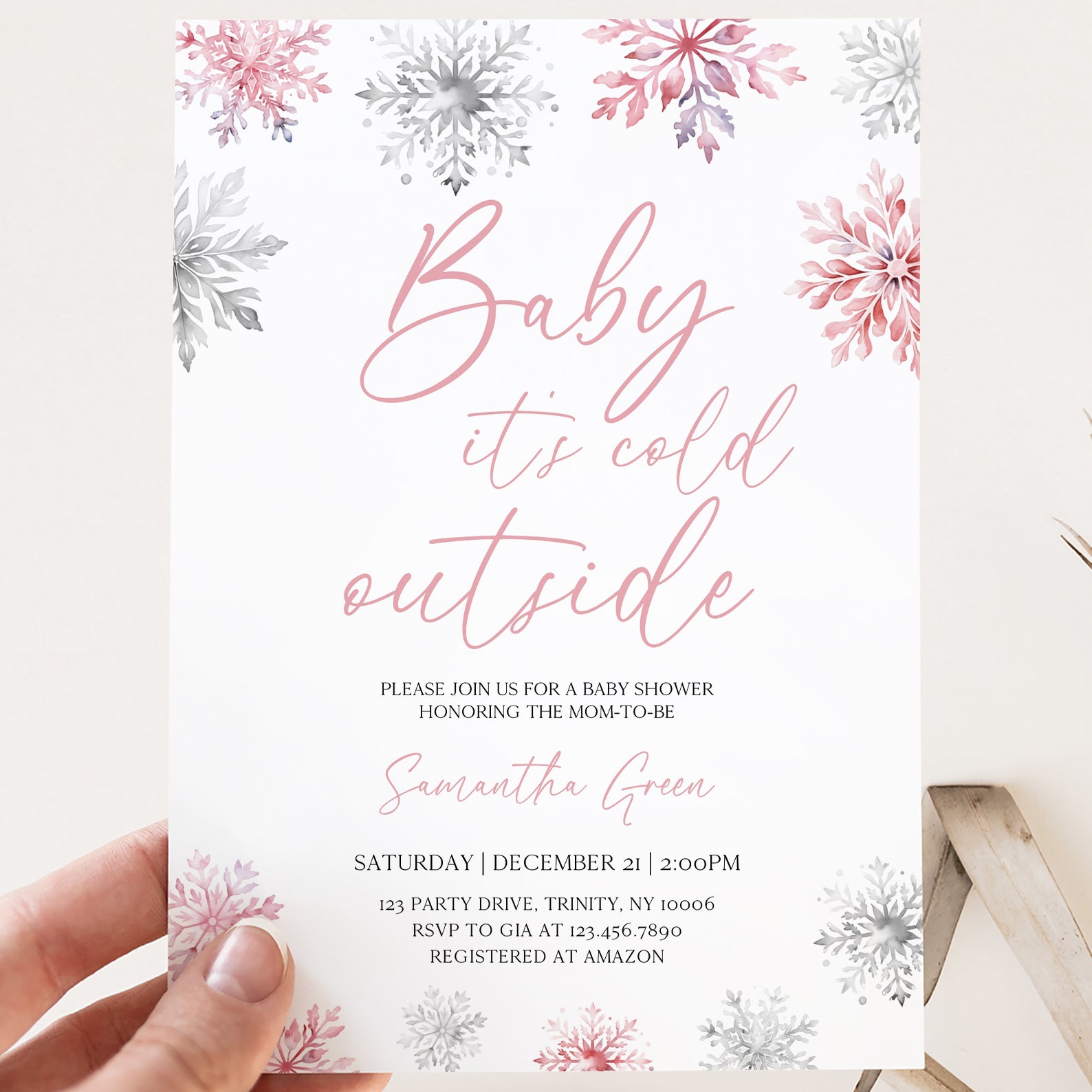 - Purchase this Pink Baby It's Cold Outside Winter Invite with Snowflakes template