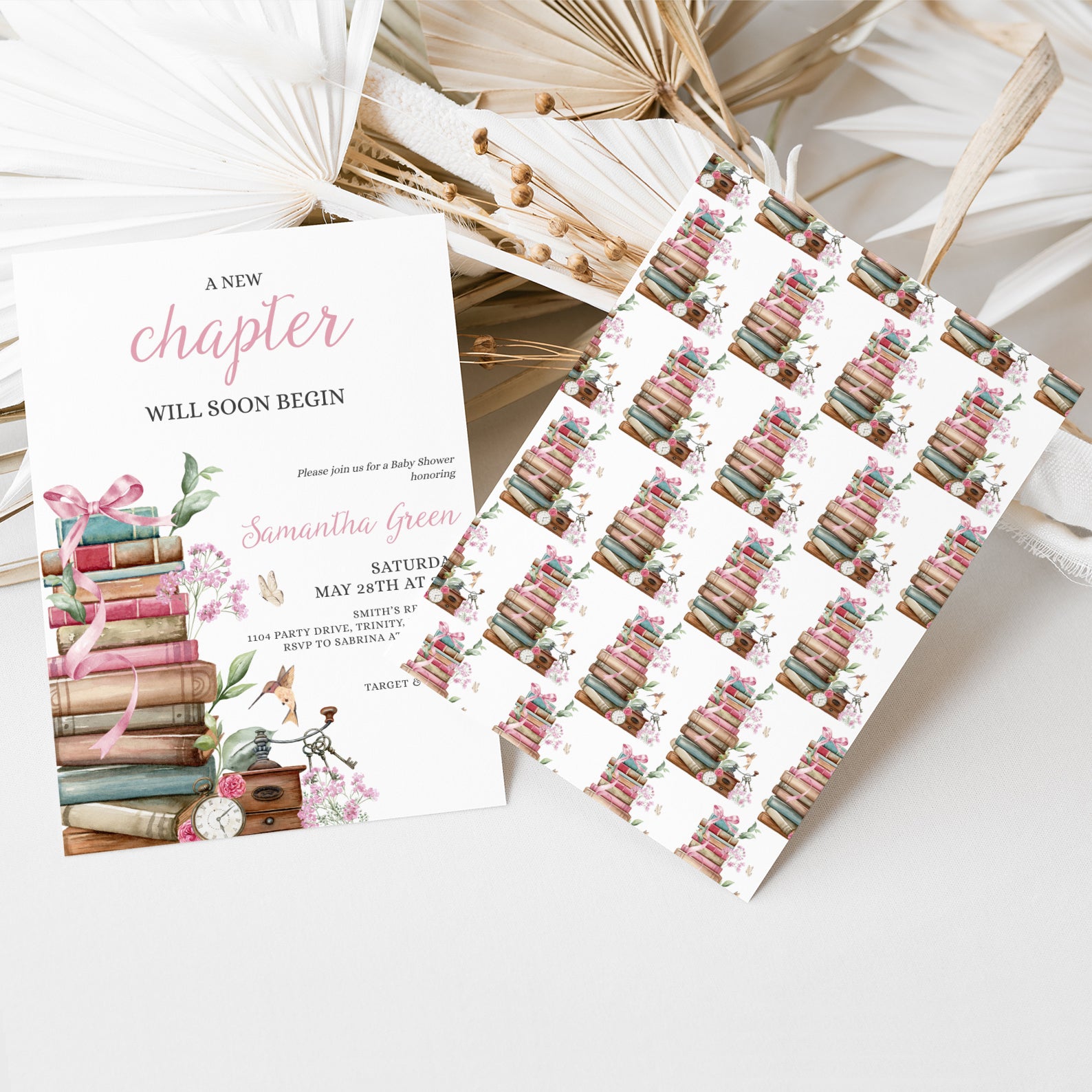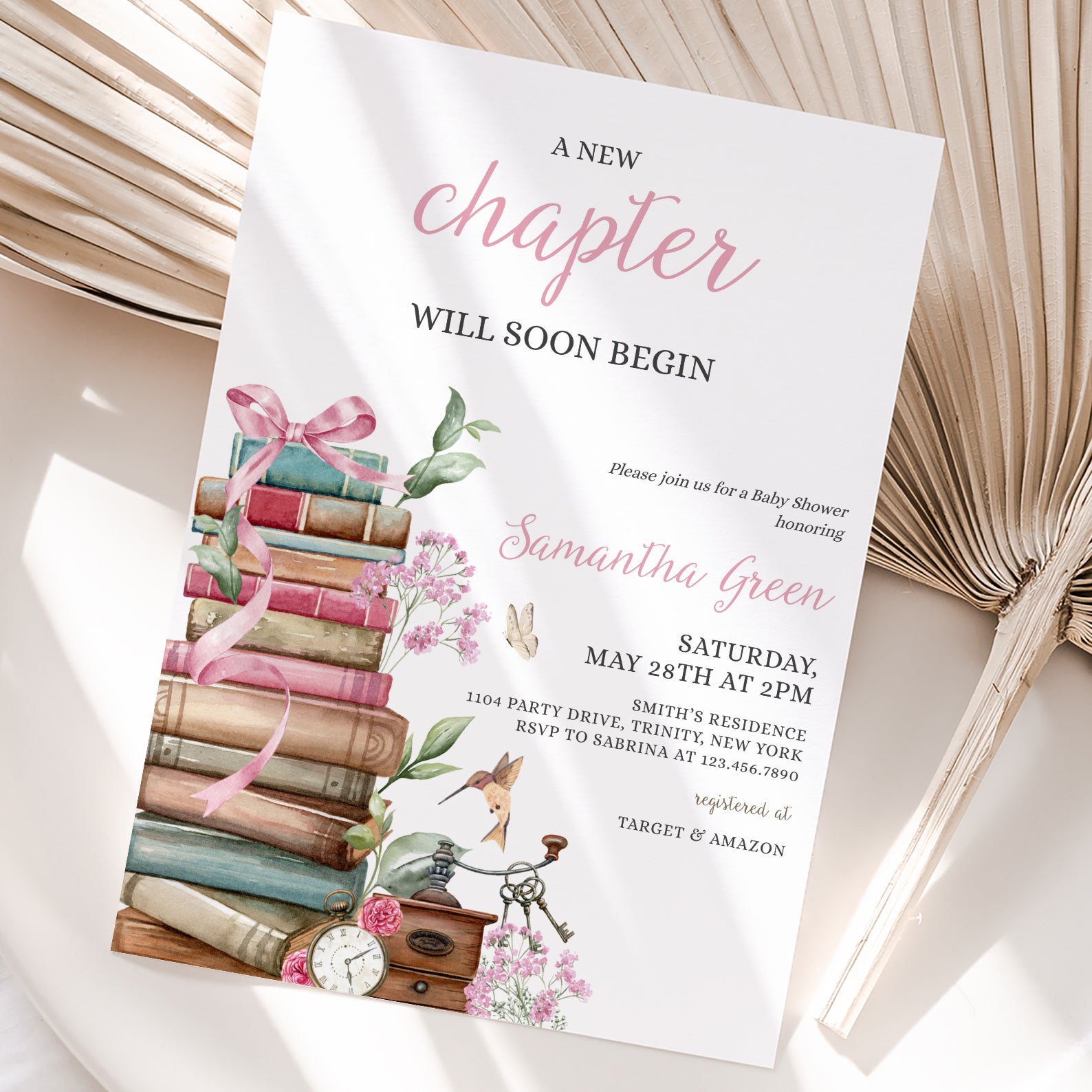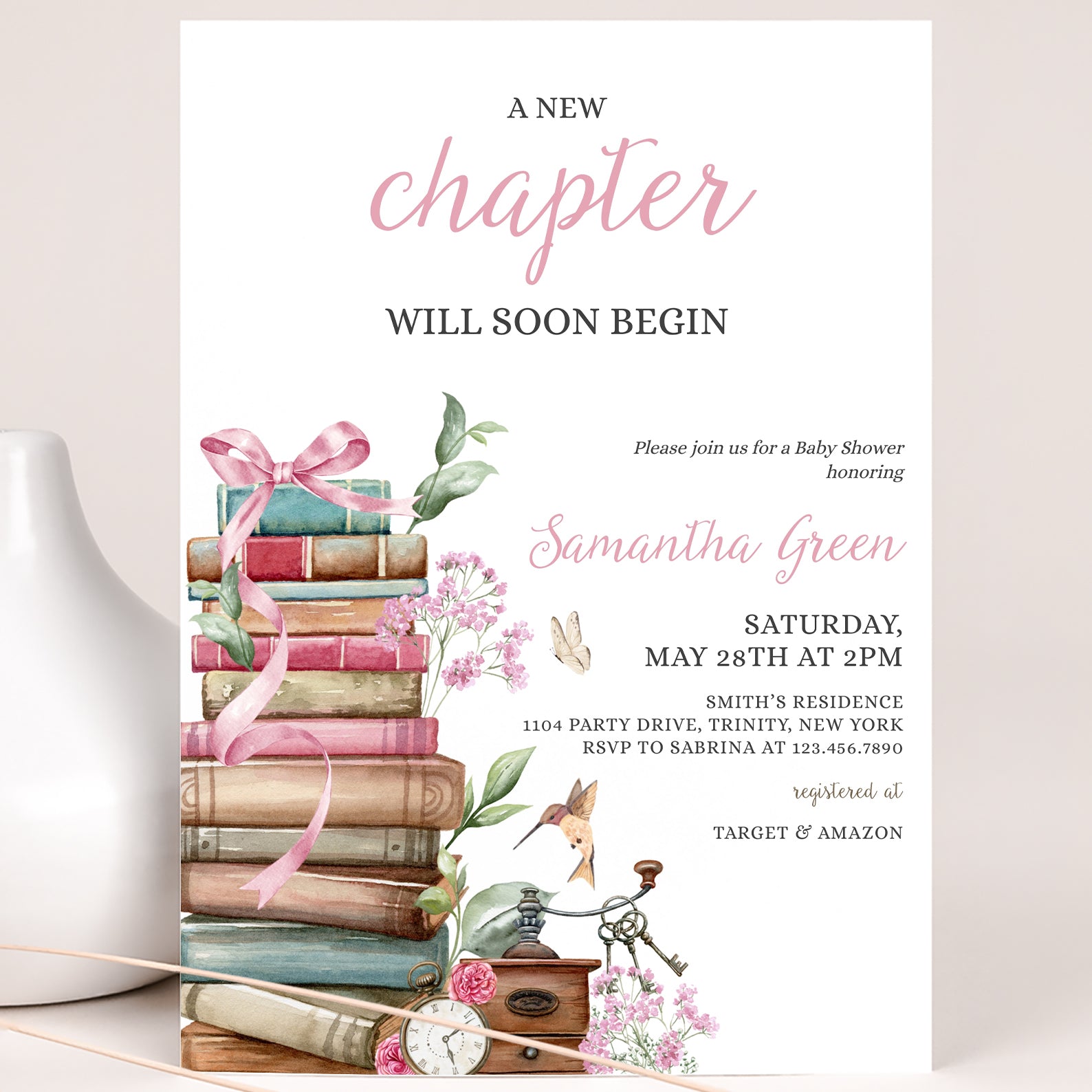 - Purchase this Pink Baby Shower Invite: Books, Florals & Vintage Charm template
