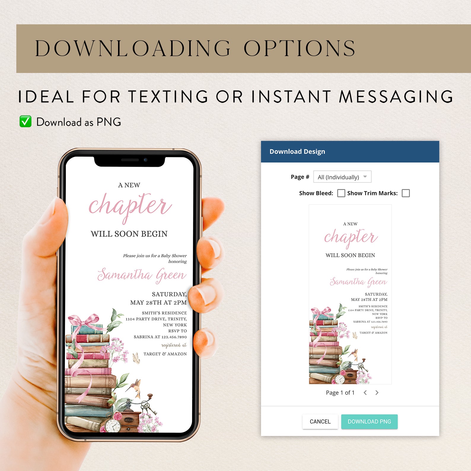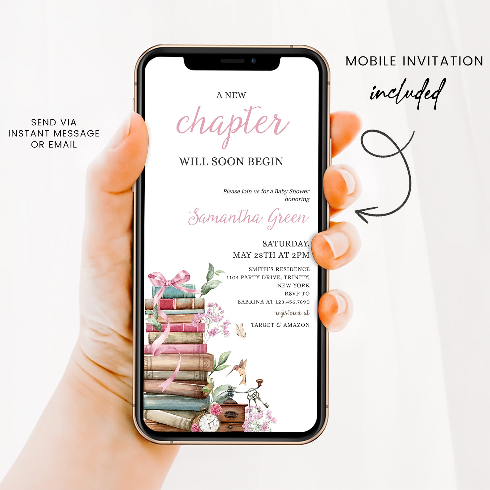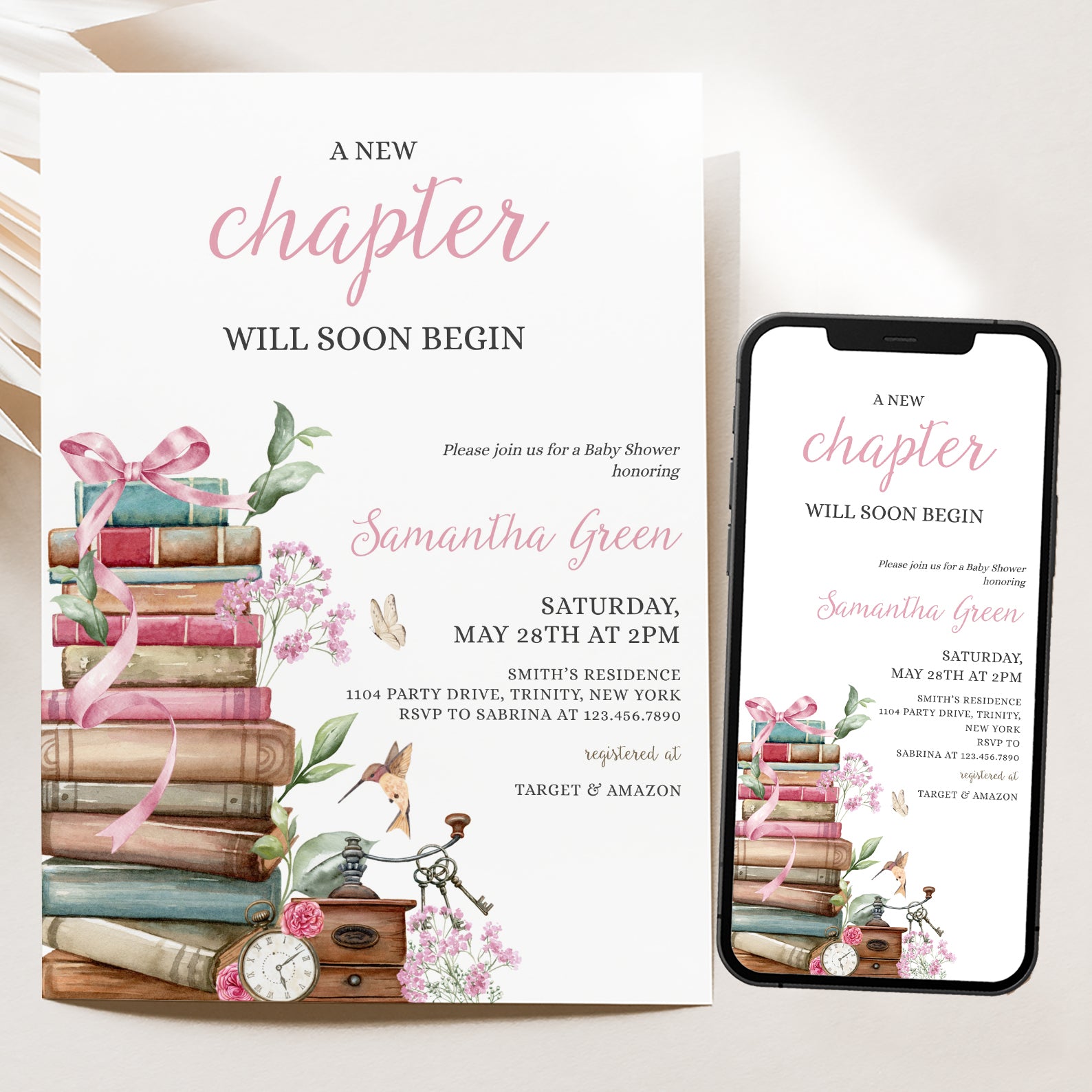 Celebrate the upcoming arrival of your little one with our enchanting pink-themed digital baby shower invitation, "A New Chapter Will Soon Begin." This beautifully designed invitation features a charming bundle of books adorned with delicate pink florals and ribbons, symbolizing the journey of parenthood. Accented by a whimsical flying bird and butterfly, along with a vintage-style clock and a mini wood drawer with keys, this invitation sets the perfect tone for your special event. Effortlessly share your joy and excitement with friends and family, making it a memorable start to your new adventure!
