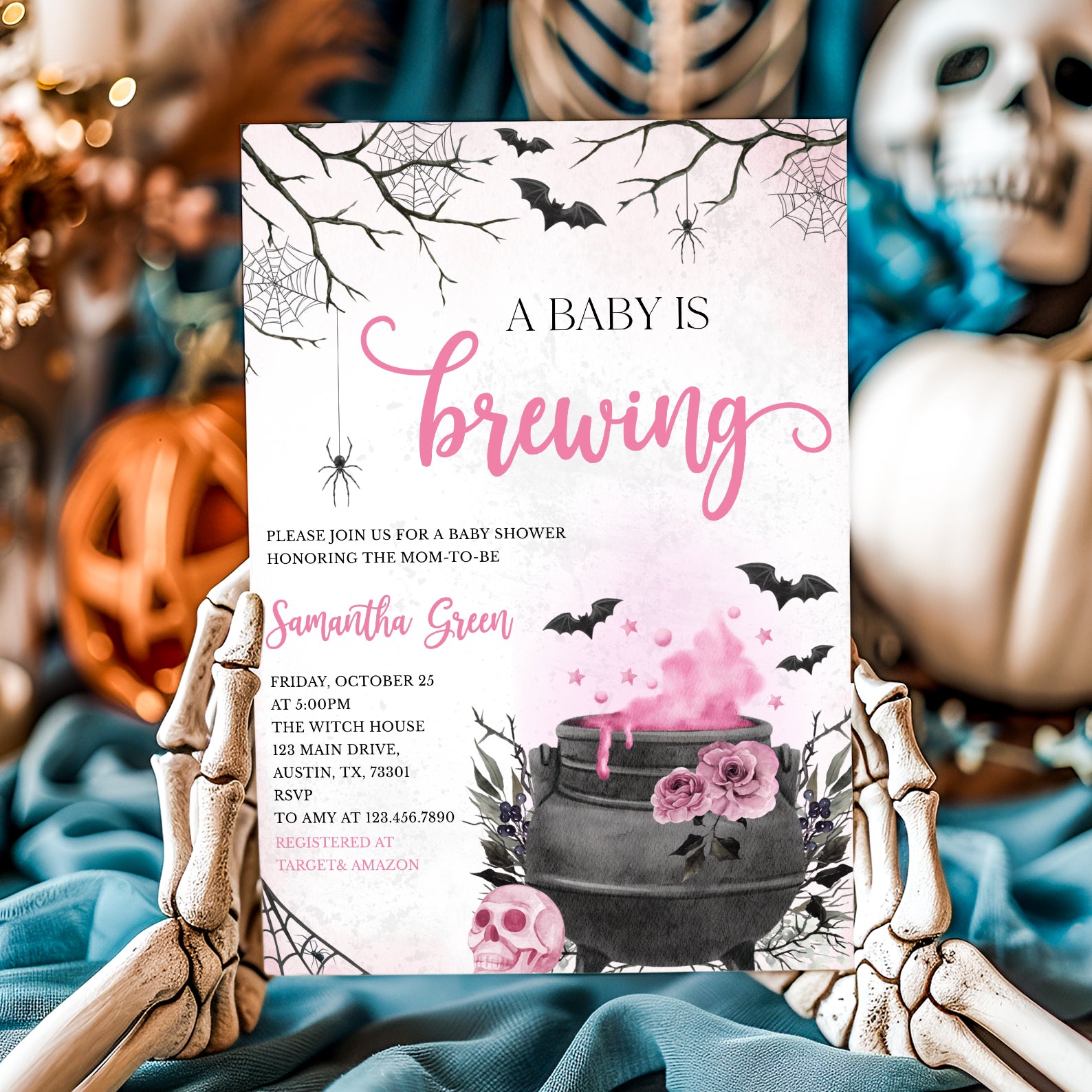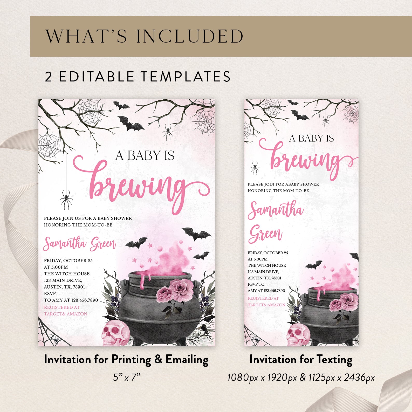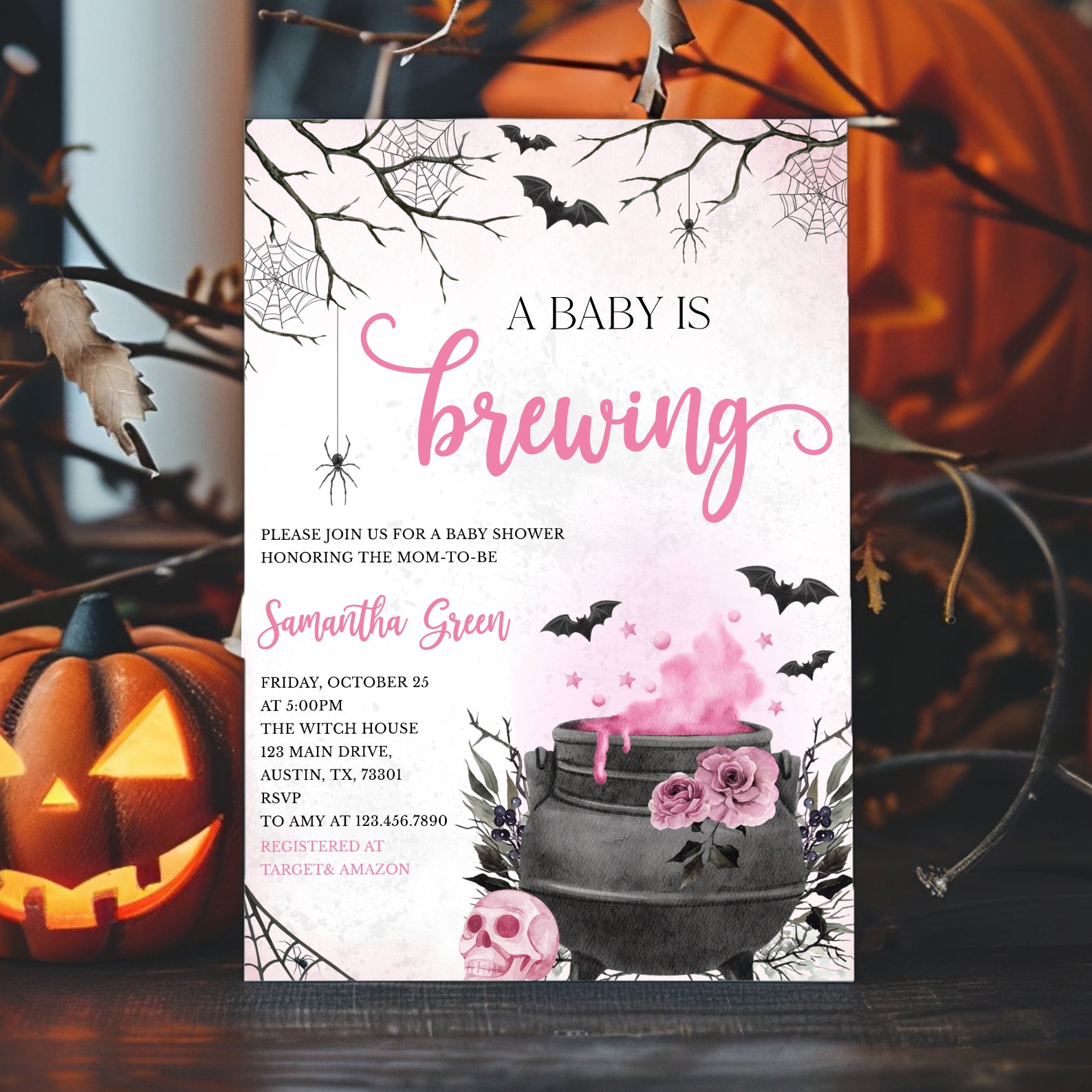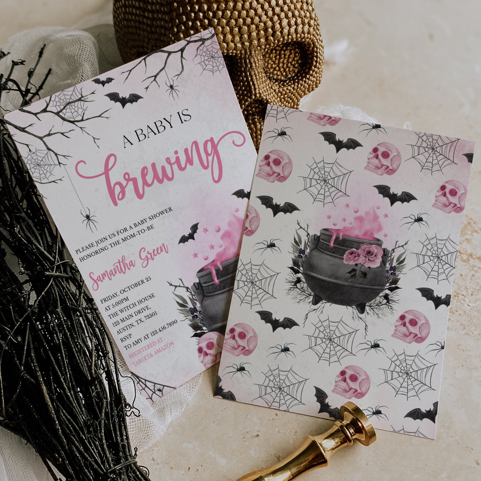 - Purchase this Pink Digital Invite: 'A Baby is Brewing' with Spooky Cauldron Fun template