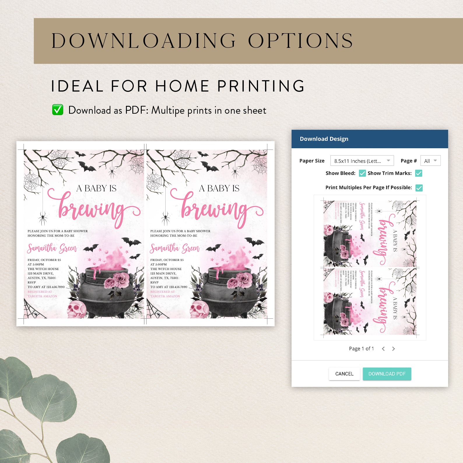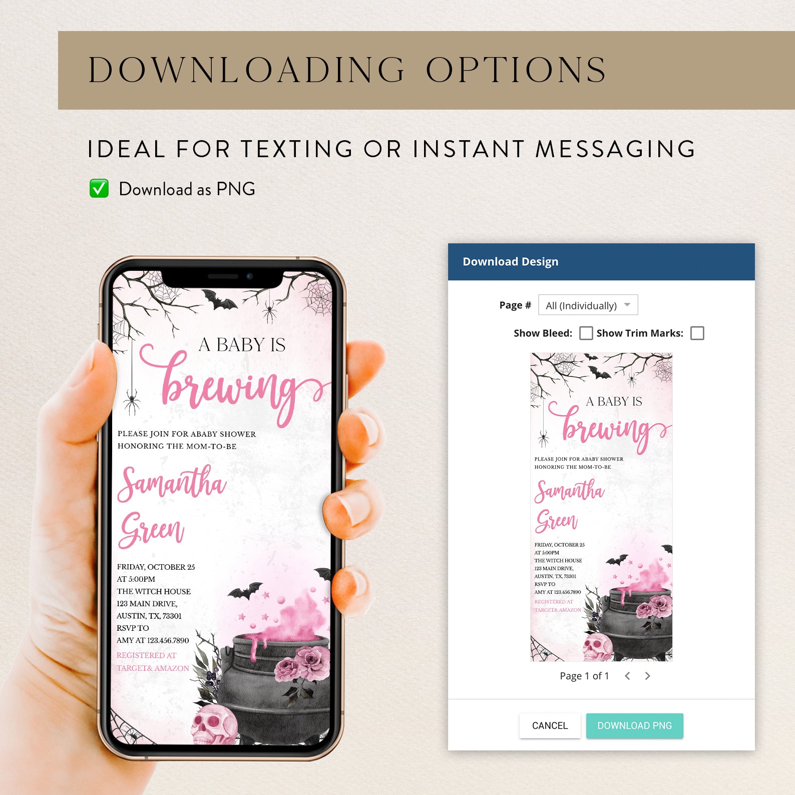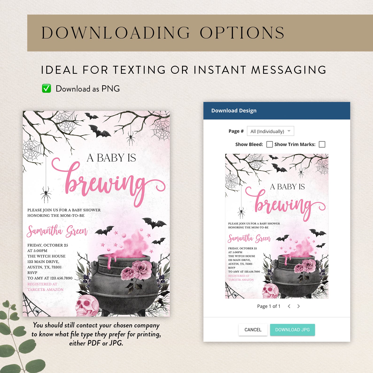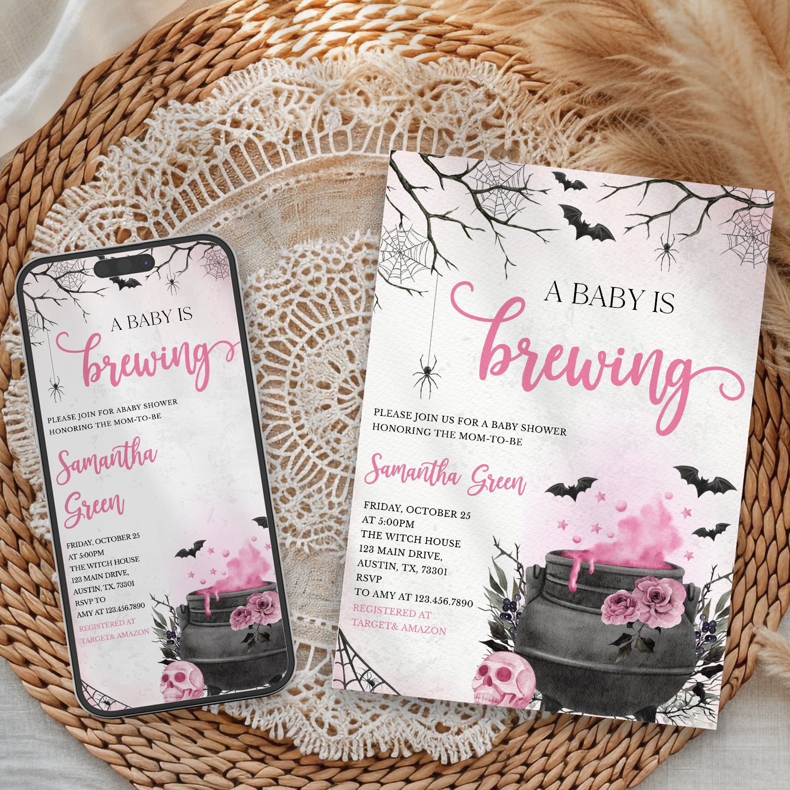 - Purchase this Pink Digital Invite: 'A Baby is Brewing' with Spooky Cauldron Fun template