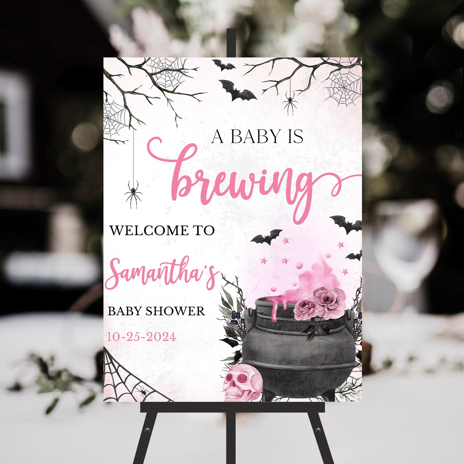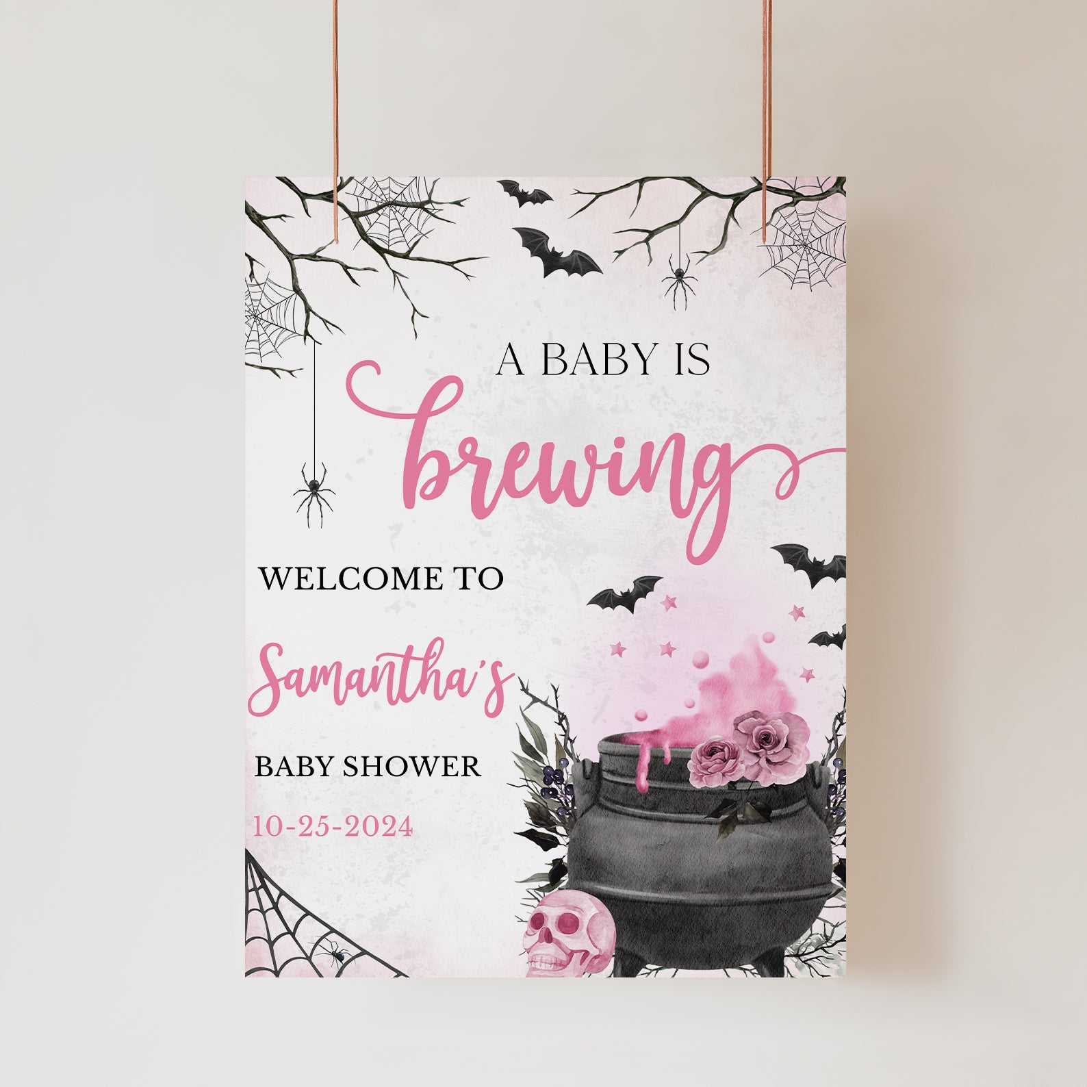 Pink Digital Welcome Sign: 'A Baby is Brewing' with Spooky Cauldron Fun