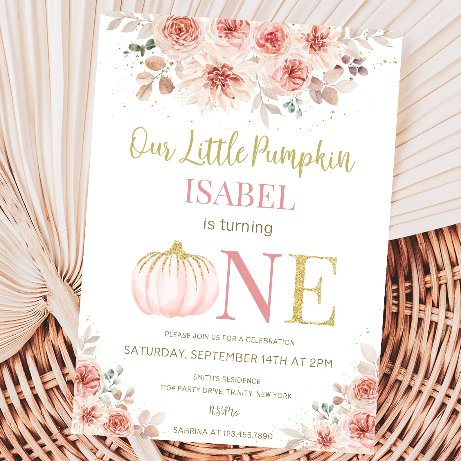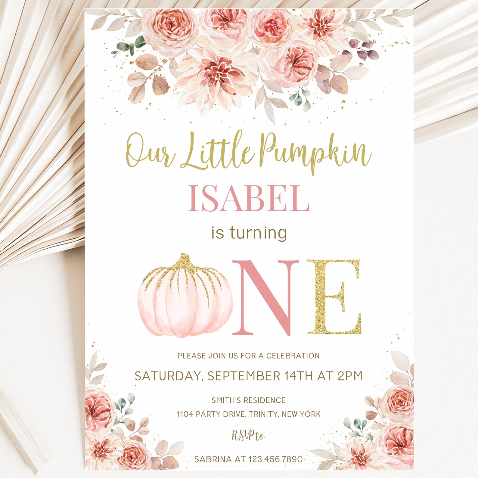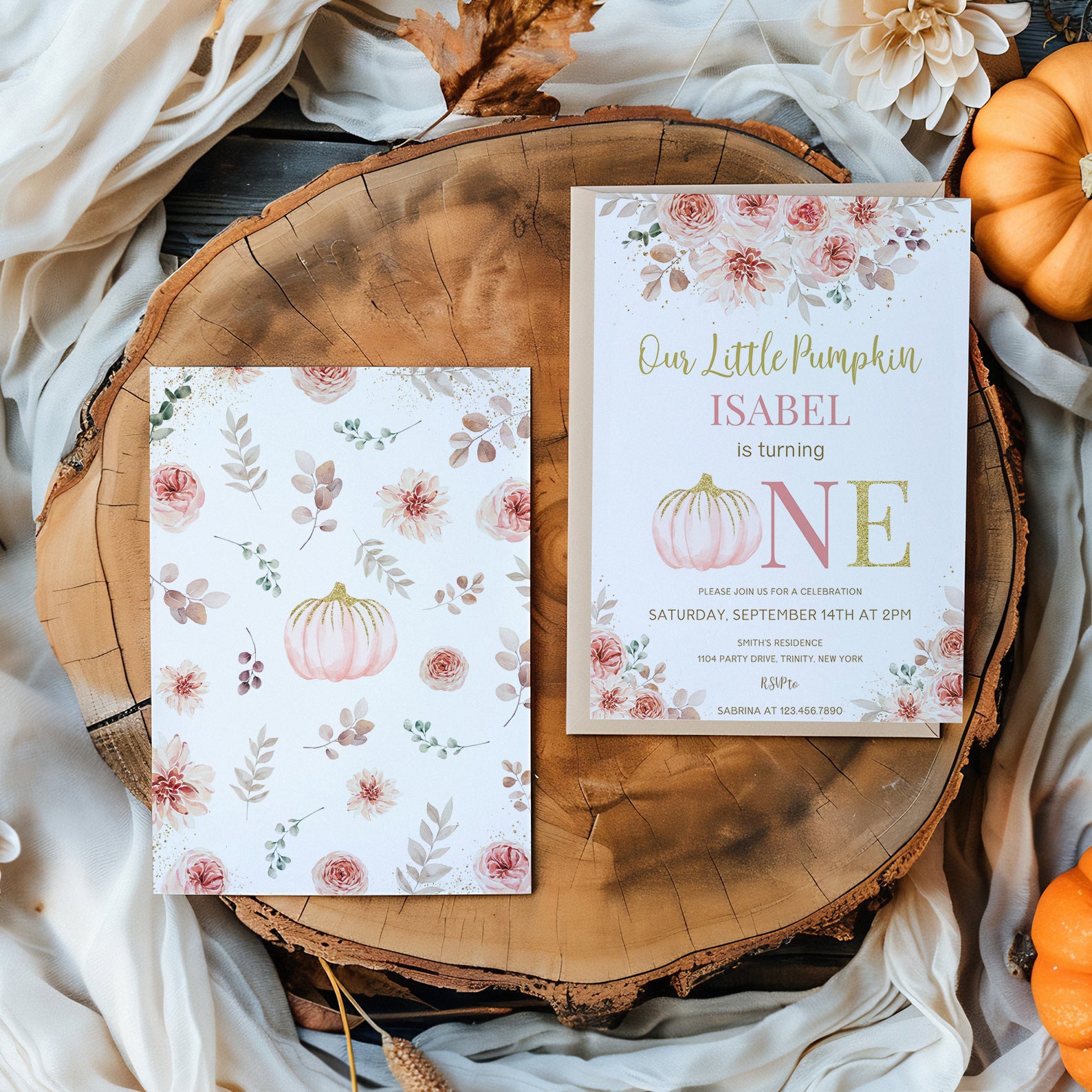 - Purchase this Pink & Gold Fall Birthday Invite: Pumpkin is Turning One template