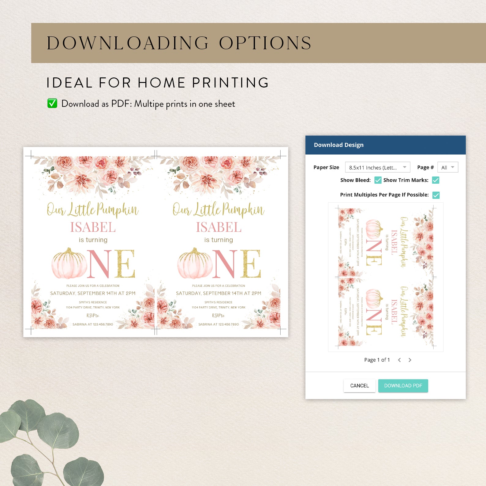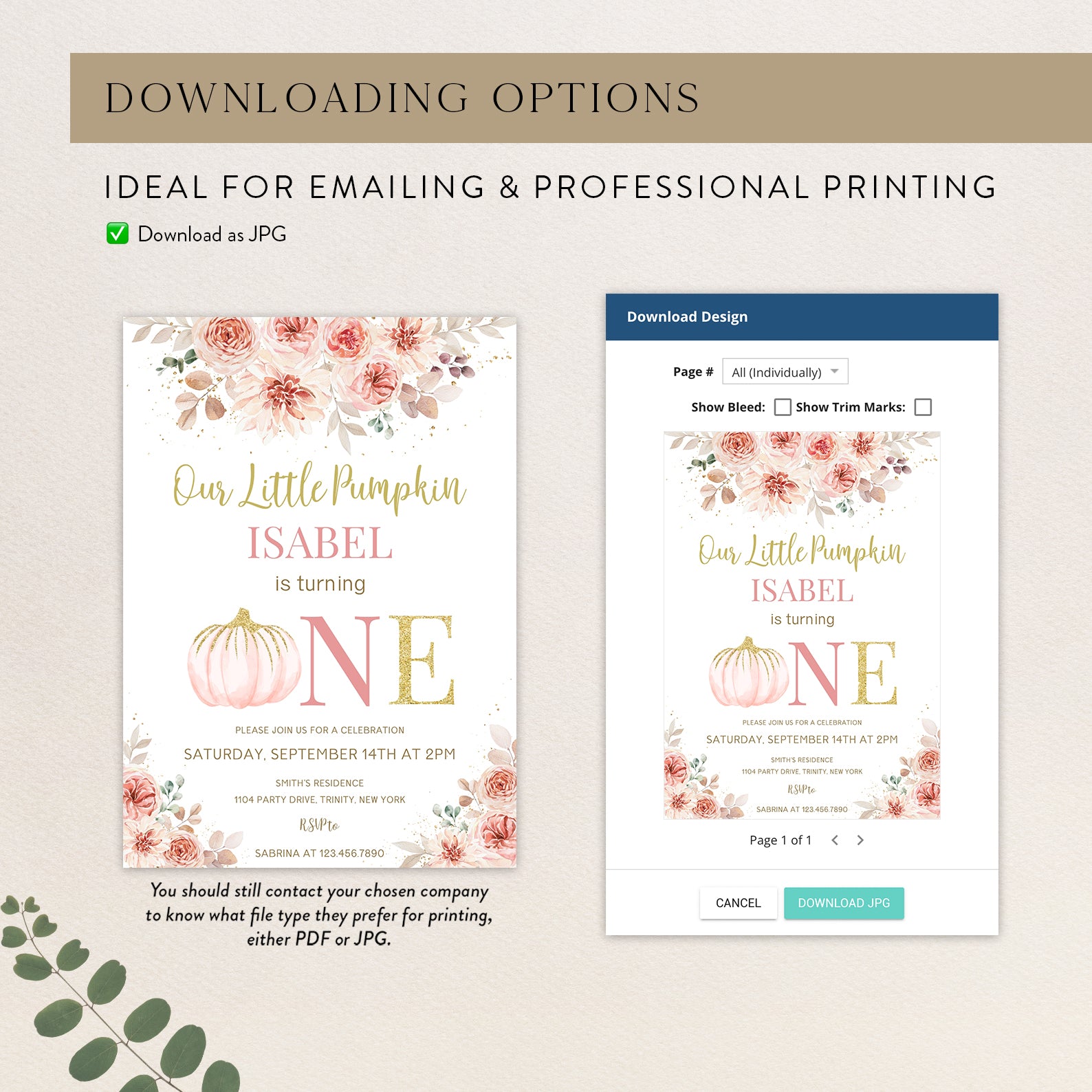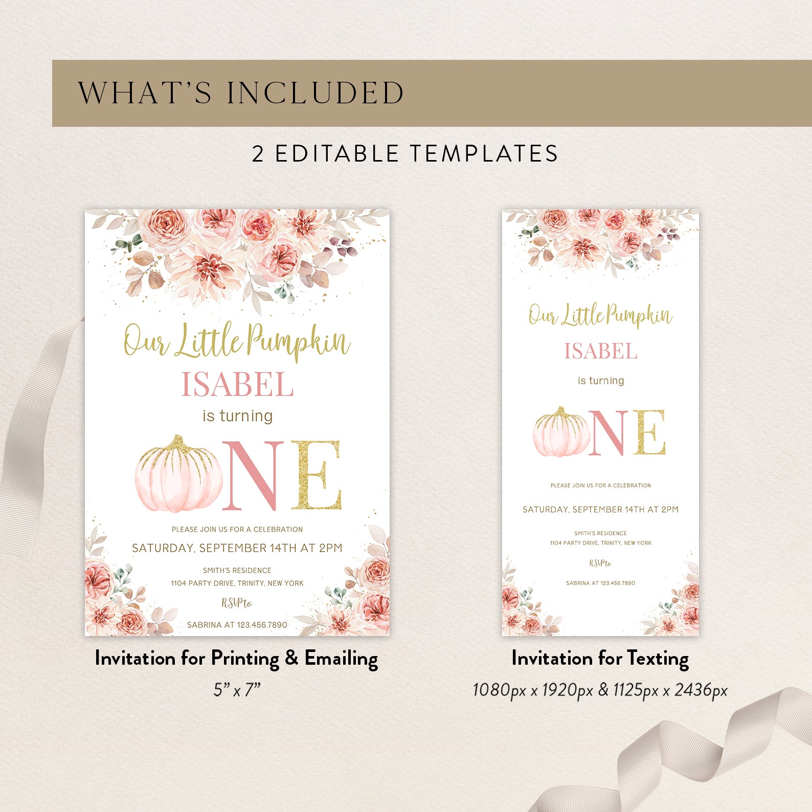 - Purchase this Pink & Gold Fall Birthday Invite: Pumpkin is Turning One template
