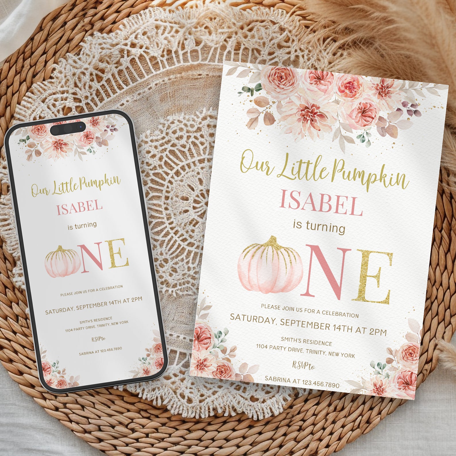 Celebrate your little pumpkin's first birthday with our enchanting fall-themed digital invitation! Adorned with delicate pink florals framing the corners and a charming pink pumpkin cleverly replacing the "o" in "one," this invitation perfectly captures the joy and warmth of autumn. Its elegant pink and gold color scheme sets the tone for a delightful celebration, making it easy to share the excitement with family and friends. Make your child's special day unforgettable with this beautifully designed invitation that combines whimsy and sophistication!