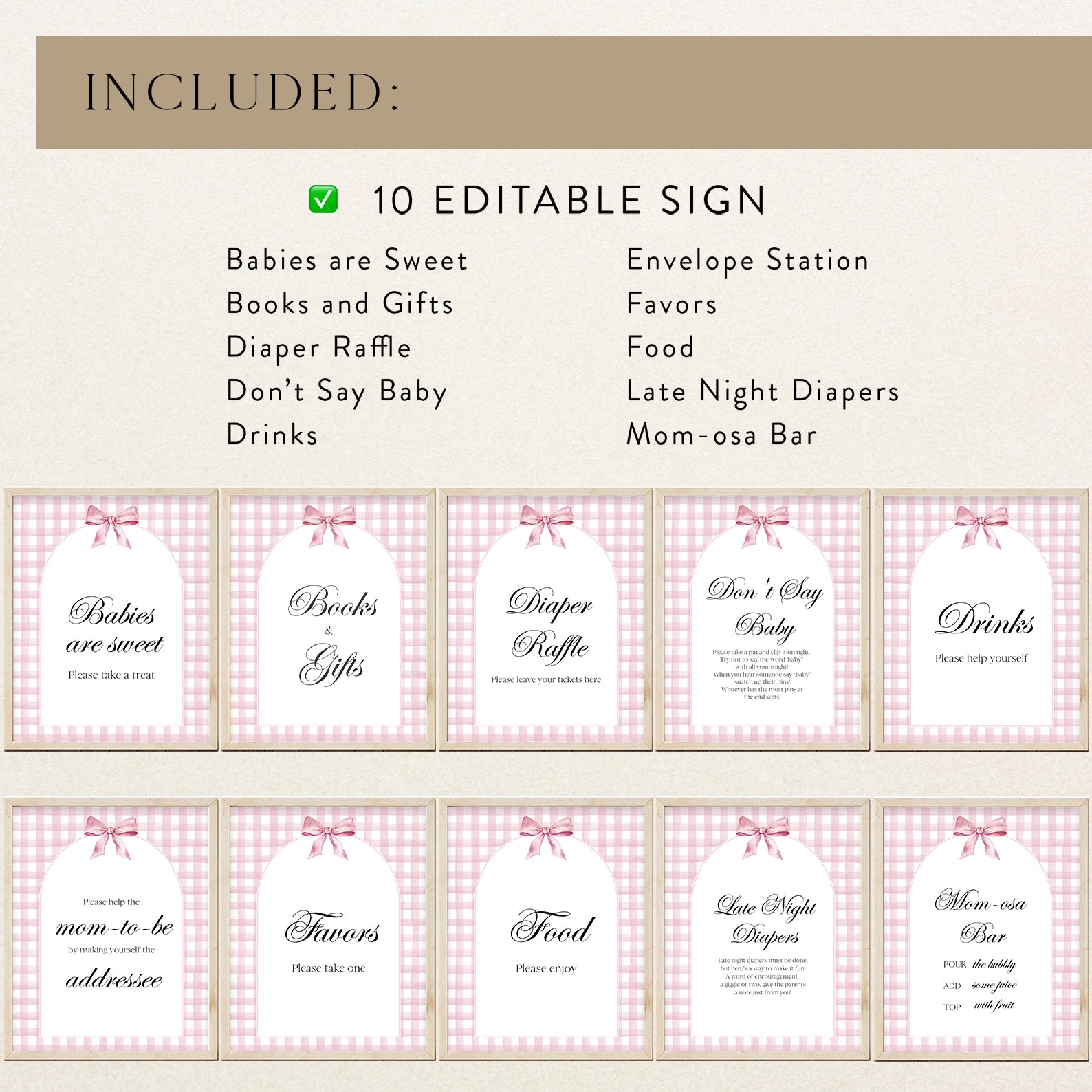 Complete your baby shower décor with this set of ten editable table signs, available in blue or pink themes. Featuring an elegant arch-shaped design, a stylish plaid background, and a delicate ribbon accent, these signs add a touch of sophistication to your celebration. The set includes Balloons, Drinks, Envelope Station, Favors, Food, Late Night Diapers, Mom-osa Bar, Babies Are Sweet, Gifts, and Welcome—perfect for creating a cohesive and inviting atmosphere for your special day!