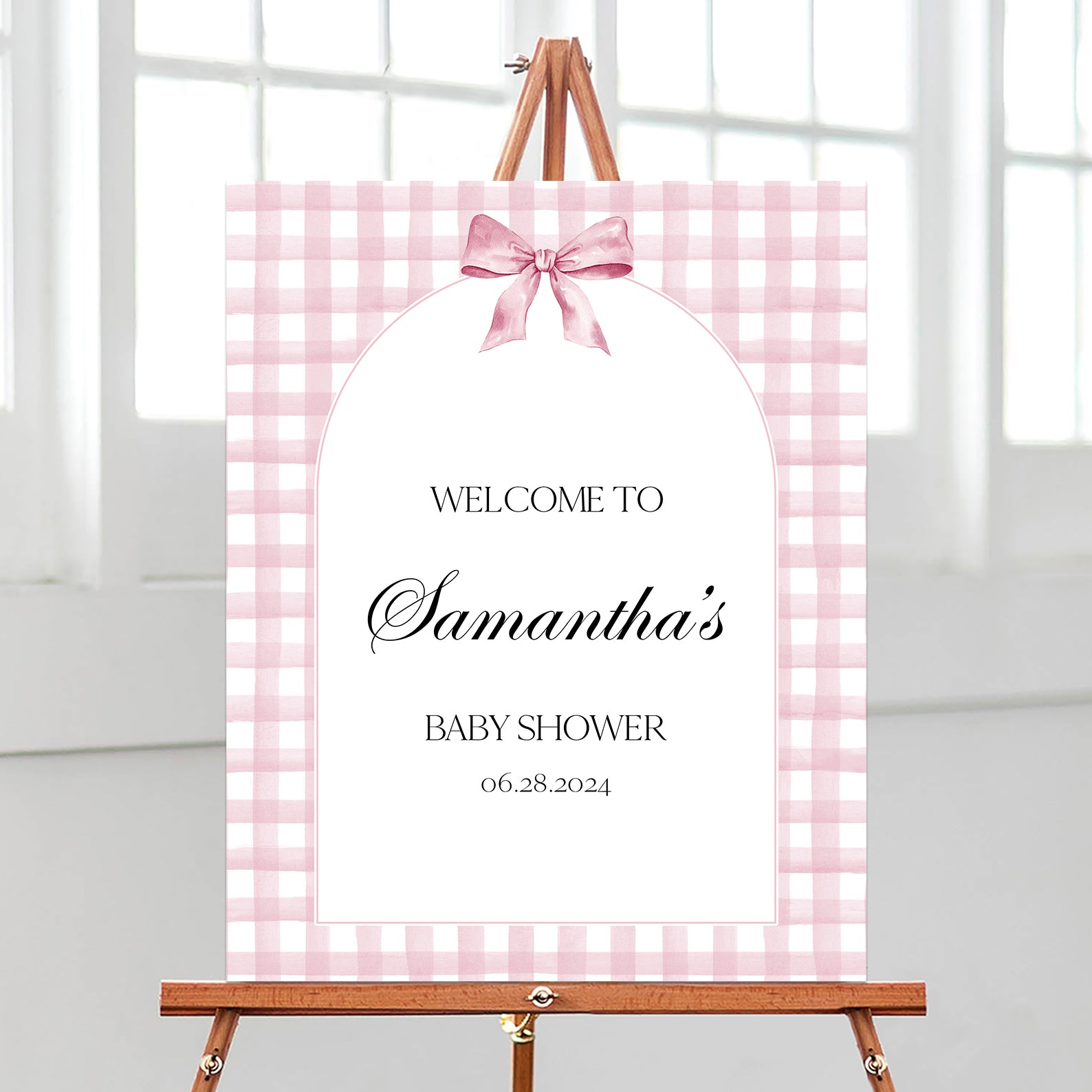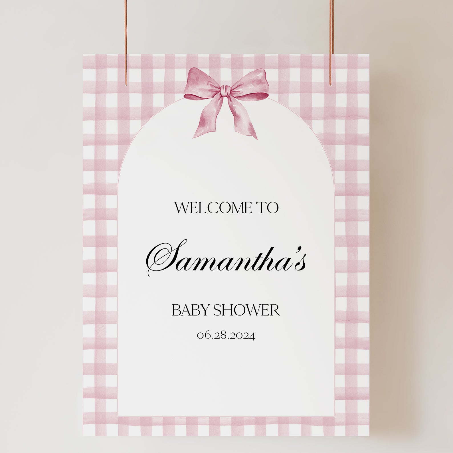 1. Purchase this Pink Plaid Baby Shower Welcome Sign with Arch & Ribbon Design template