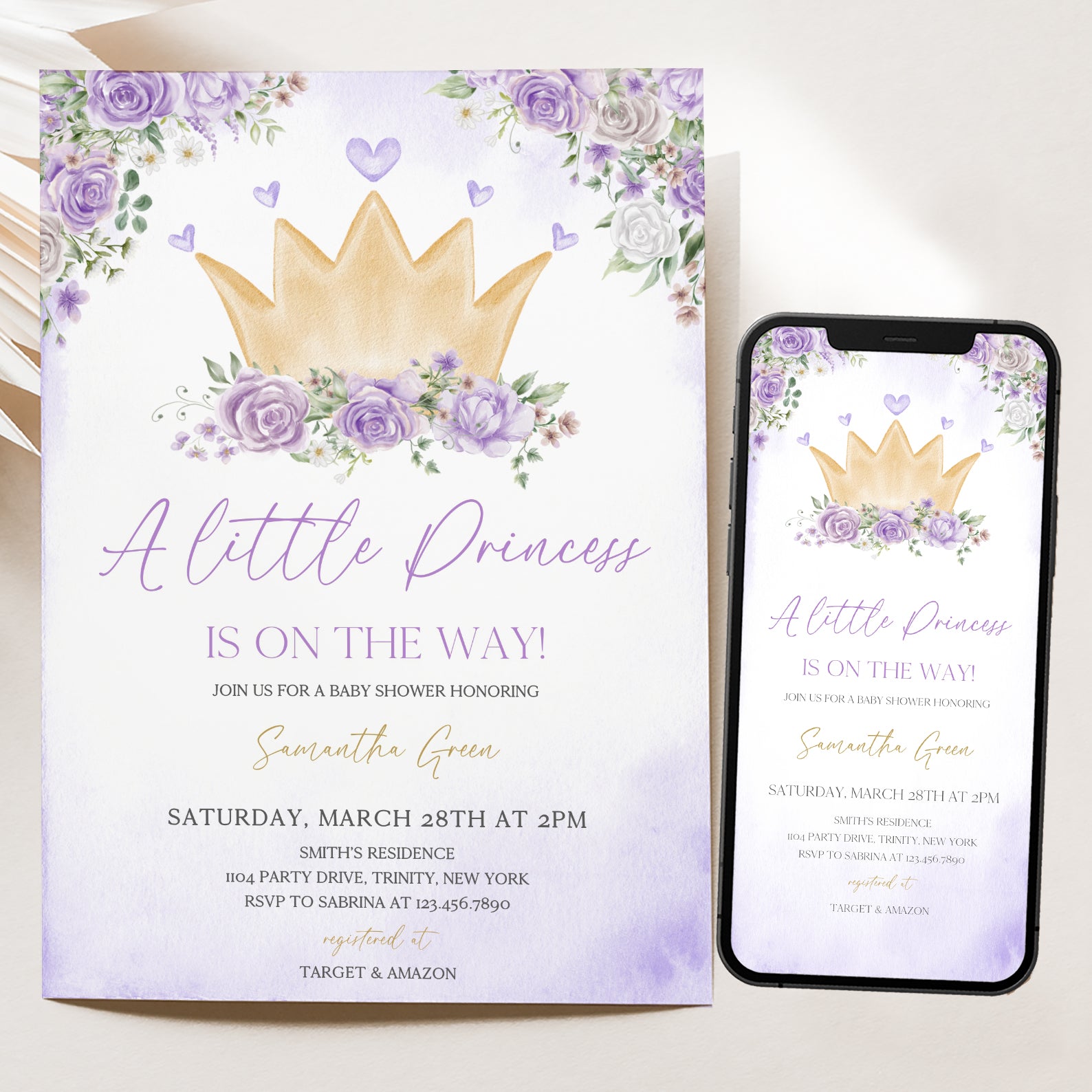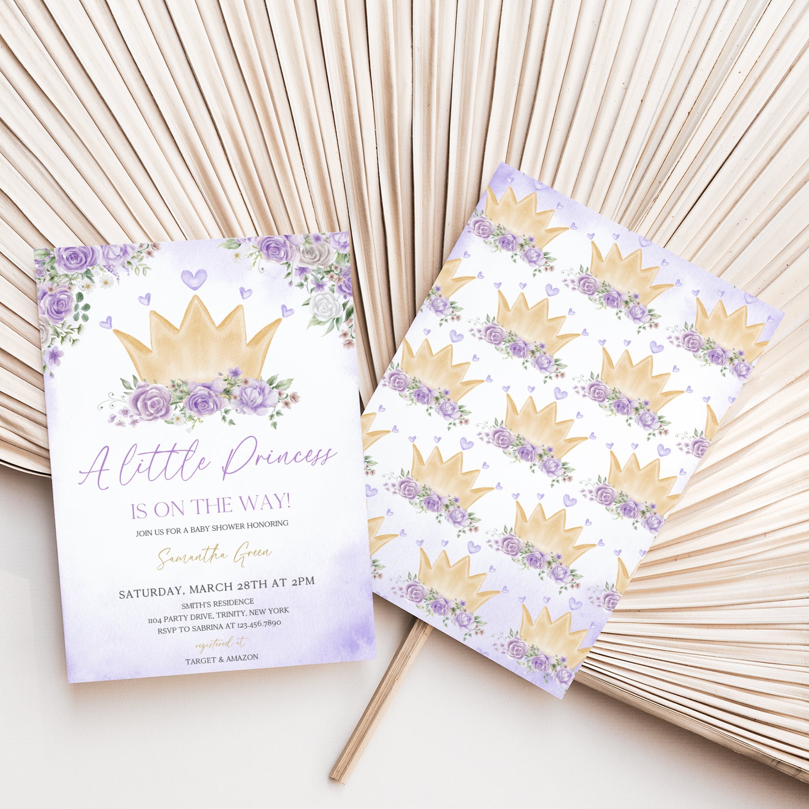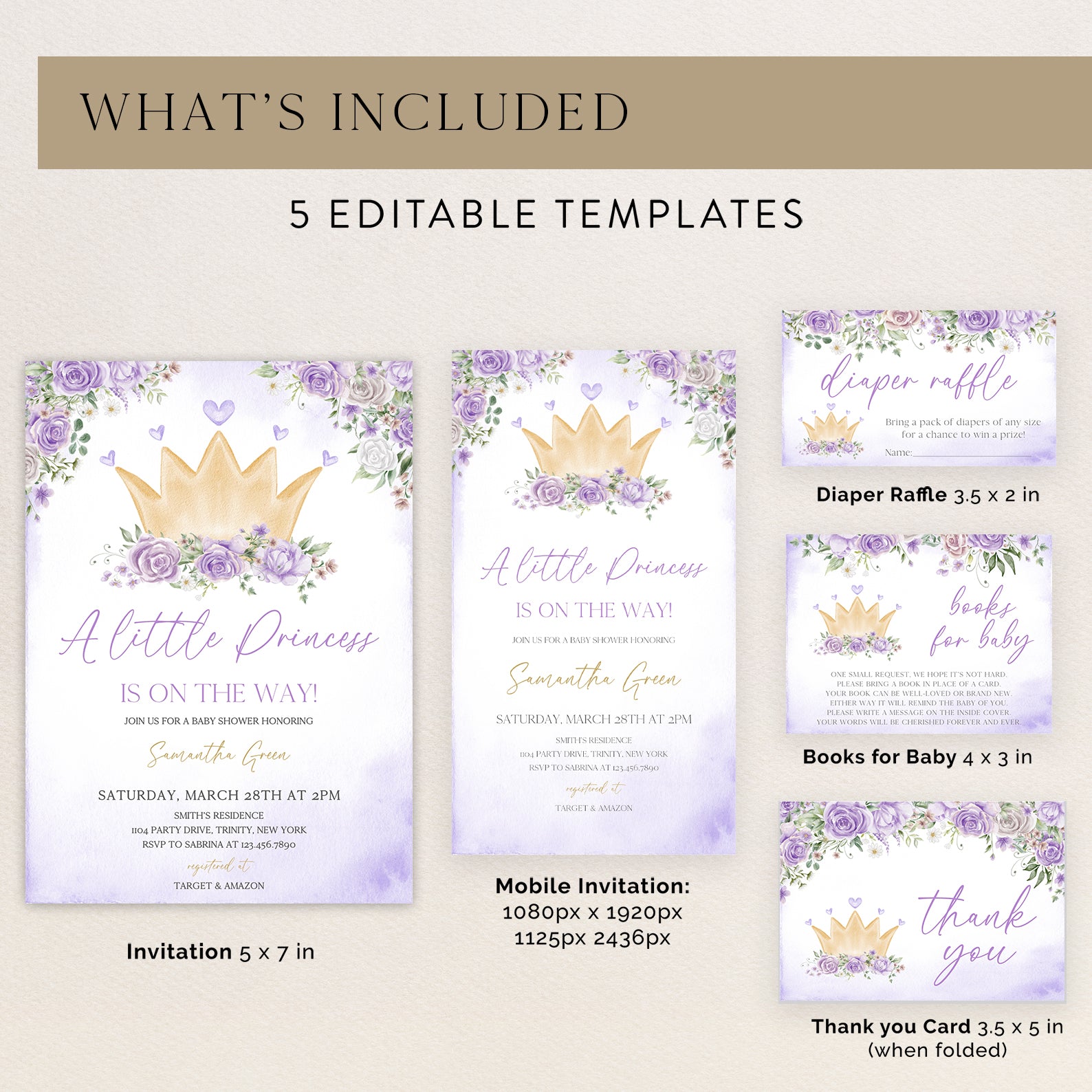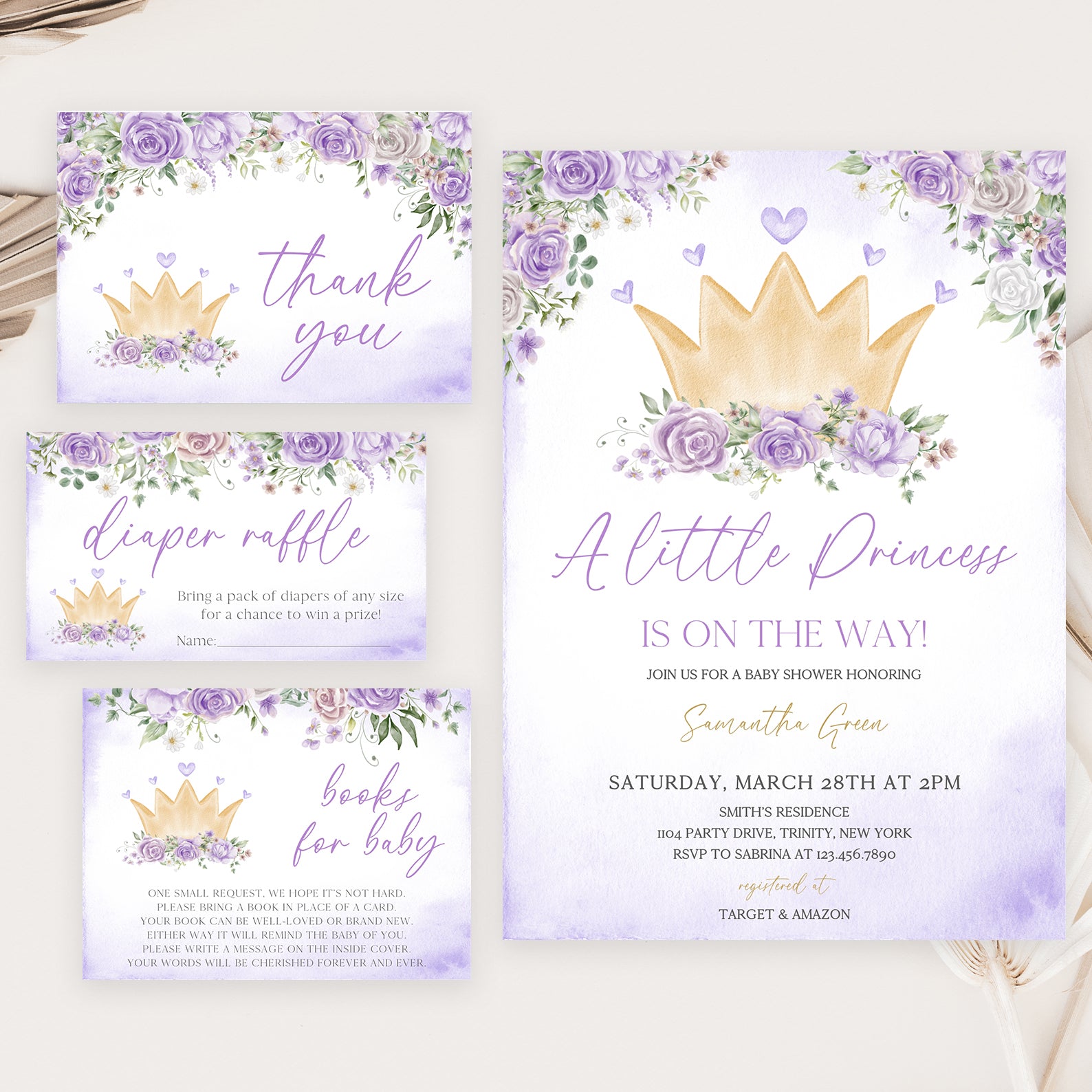- Purchase this Purple Princess Baby Shower Invite Bundle with Crown & Florals template