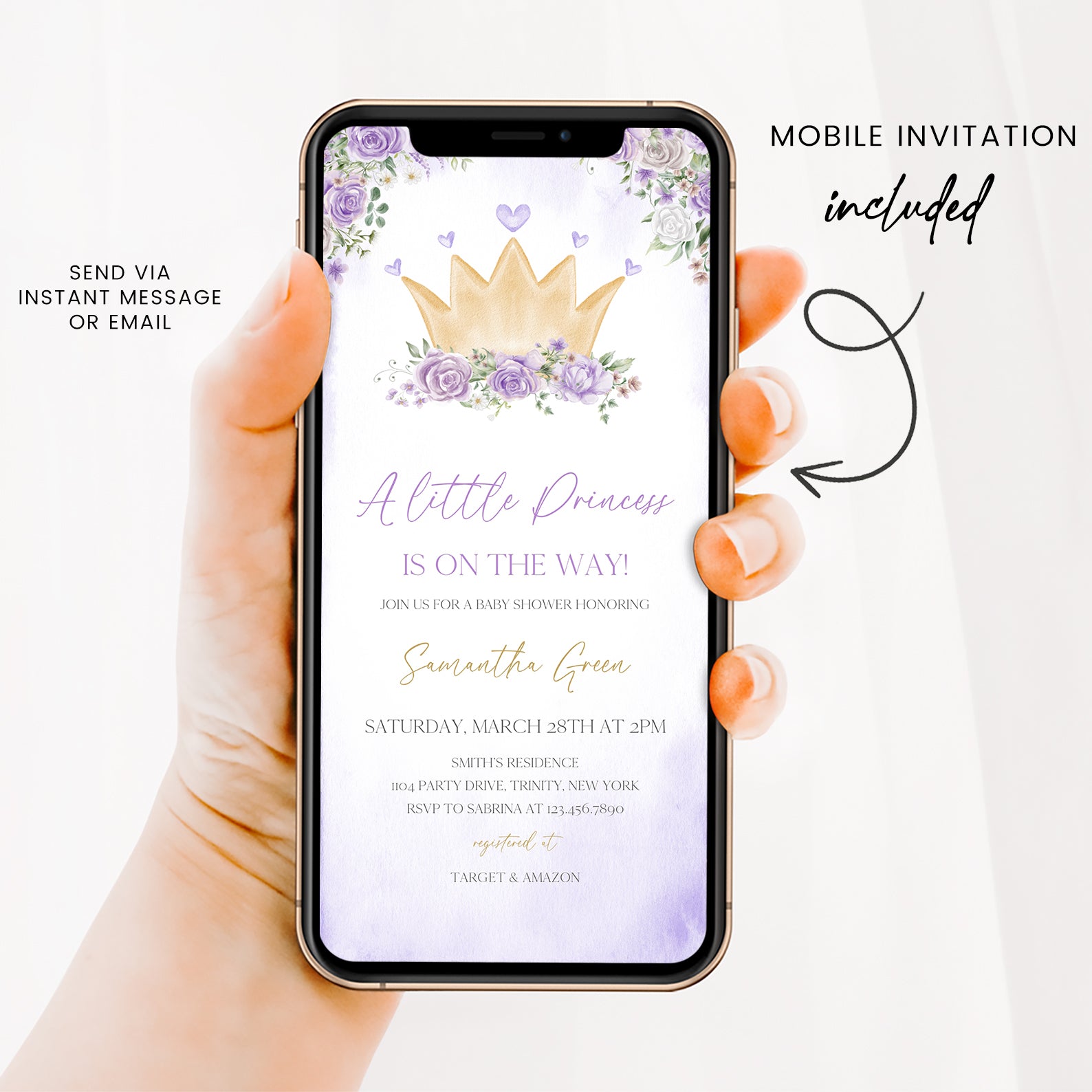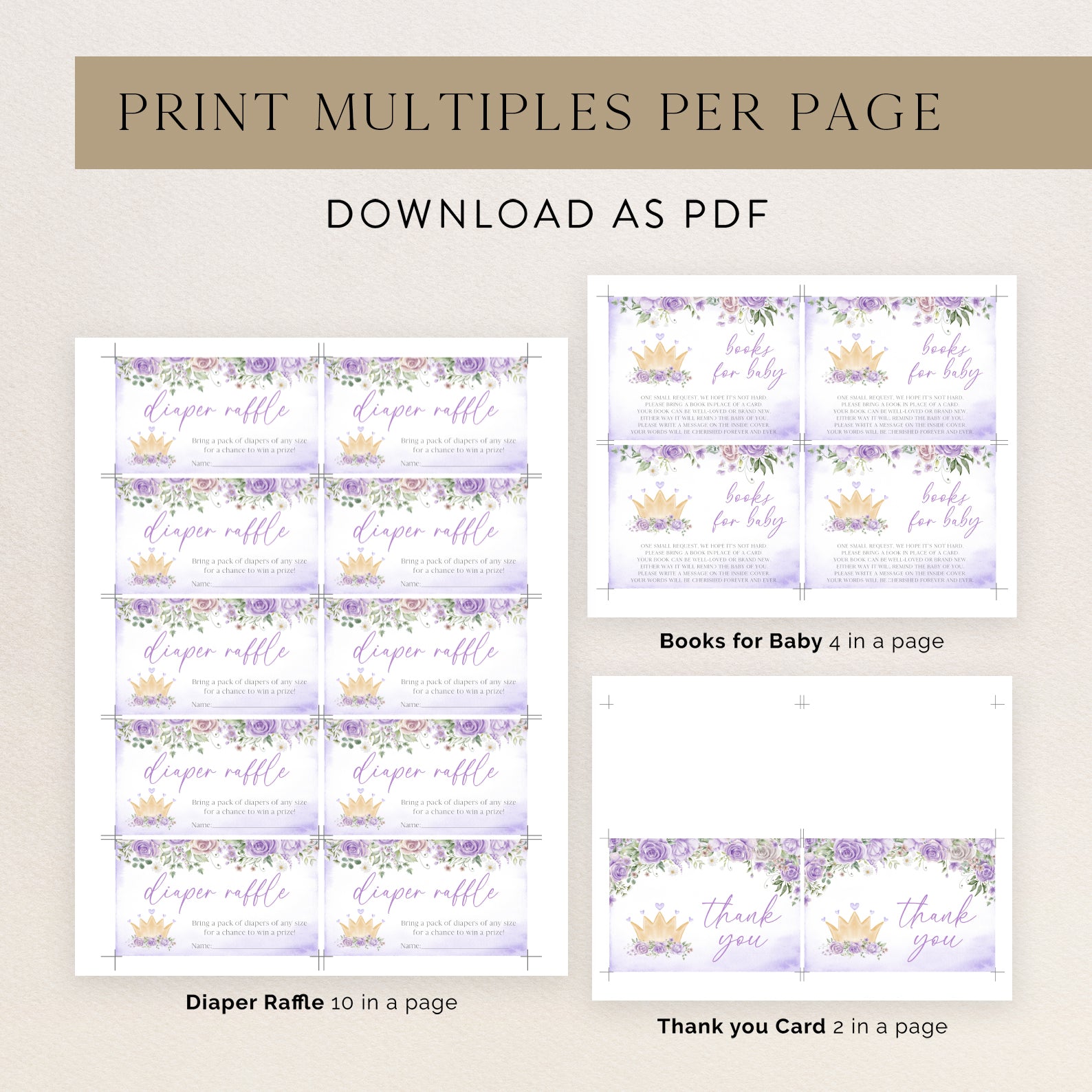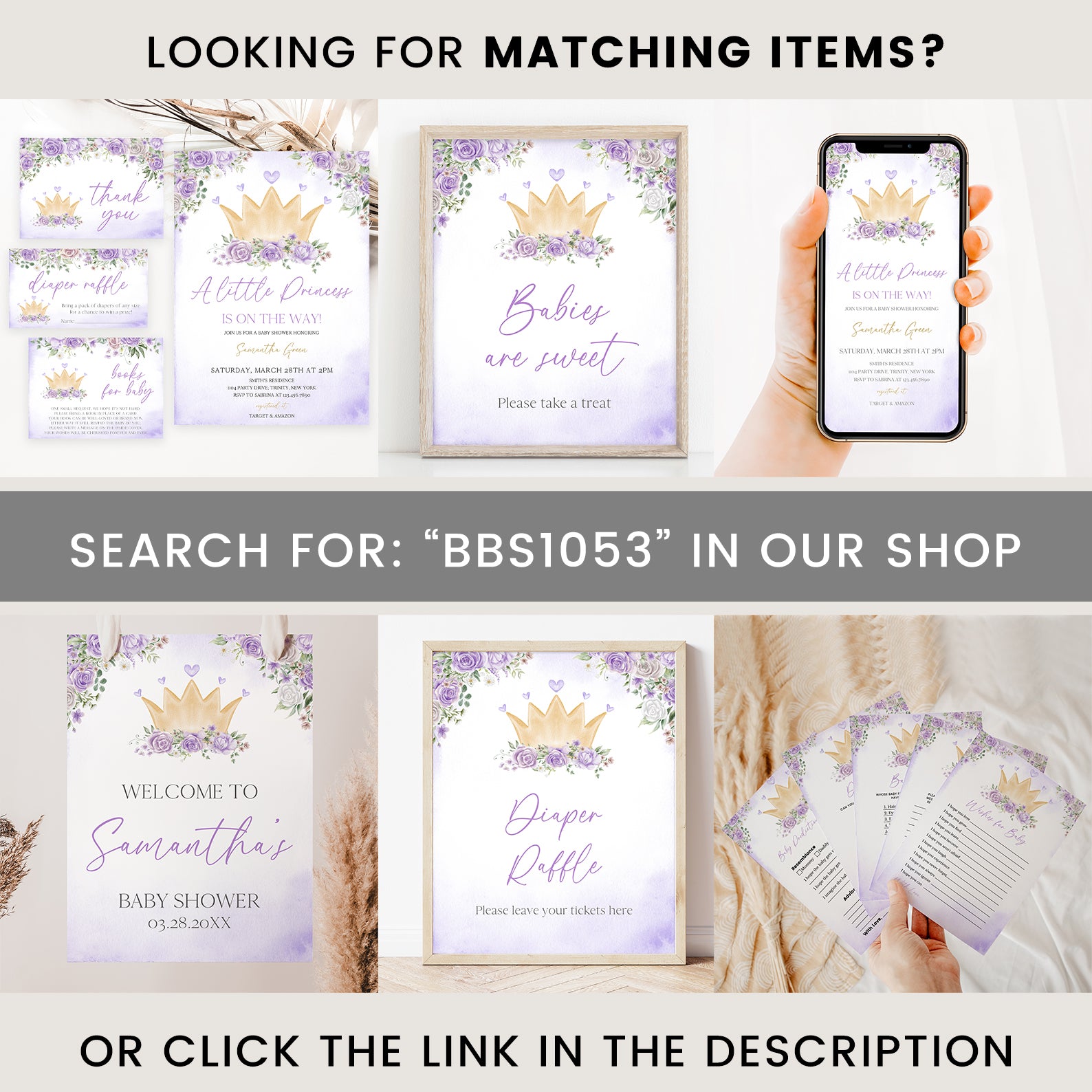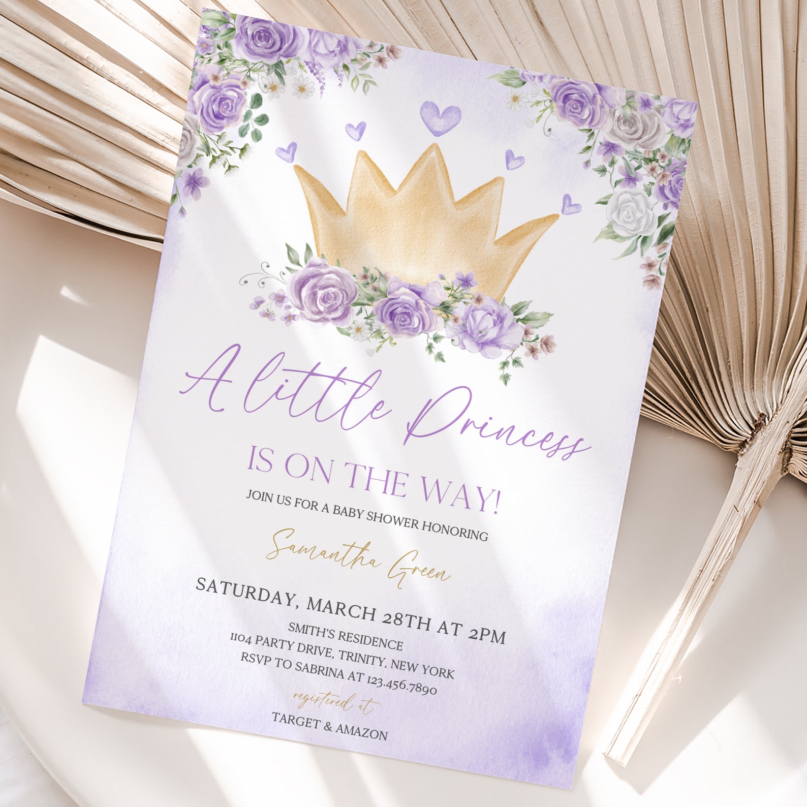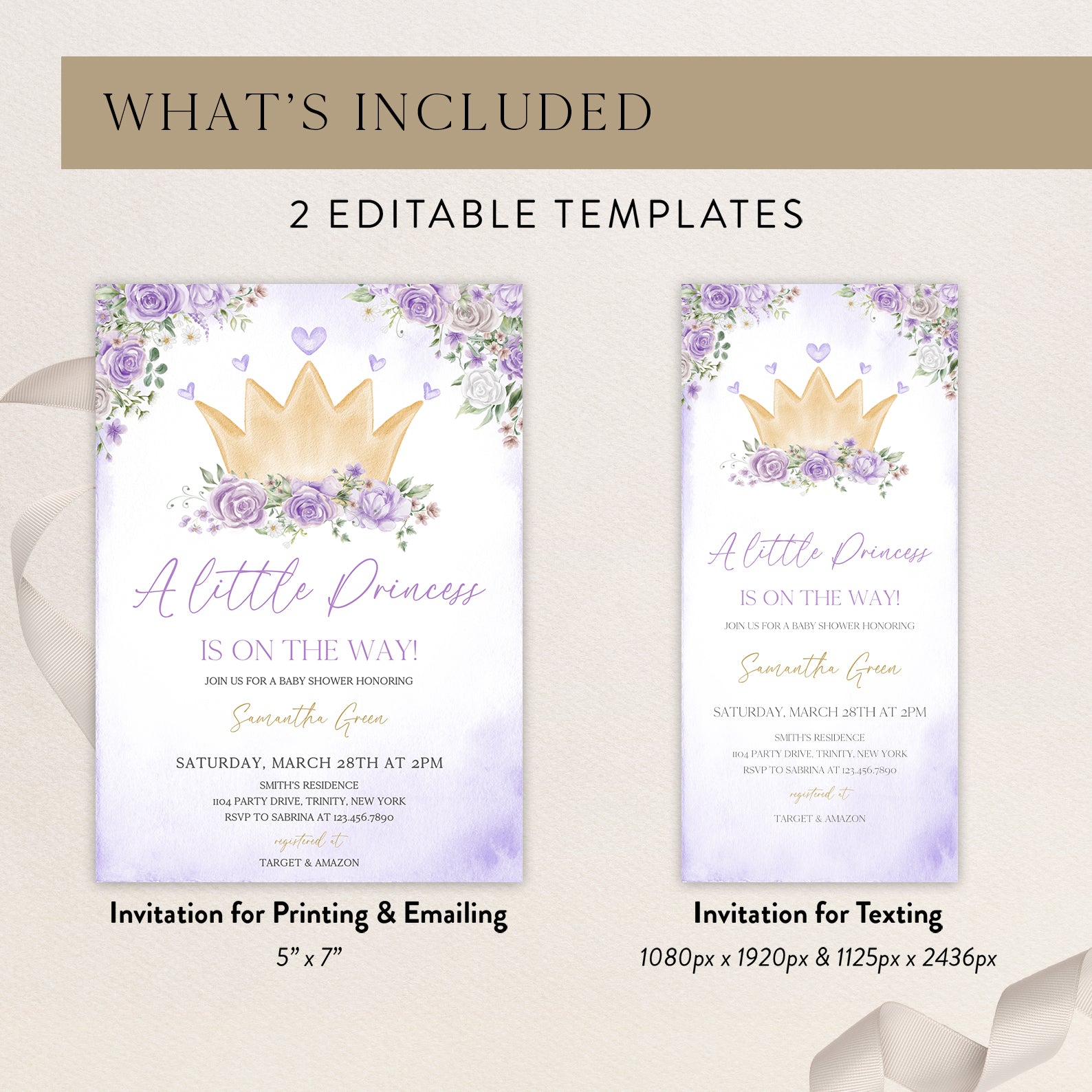 - Purchase this Purple Princess Baby Shower Invite Bundle with Crown & Florals template