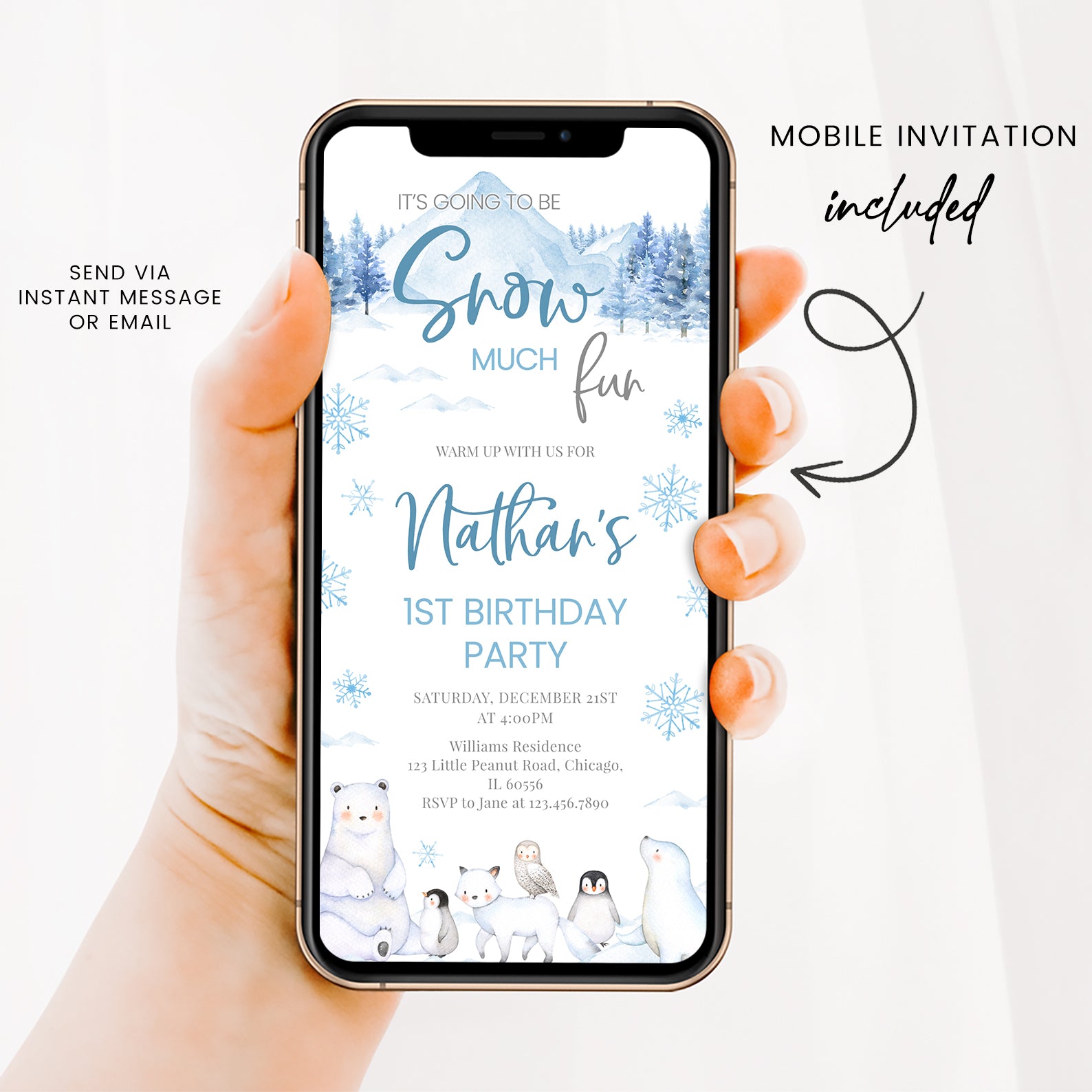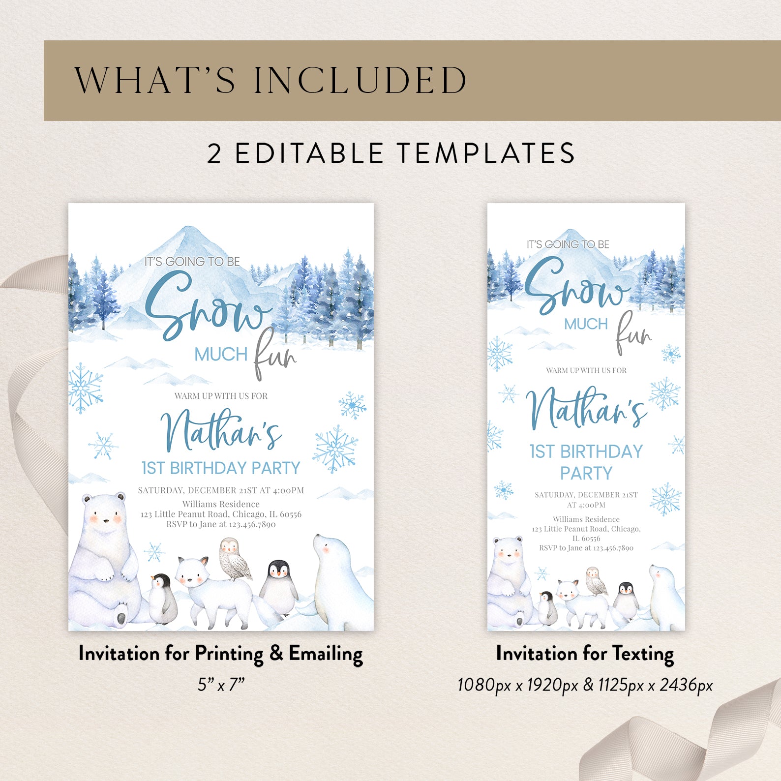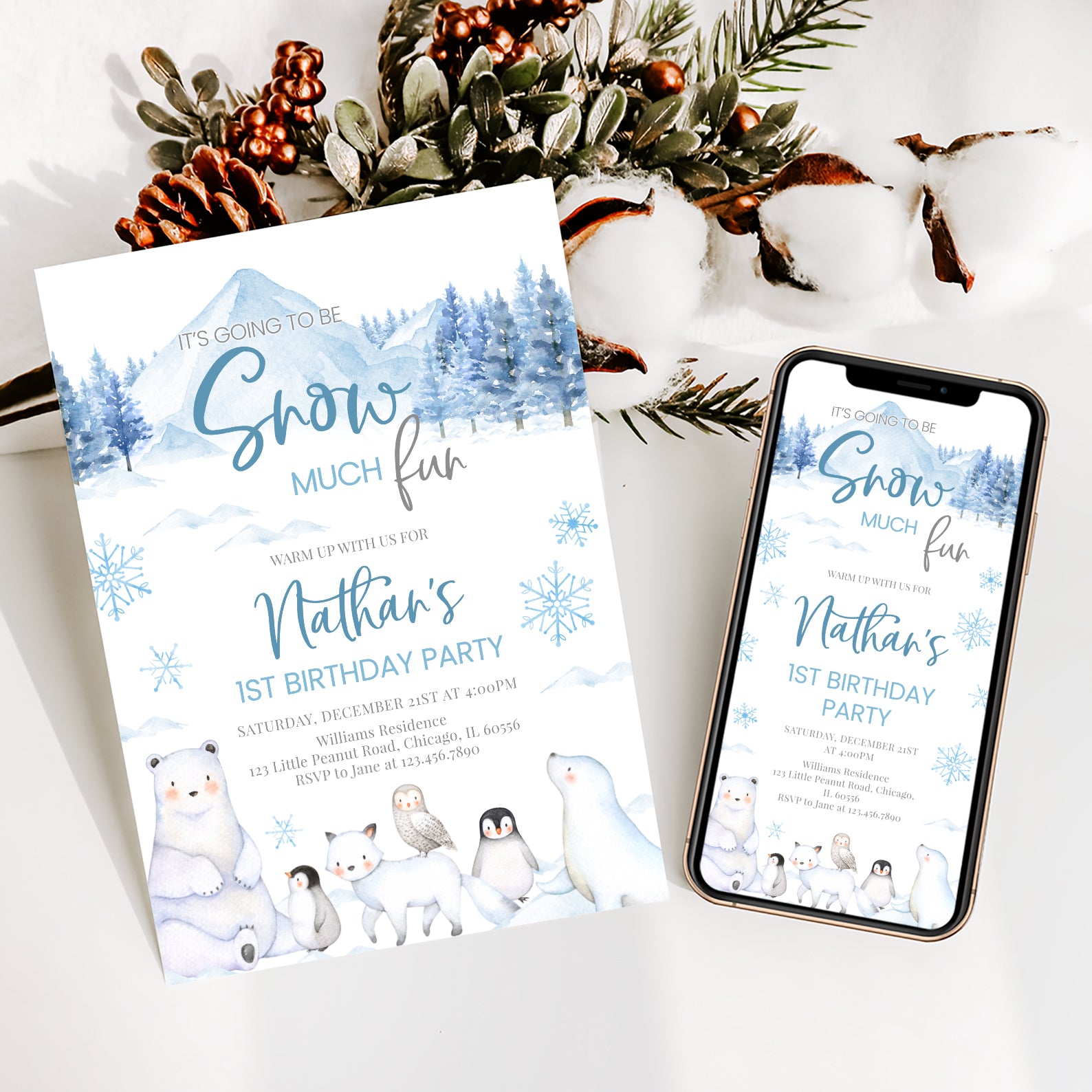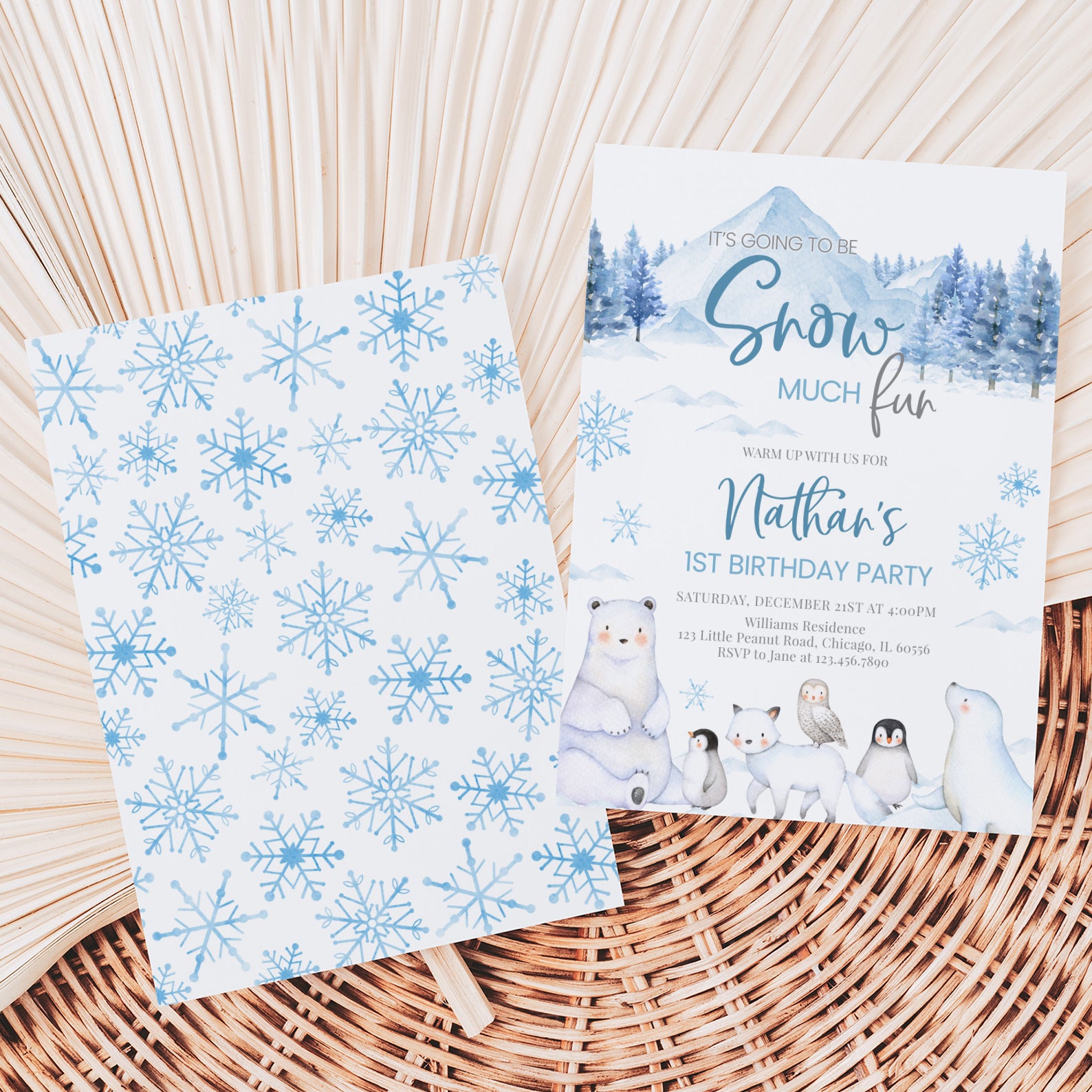 Celebrate your little one's first birthday with our enchanting "Snow Much Fun" digital invitation! Available in charming pink or blue, this arctic-themed design features adorable arctic animals and whimsical snowflakes that perfectly capture the magic of winter. Effortlessly invite friends and family to join in the frosty festivities with a personalized touch that sets the tone for a memorable celebration. Make your child's special day unforgettable with this delightful invitation that promises fun and joy!