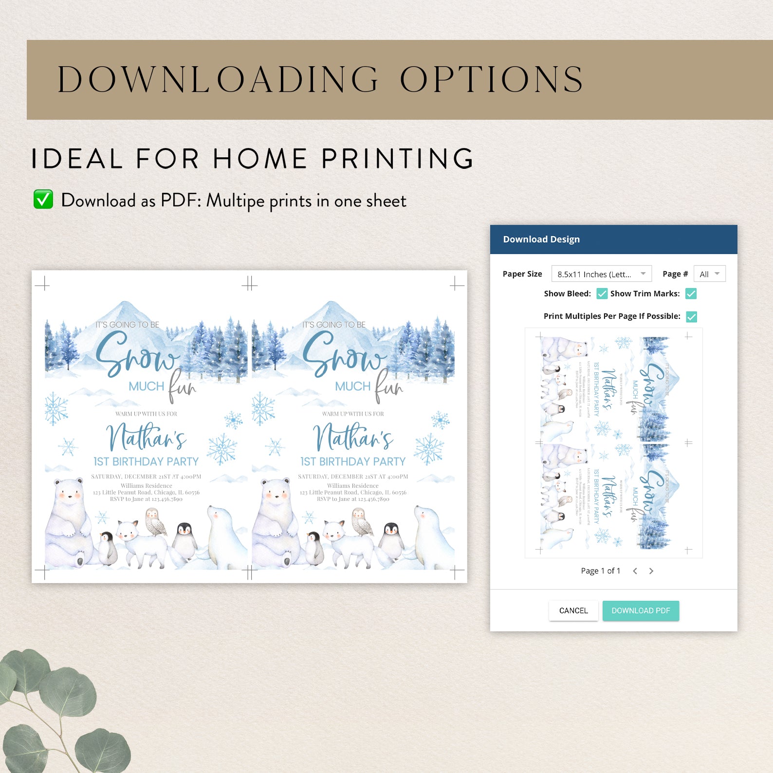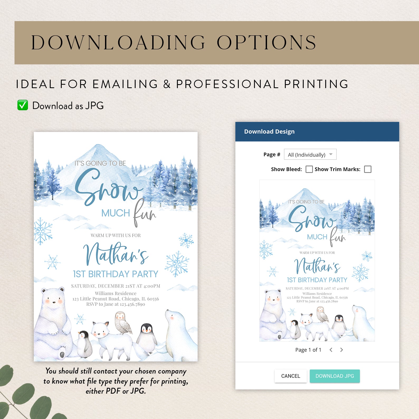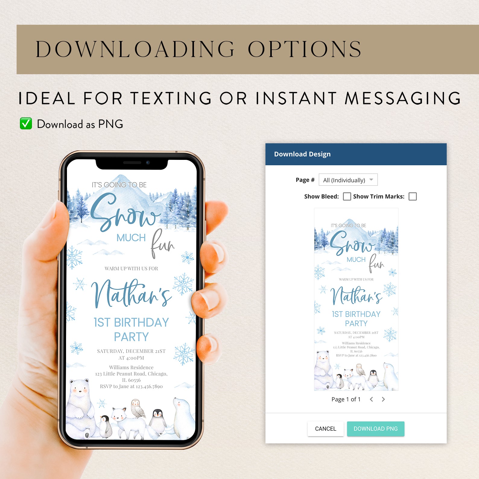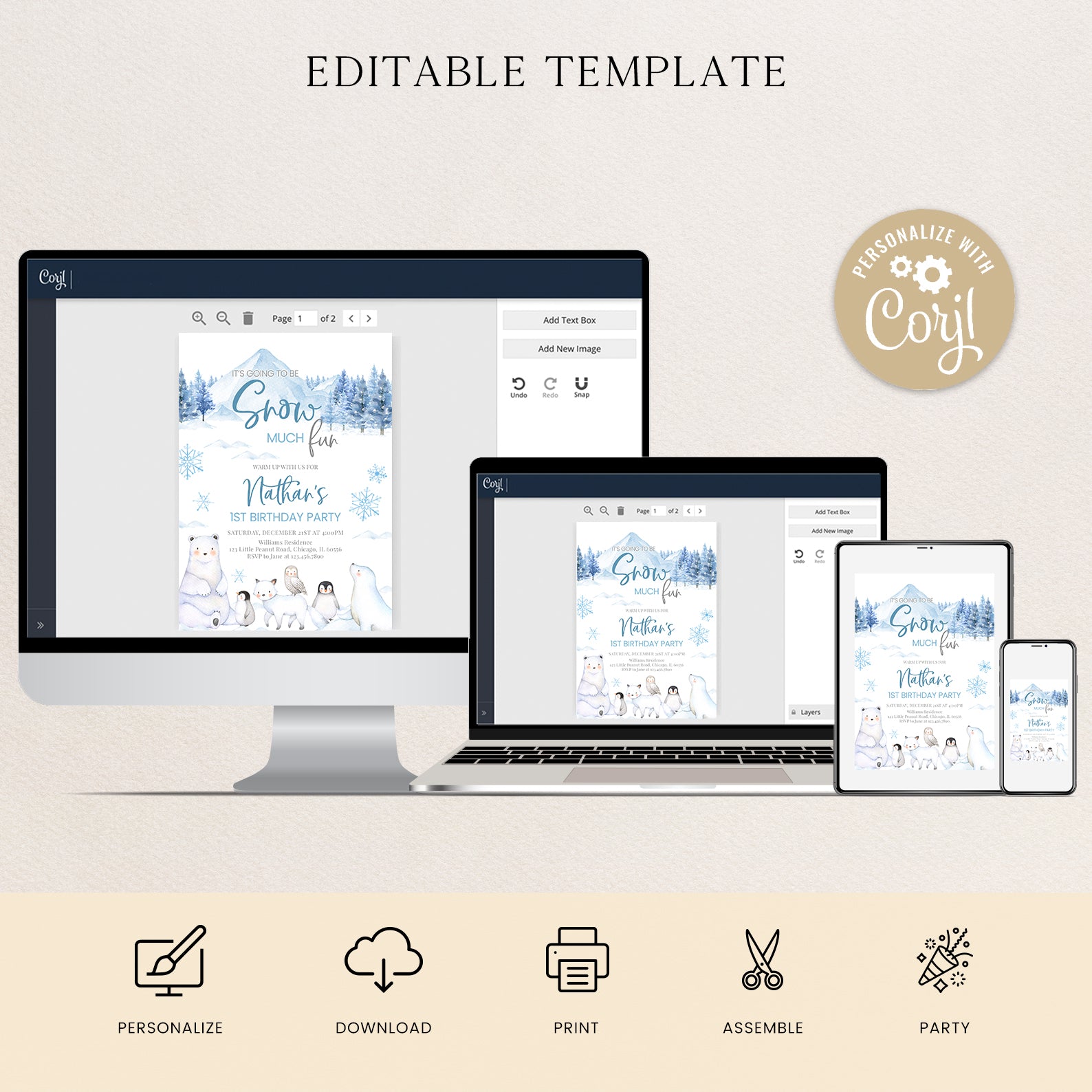 Celebrate your little one's first birthday with our enchanting "Snow Much Fun" digital invitation! Available in charming pink or blue, this arctic-themed design features adorable arctic animals and whimsical snowflakes that perfectly capture the magic of winter. Effortlessly invite friends and family to join in the frosty festivities with a personalized touch that sets the tone for a memorable celebration. Make your child's special day unforgettable with this delightful invitation that promises fun and joy!