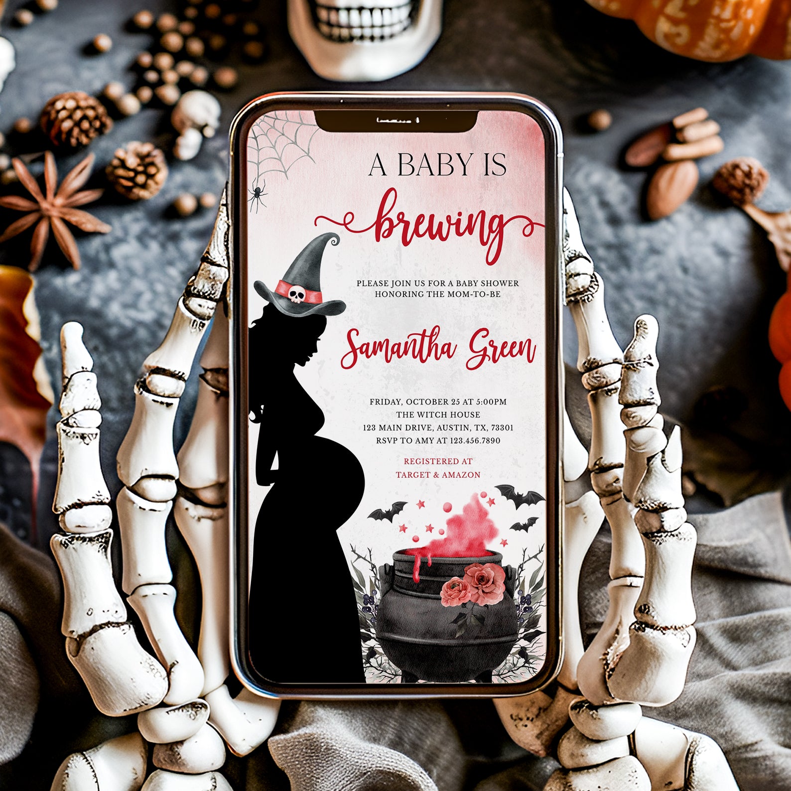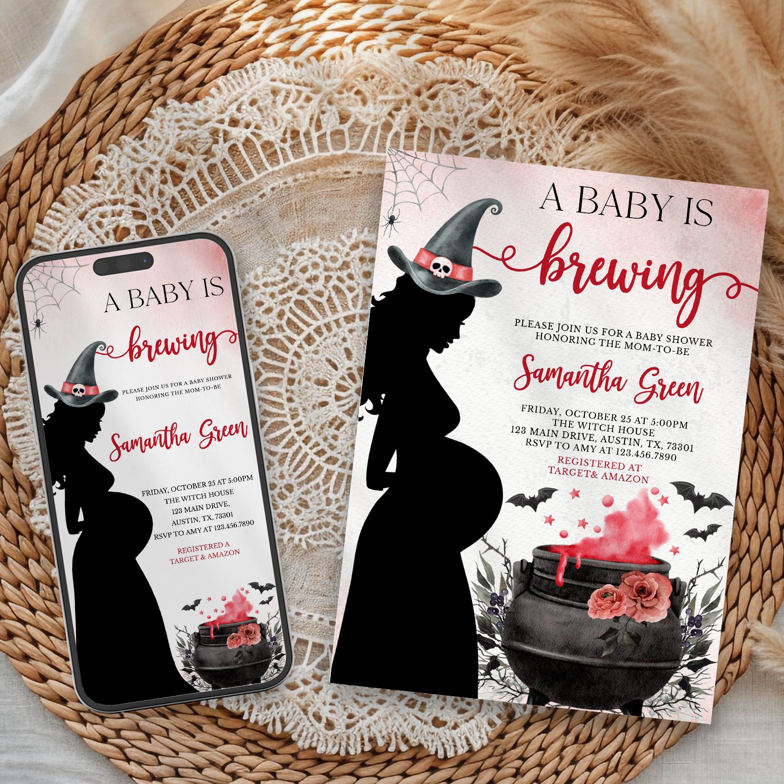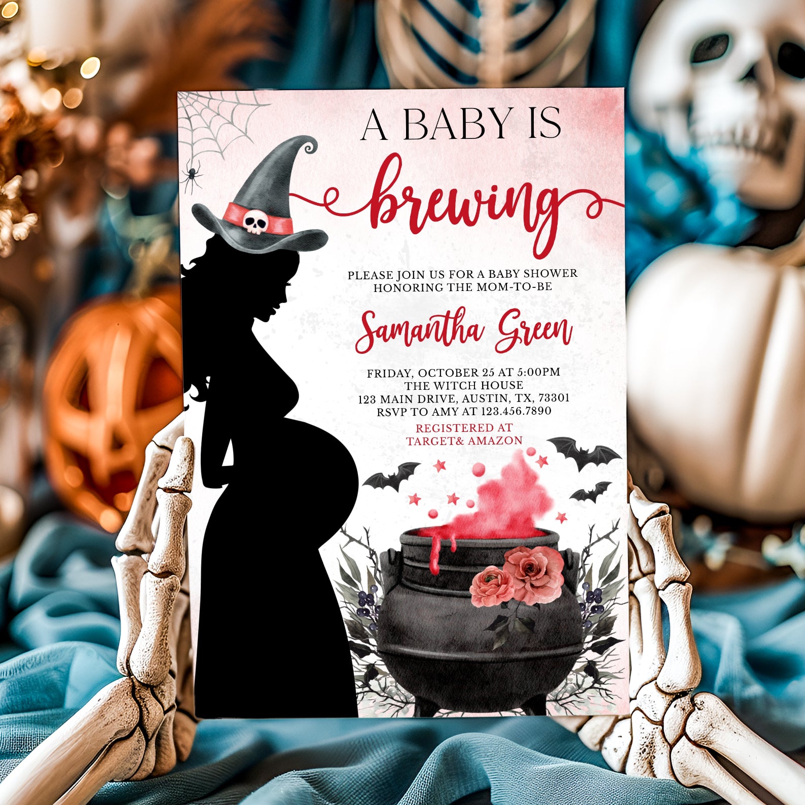 Cast a spell for your little one’s arrival with our enchanting "Baby is Brewing" digital invitation! Available in vibrant colors like red, green, purple, orange, blue, and pink, this whimsical design features a playful spider and web at the top, alongside a charming pregnant witch brewing a potion in her cauldron. Adorned with roses and flying bats, the potion-themed background adds a magical touch, making it the perfect invite for your spooky baby shower!
