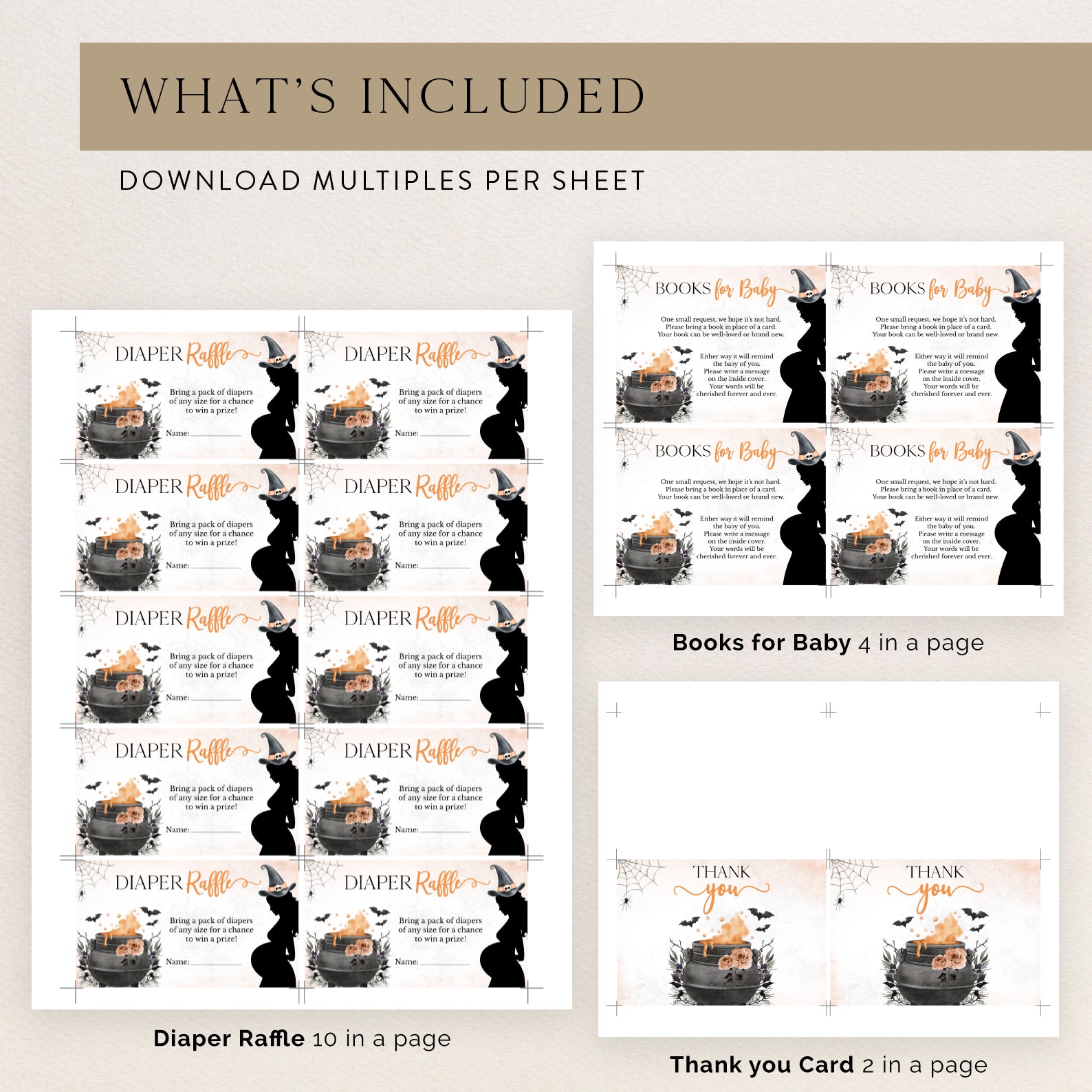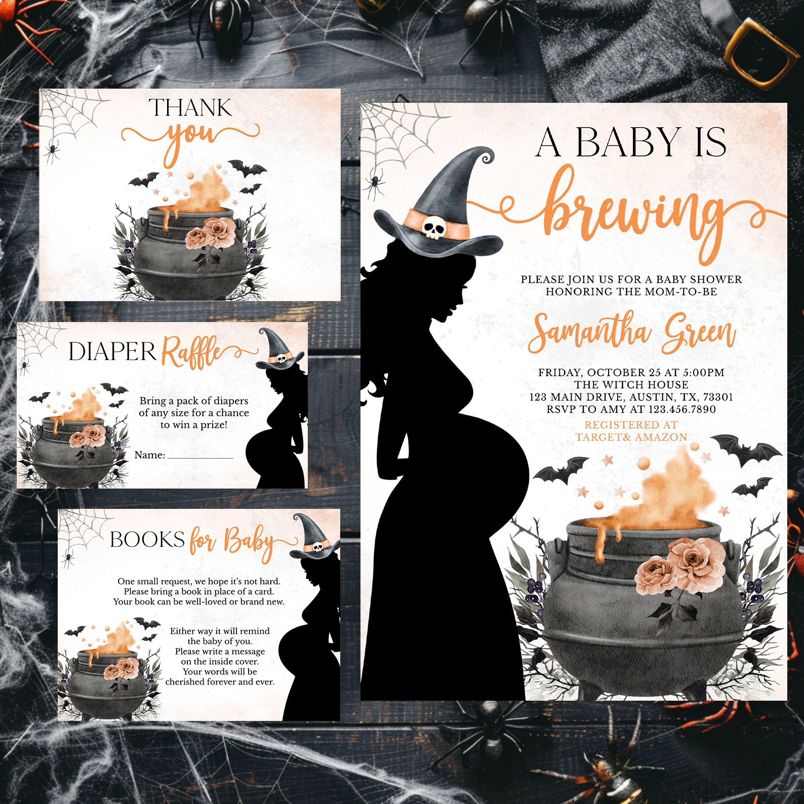 - Purchase this Spellbinding Orange Baby Shower Invite Bundle: Pregnant Witch & Cauldron template