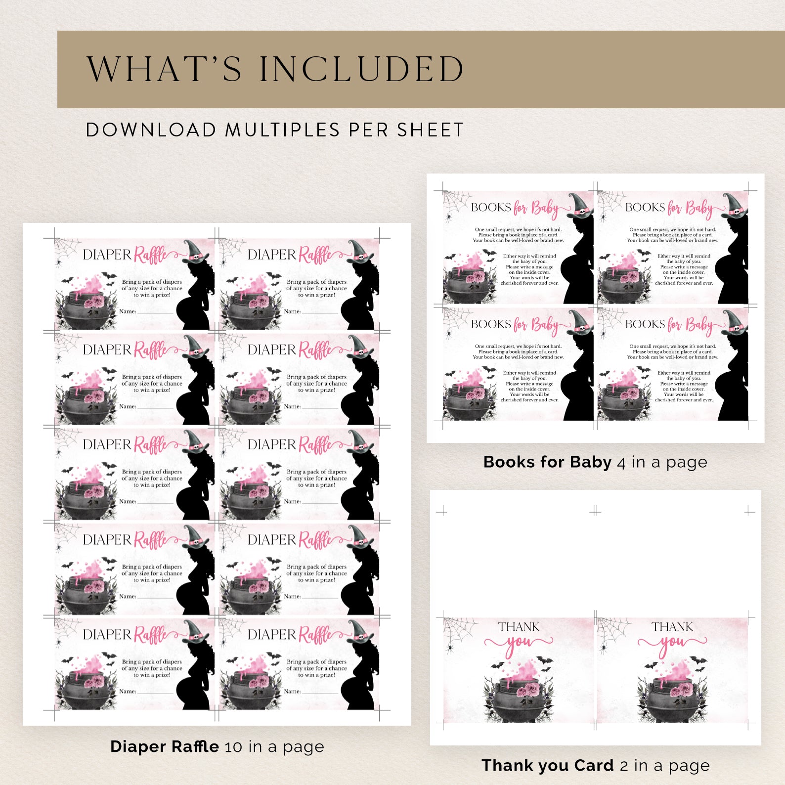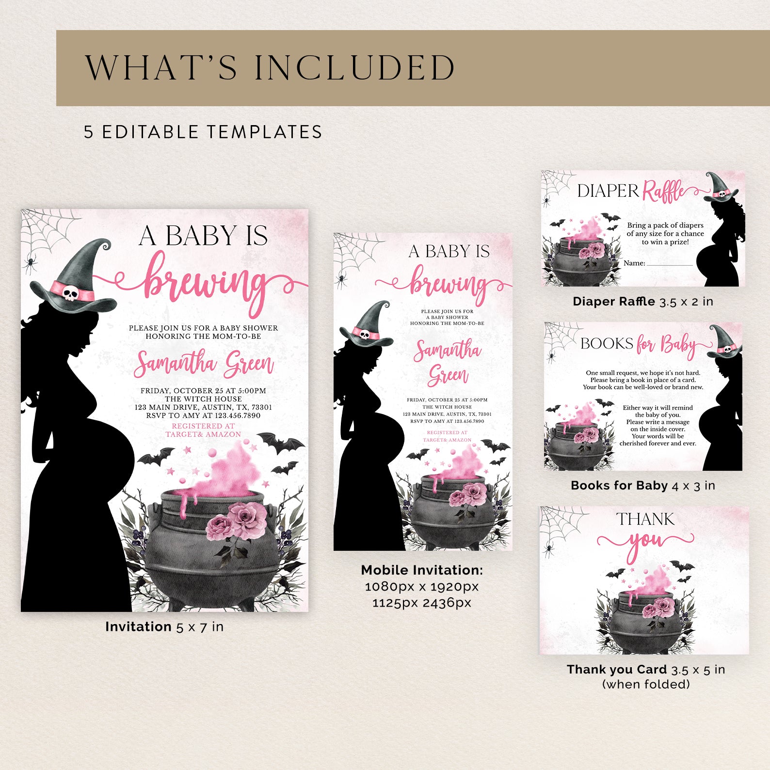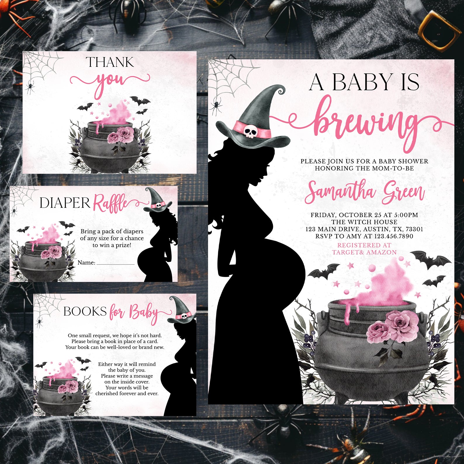 - Purchase this Spellbinding Pink Baby Shower Invite Bundle: Pregnant Witch & Cauldron template