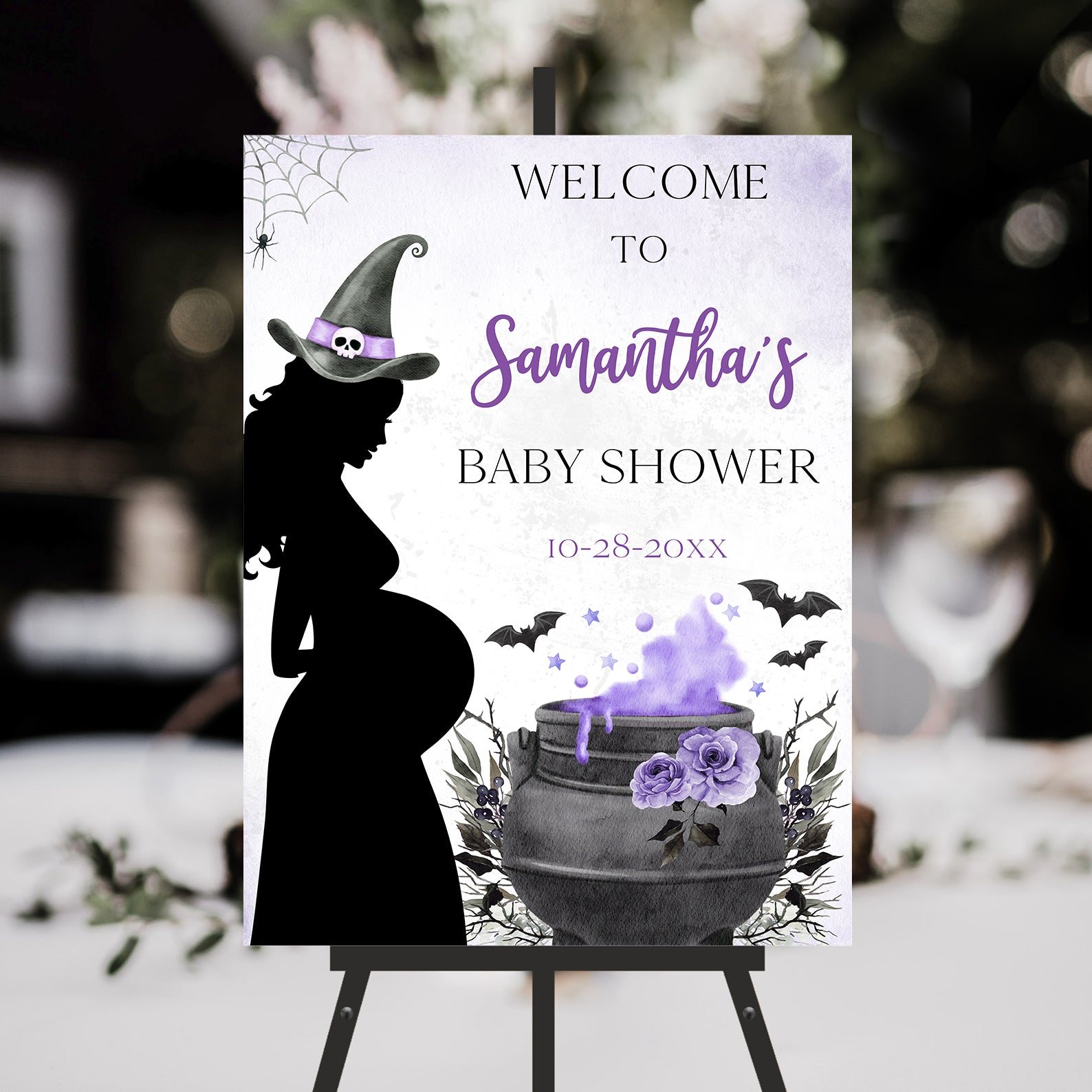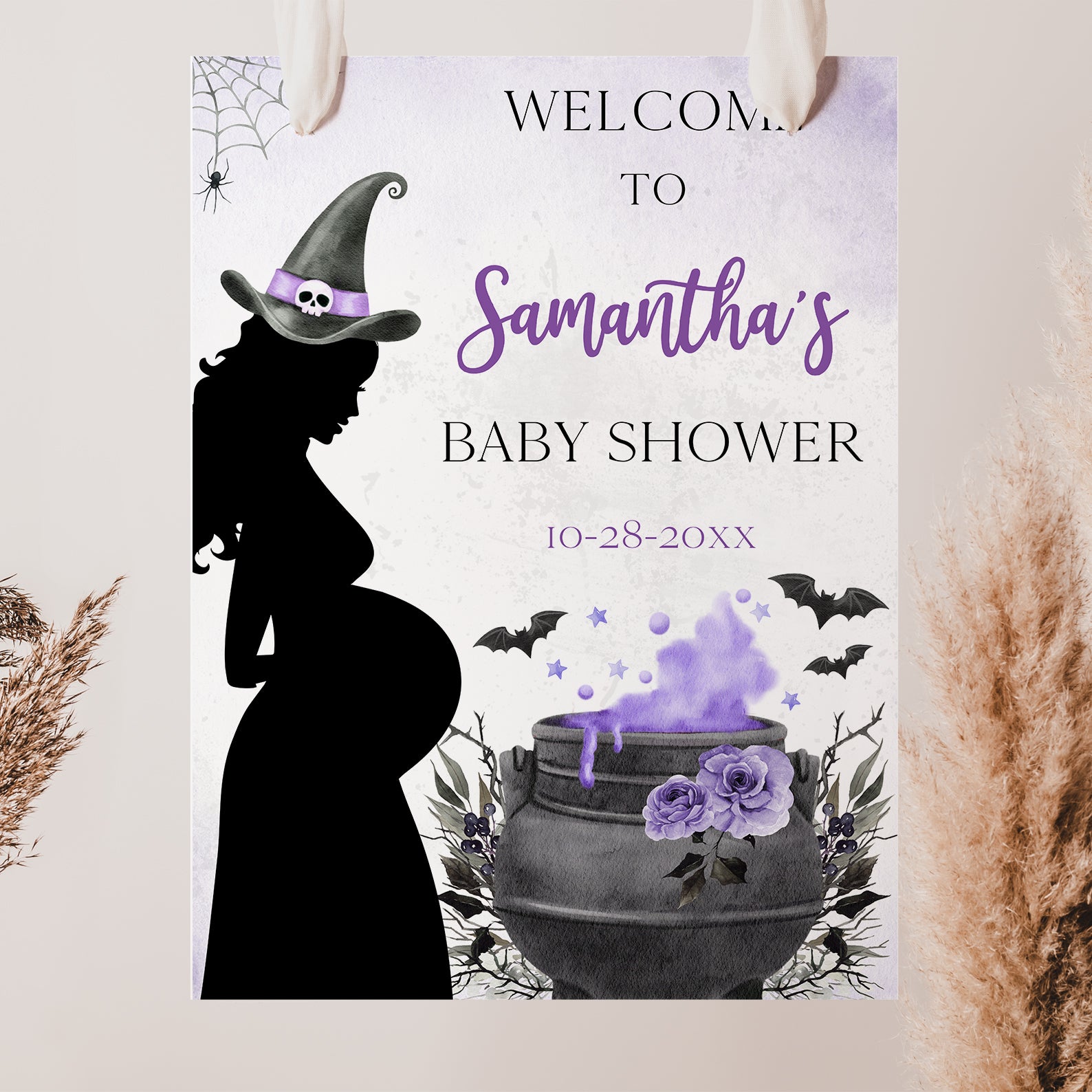 - Purchase this Spellbinding Purple Baby Shower Welcome Sign: Pregnant Witch & Cauldron template