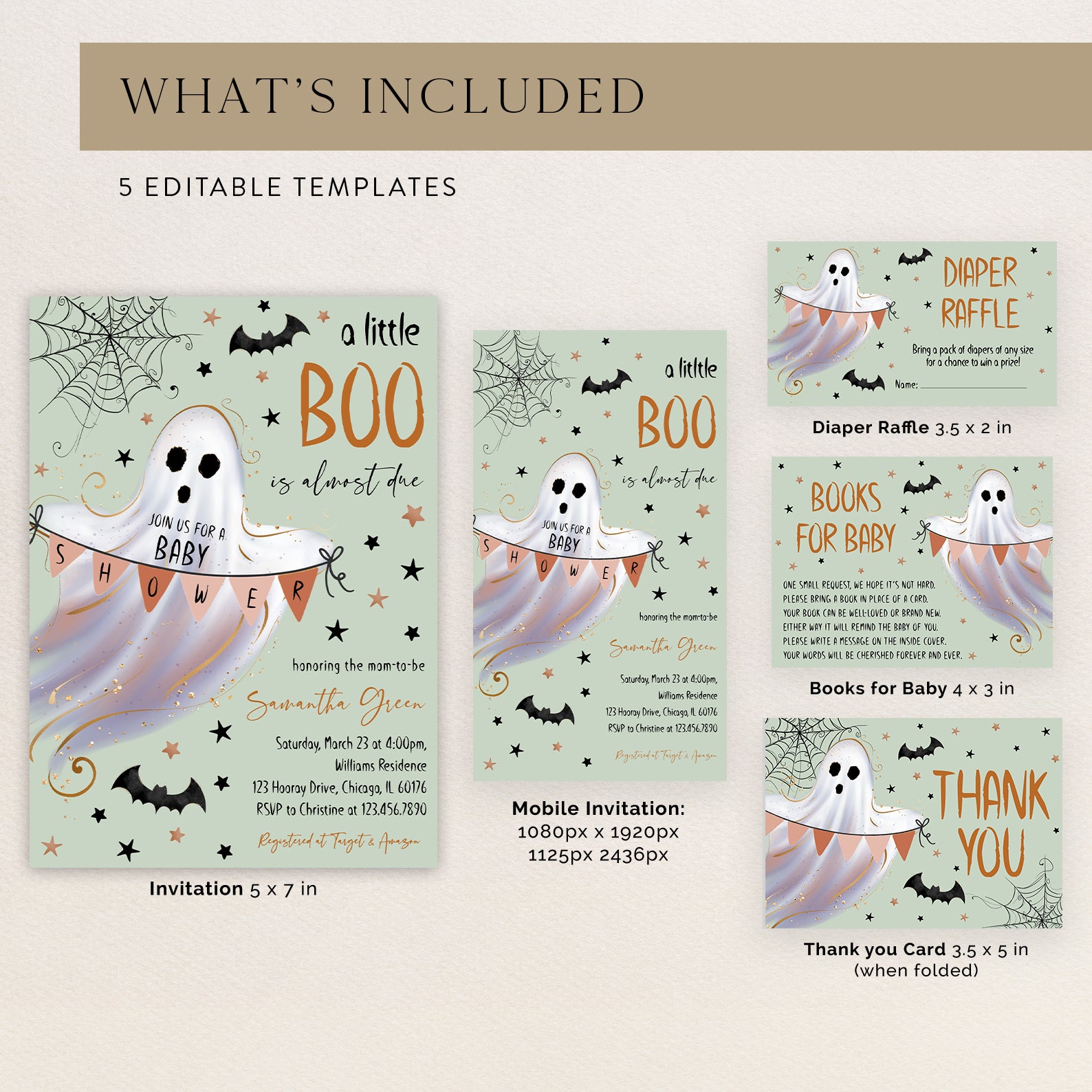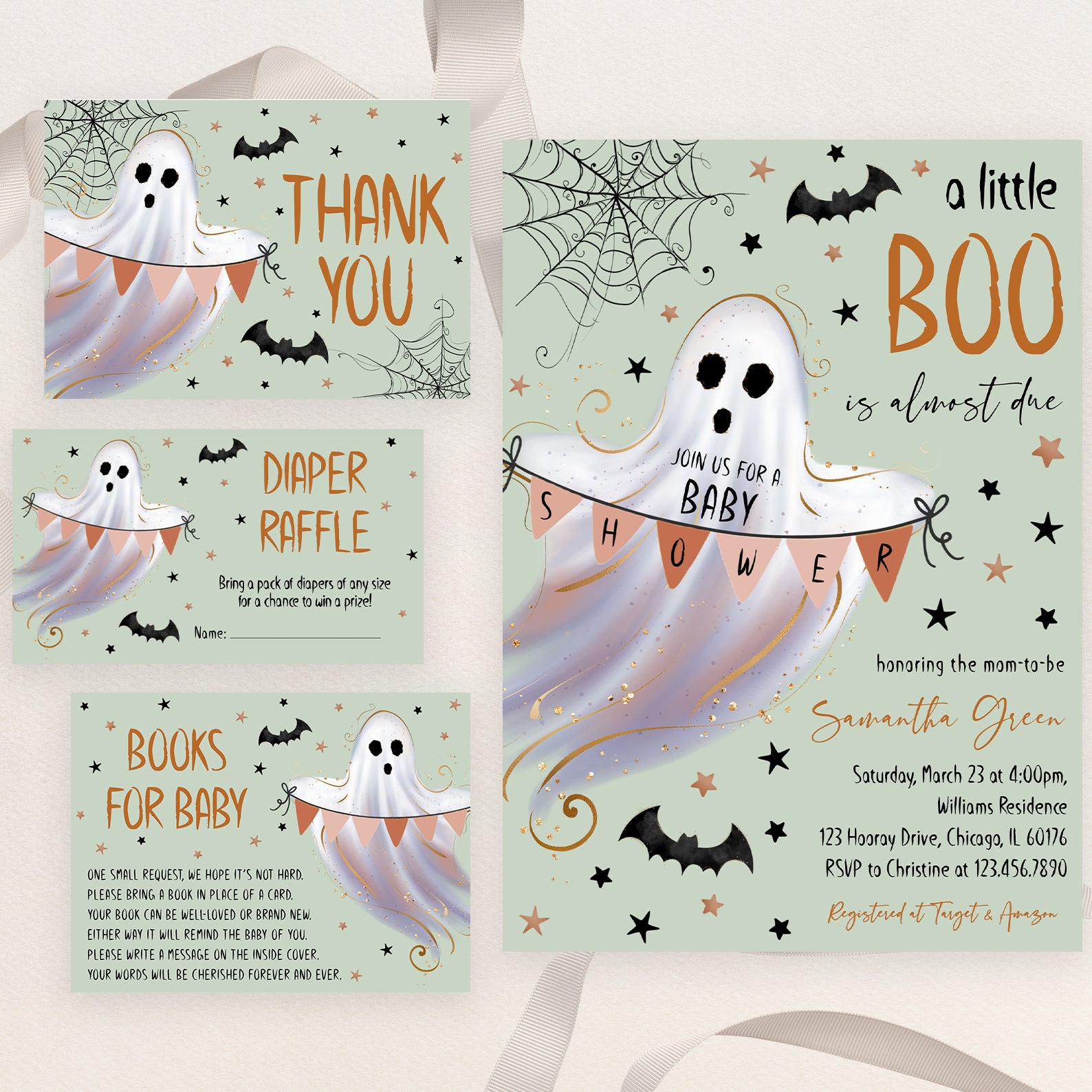Invite your guests to a ghoulishly delightful celebration with our "A Little Boo is Almost Due" invitation bundle! Perfect for a Halloween-themed baby shower, this set features a whimsical ghost design that adds a playful touch to your festivities.