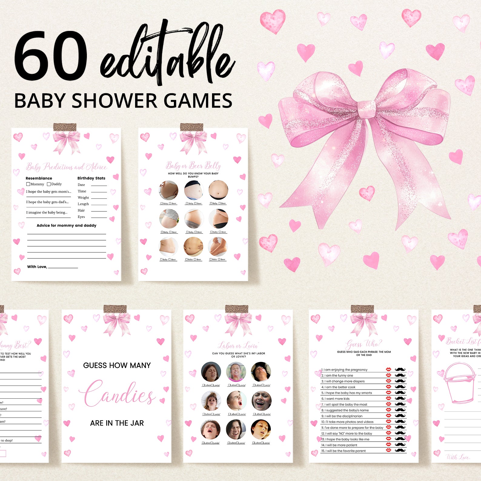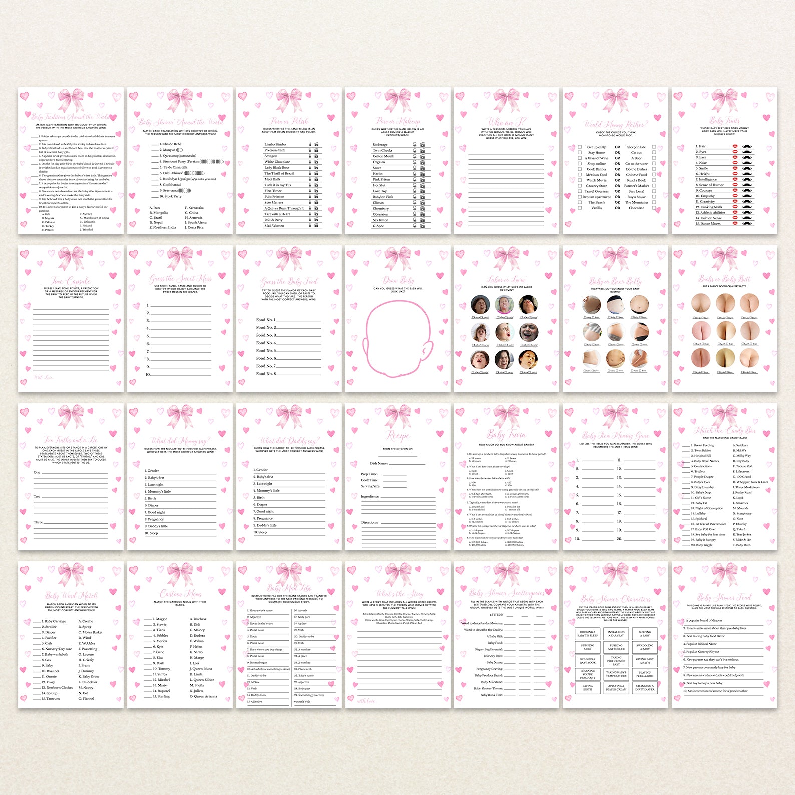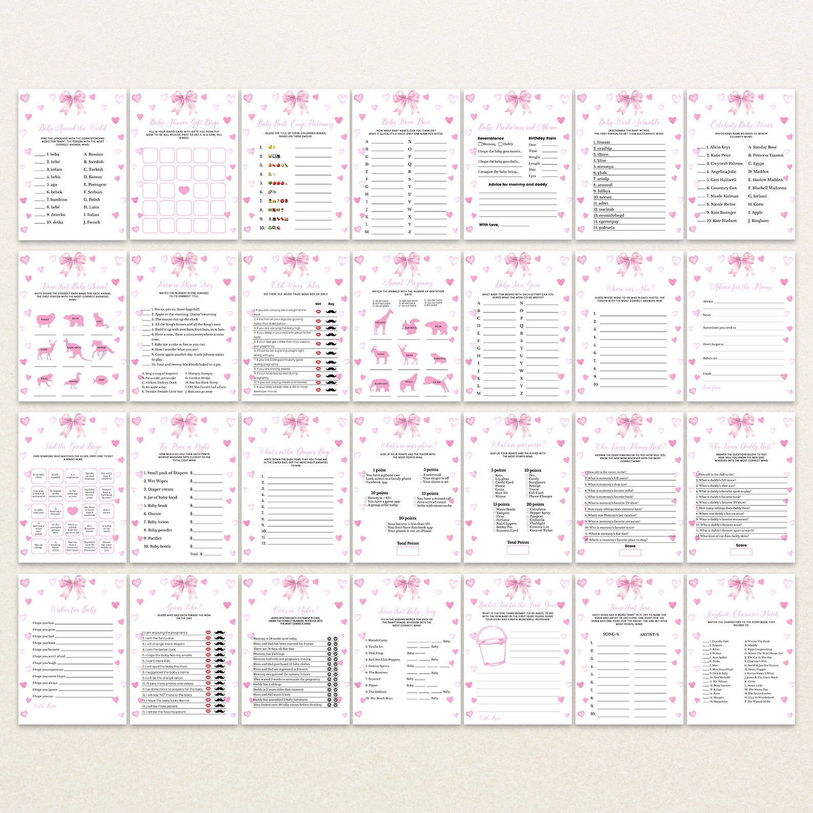 Celebrate your little sweetheart in style with this lovely bundle of 60 editable baby shower games, designed to complement a soft and heartwarming spring theme. Featuring delicate pink ribbons, playful hearts, and a charming layout, this collection brings a perfect blend of elegance and joy to your celebration. Each game is fully customizable, making it easy to tailor the details to match your event. Whether you're hosting an intimate gathering or a lively party, this bundle adds fun, laughter, and heartfelt moments to your baby shower.